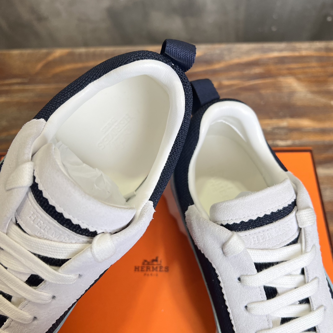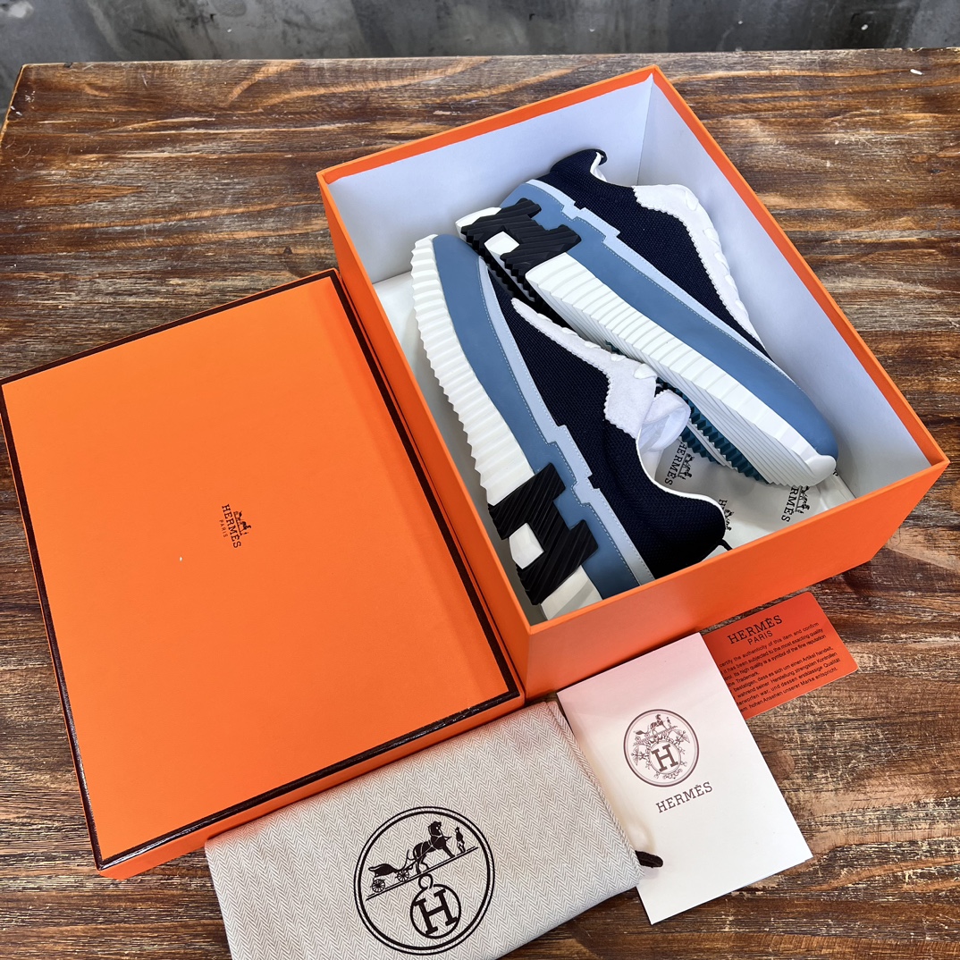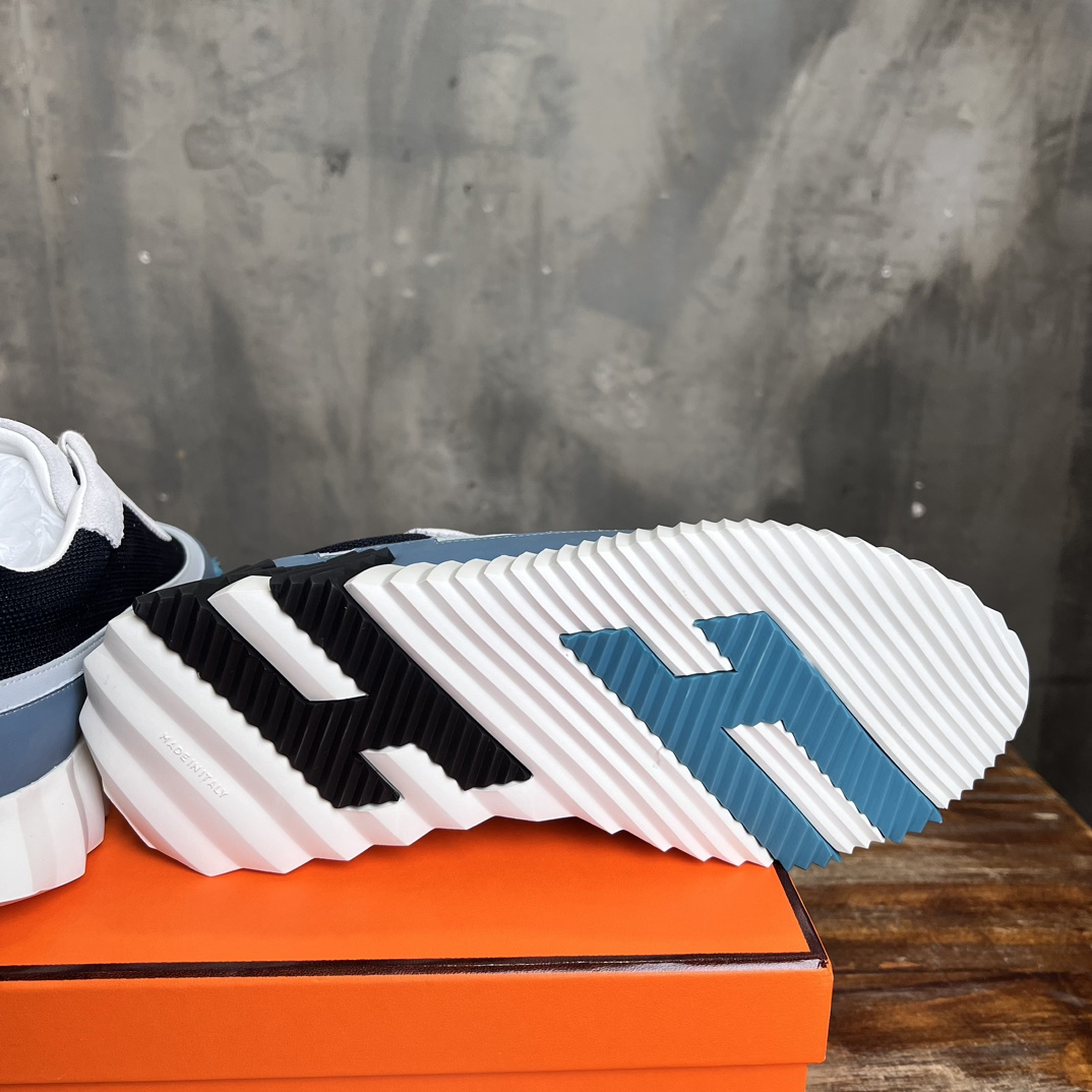 Design: This sneaker features a stylish patchwork design, cleverly combining cashmere and calfskin for a modern urban look. The iconic Hermès “H” logo adorns the side.