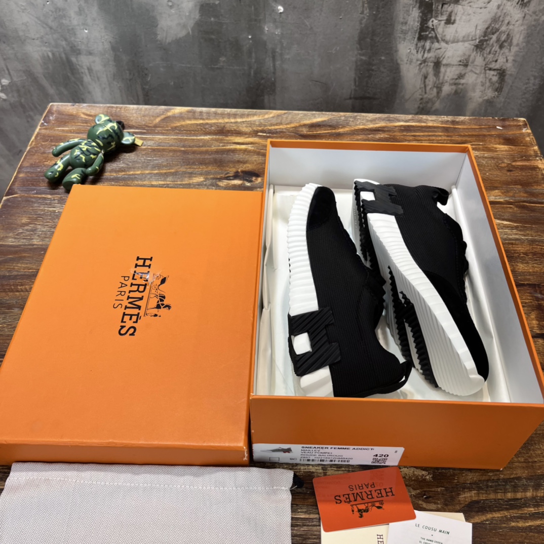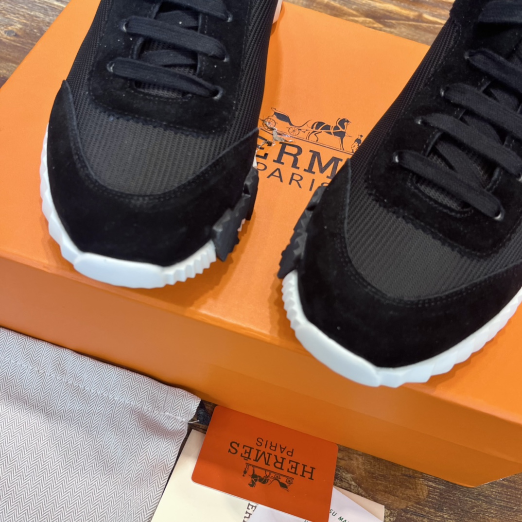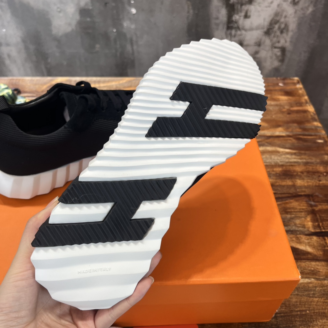 Design: This sneaker features a stylish patchwork design, cleverly combining calfskin and cashmere leather for a modern urban look. The iconic Hermès “H” logo adorns the side.