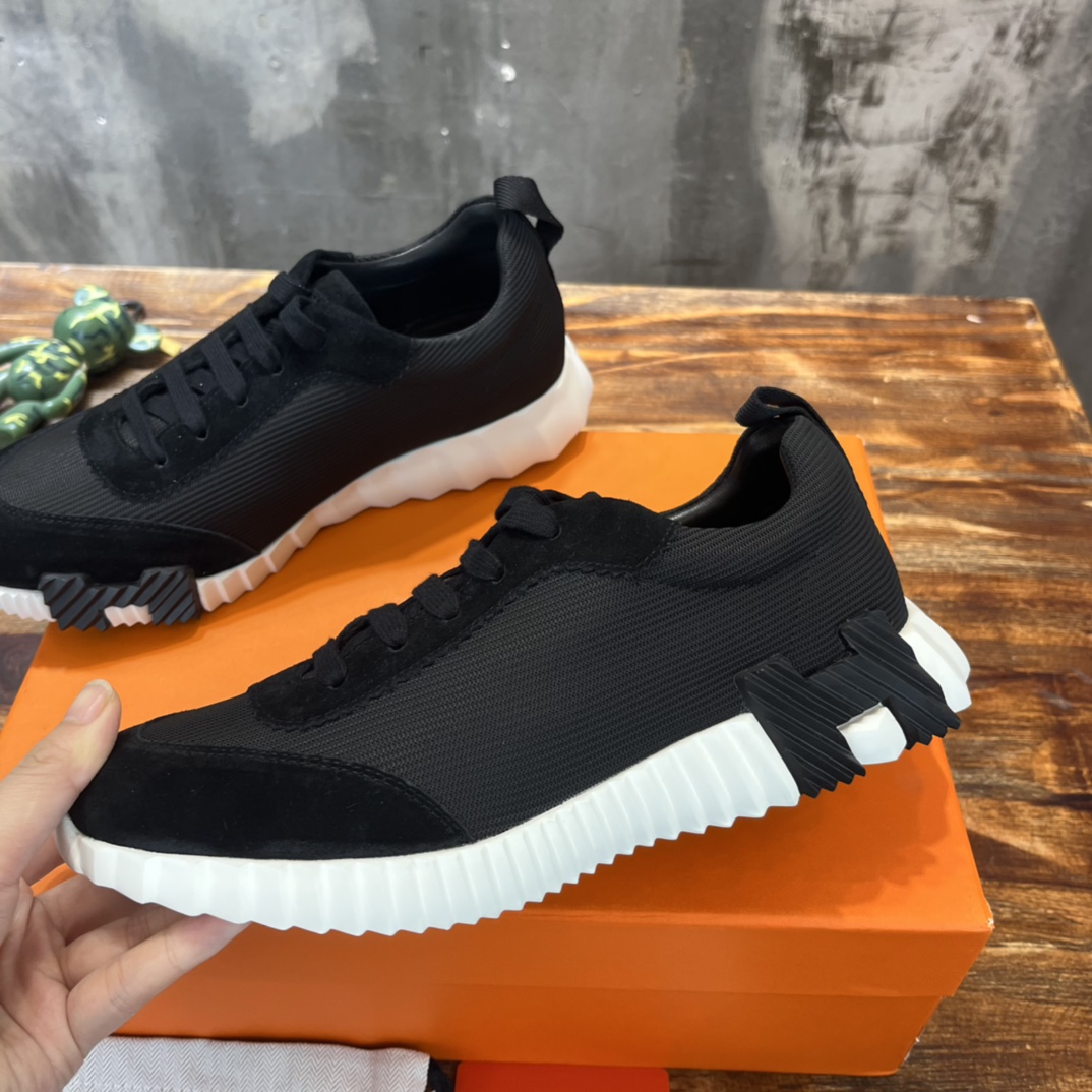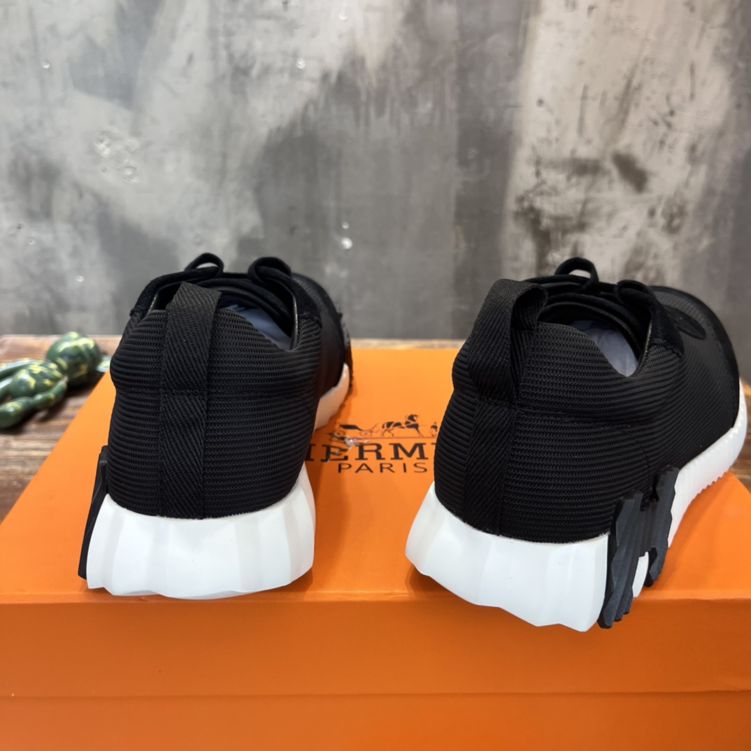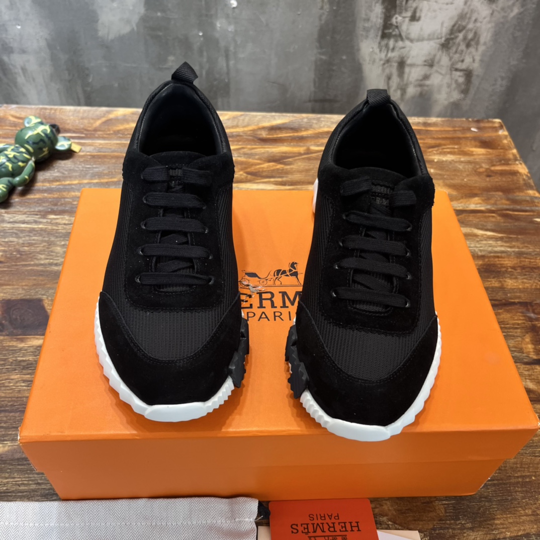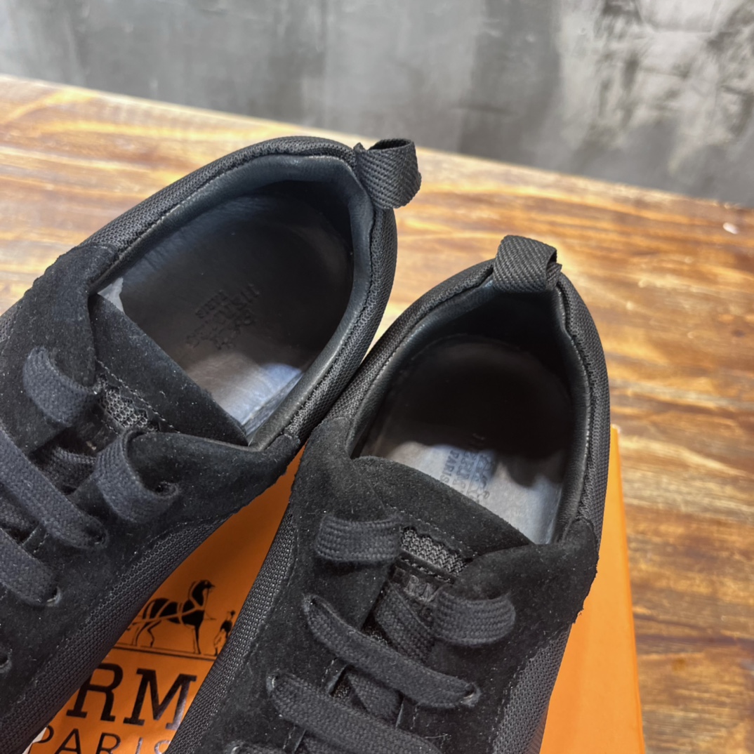 Design: This sneaker features a stylish patchwork design, cleverly combining calfskin and cashmere leather for a modern urban look. The iconic Hermès “H” logo adorns the side.