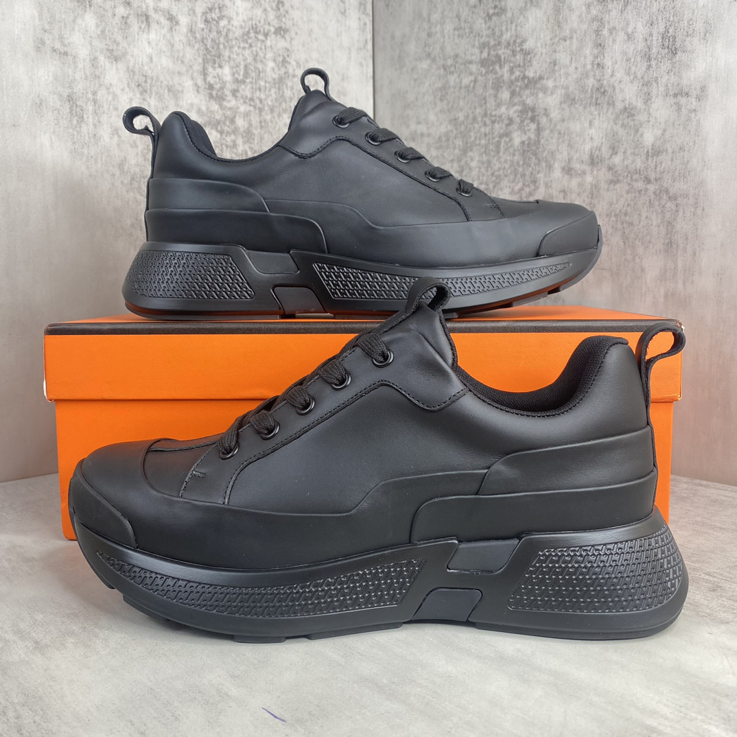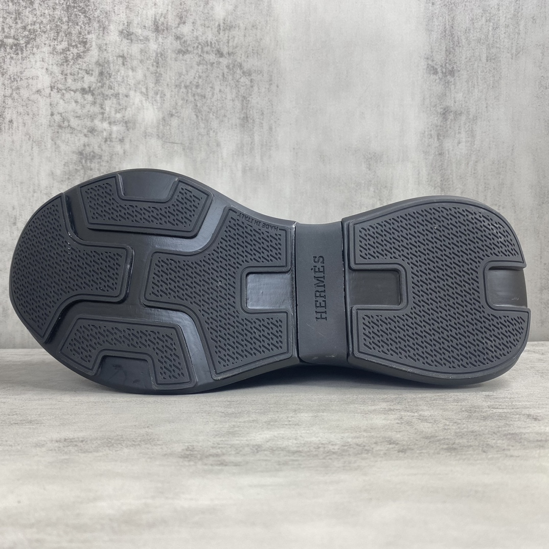 Design: These sneakers feature a stylish patchwork design, cleverly combining black calfskin and cashmere leather for a modern urban look. The iconic Hermès “H” logo adorns the side.