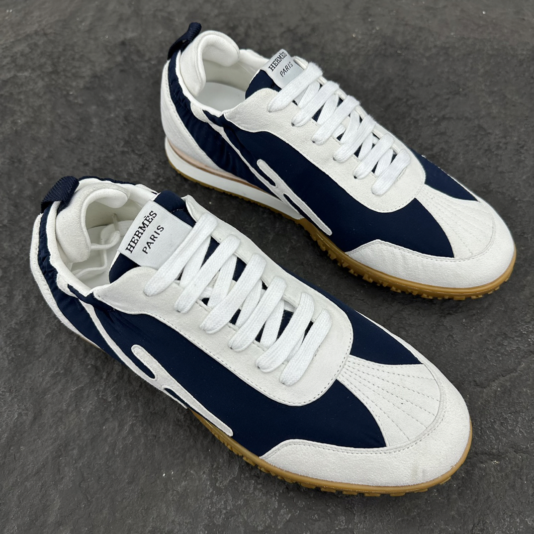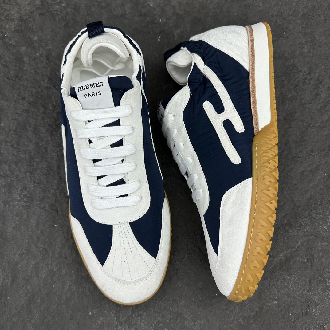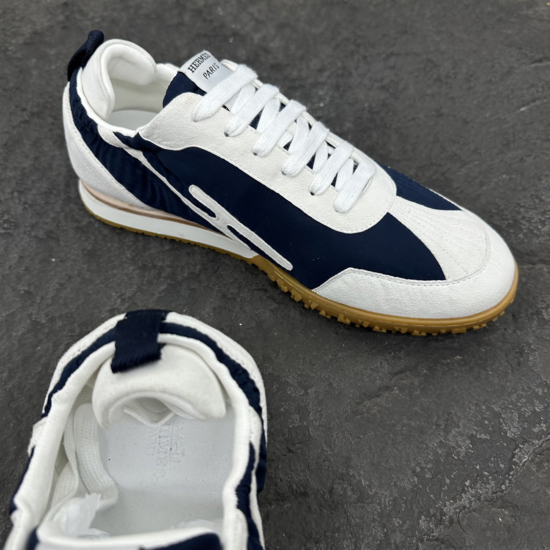 Design: This sneaker features a stylish patchwork design, combining retro and urban styles. The iconic Hermès “H” logo adorns the side of the shoe.