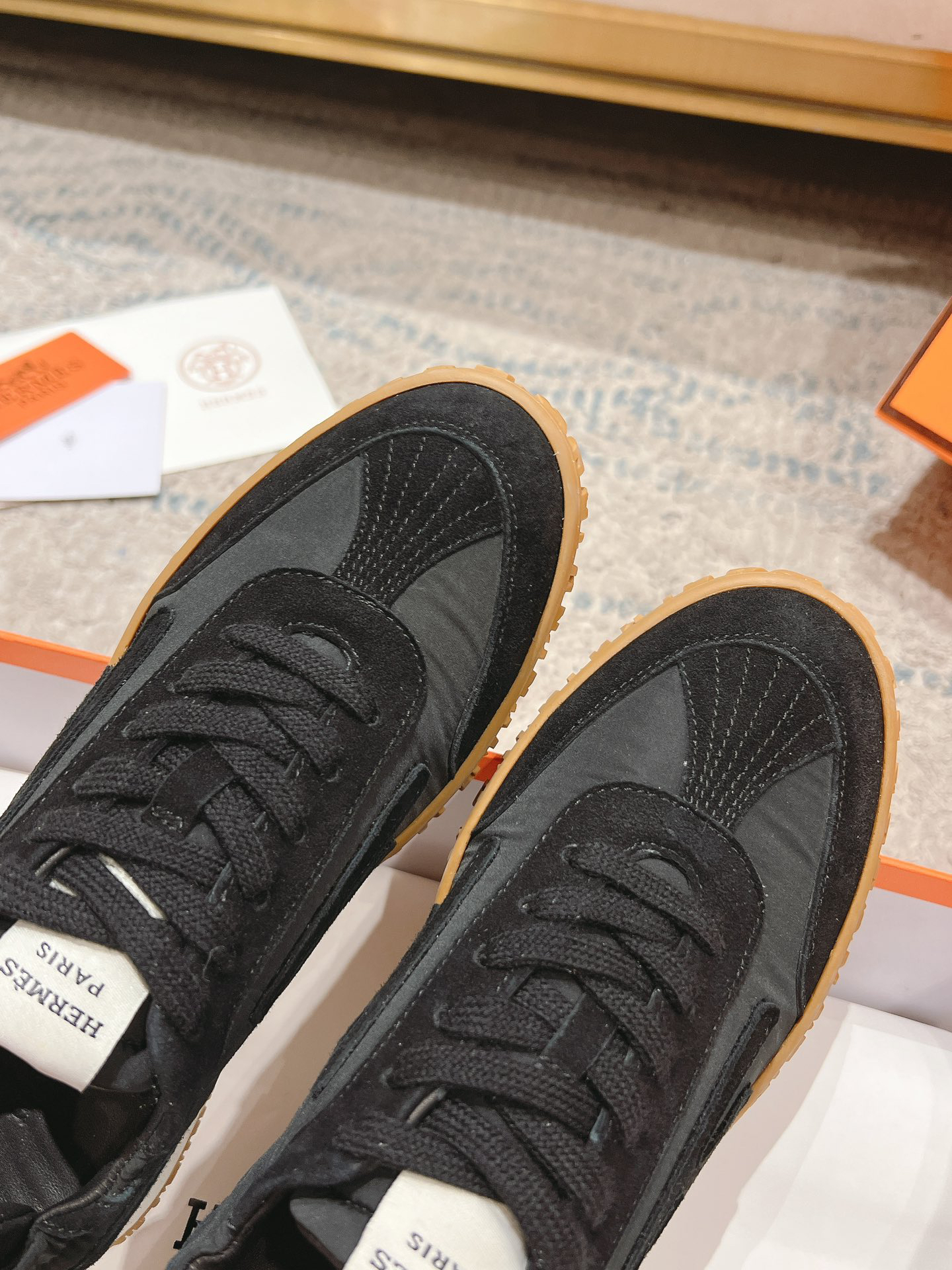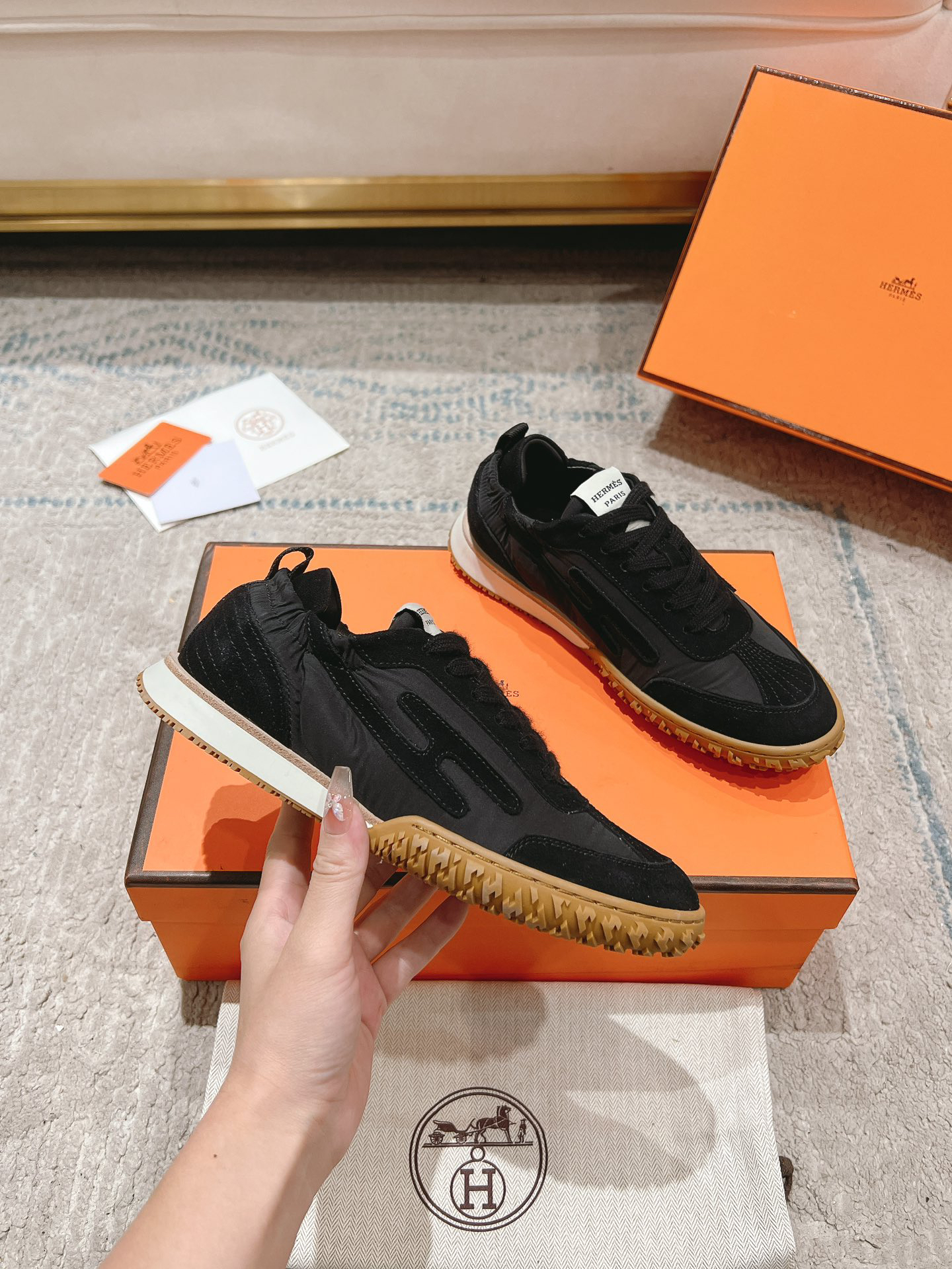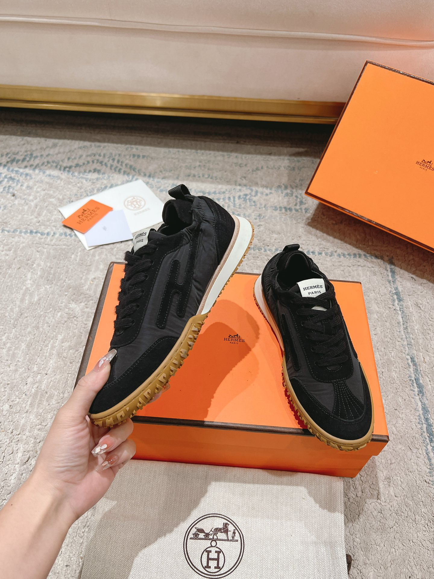 Design: This sneaker features a stylish patchwork design, blending retro and urban styles. The iconic Hermès “H” logo adorns the side of the shoe.