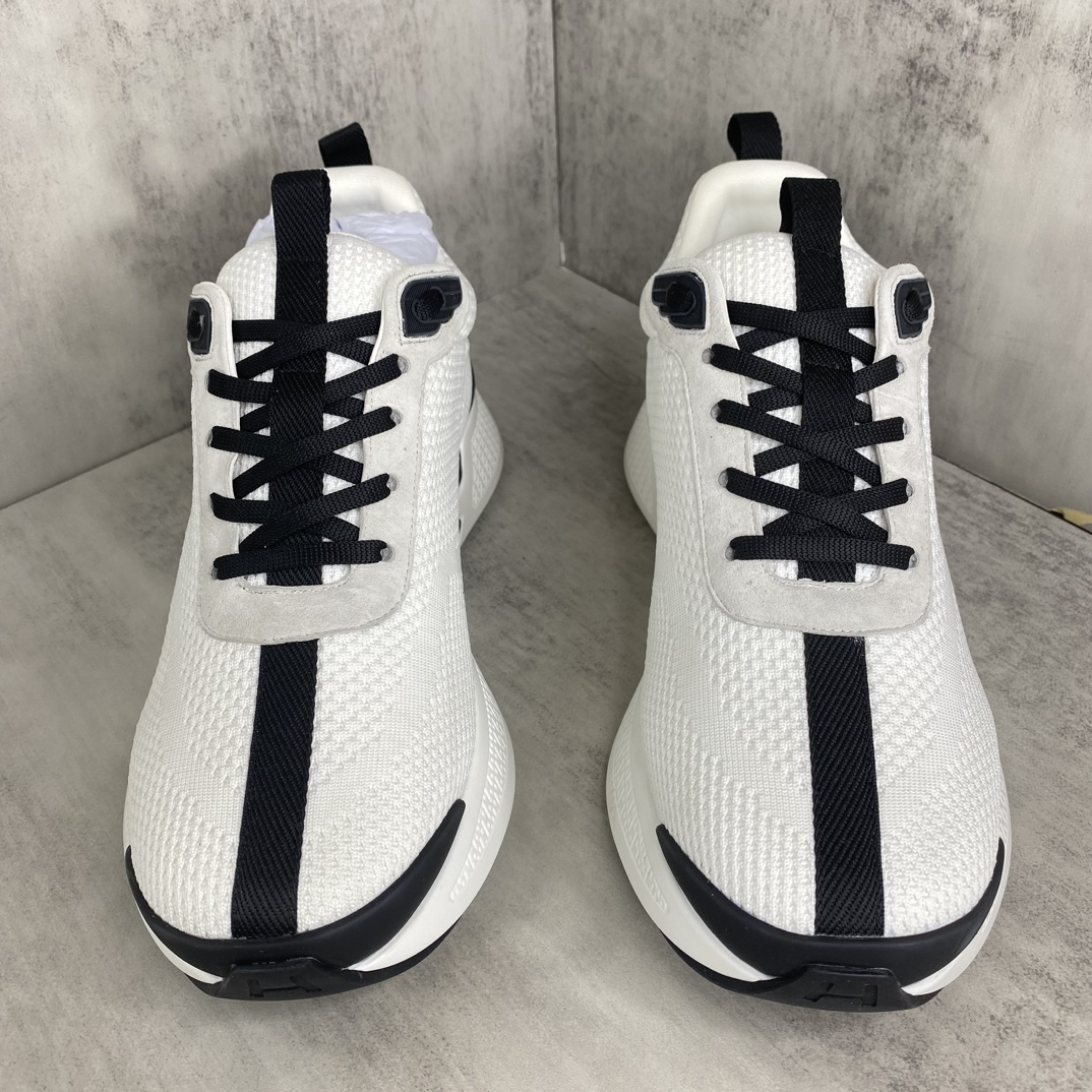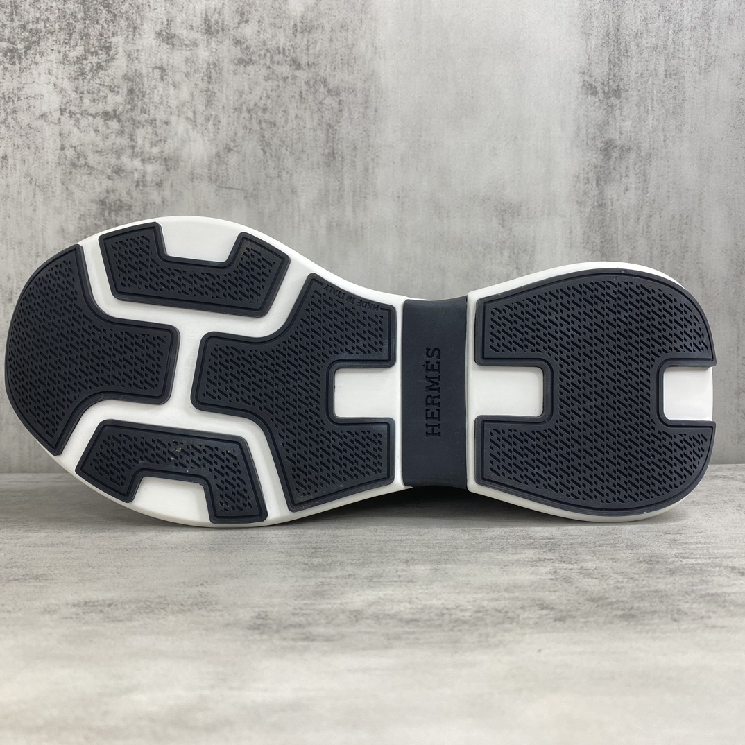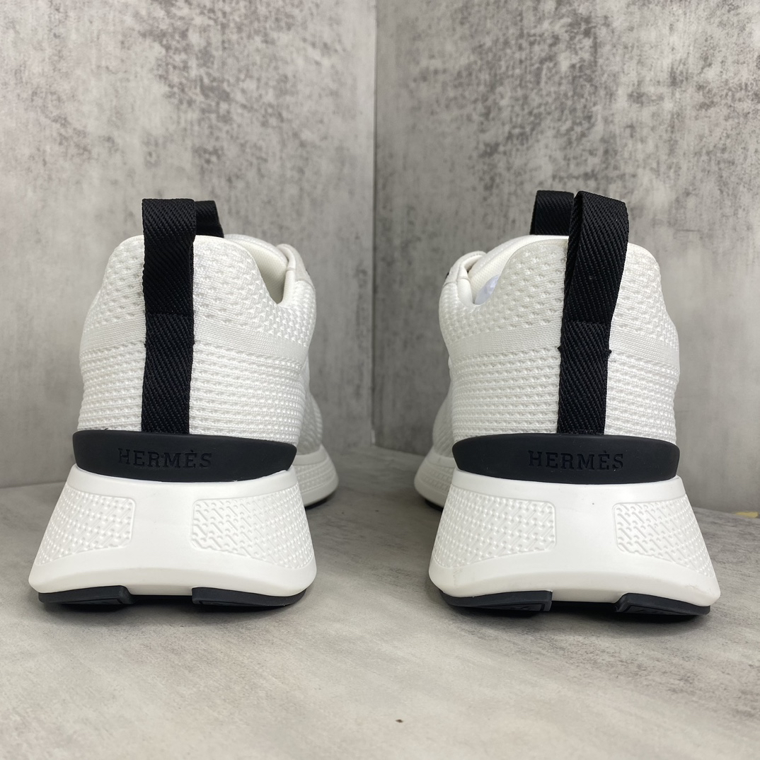 Design: These sneakers feature a stylish combination of knit fabric and cashmere leather, with a classic black and white color scheme adding an elegant touch. The iconic Hermès “H” logo adorns the side, highlighting the brand’s signature.