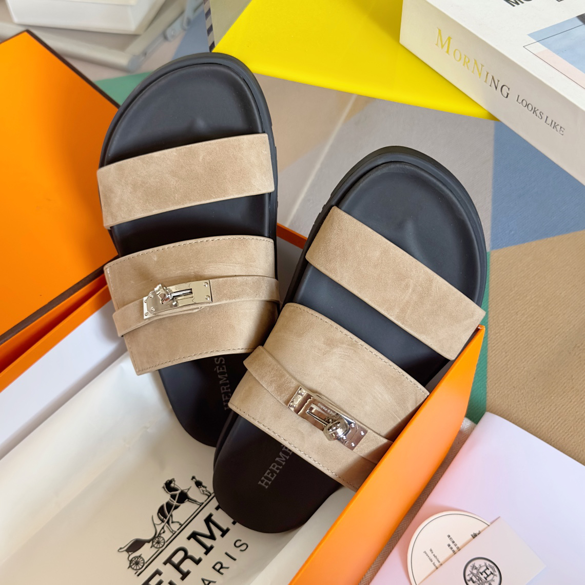 Hermes Chypre series, vintage-style slippers, H-shaped slippers, Velcro sandals.