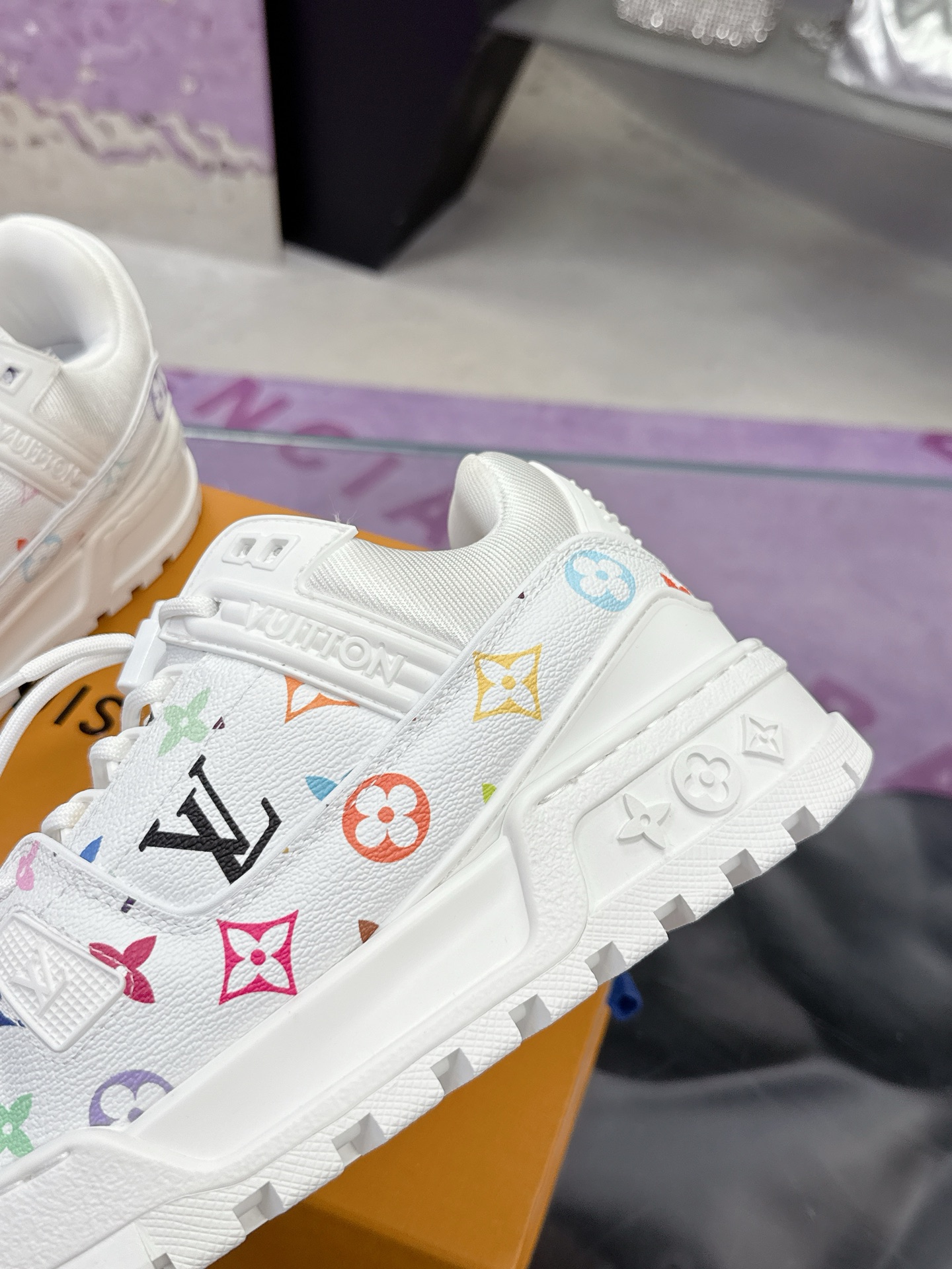 Louis Vuitton x Takashi Murakami collaboration LV Trainer sneakers, white multicolor Monogram version.