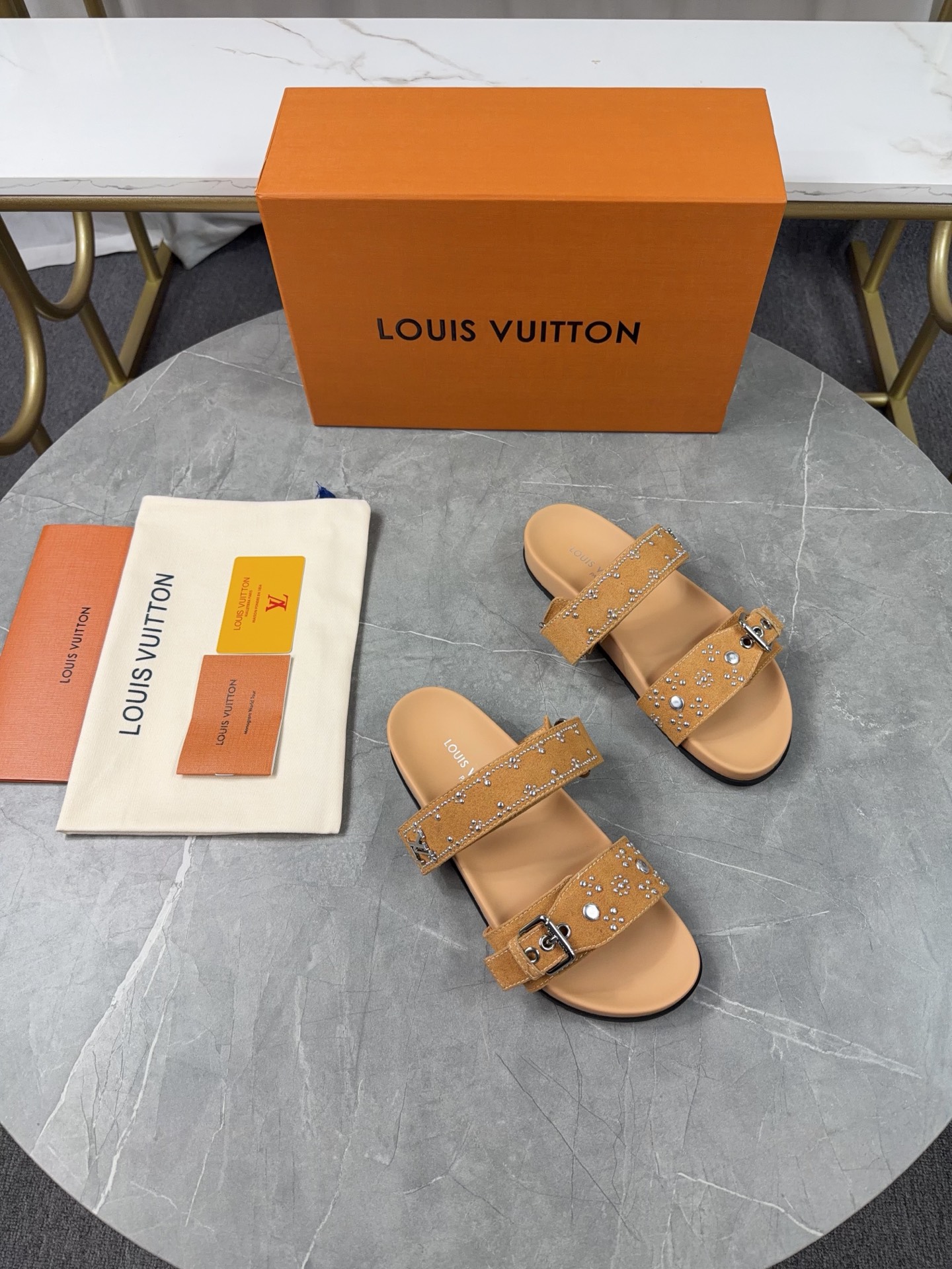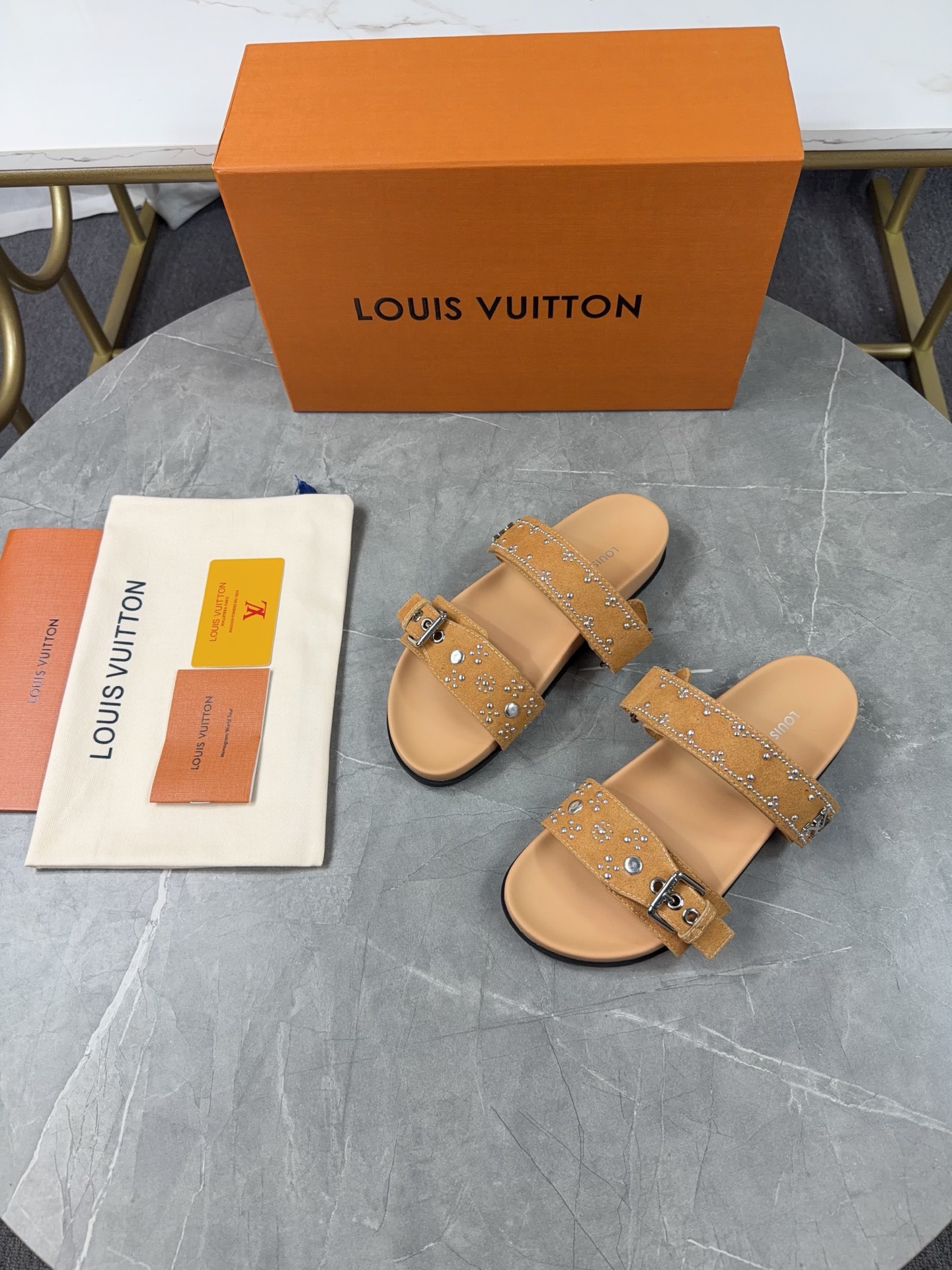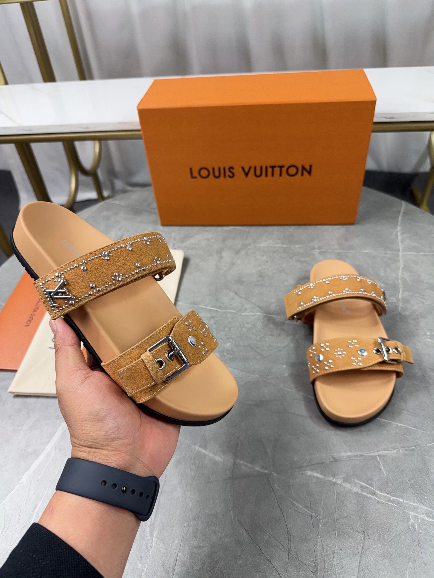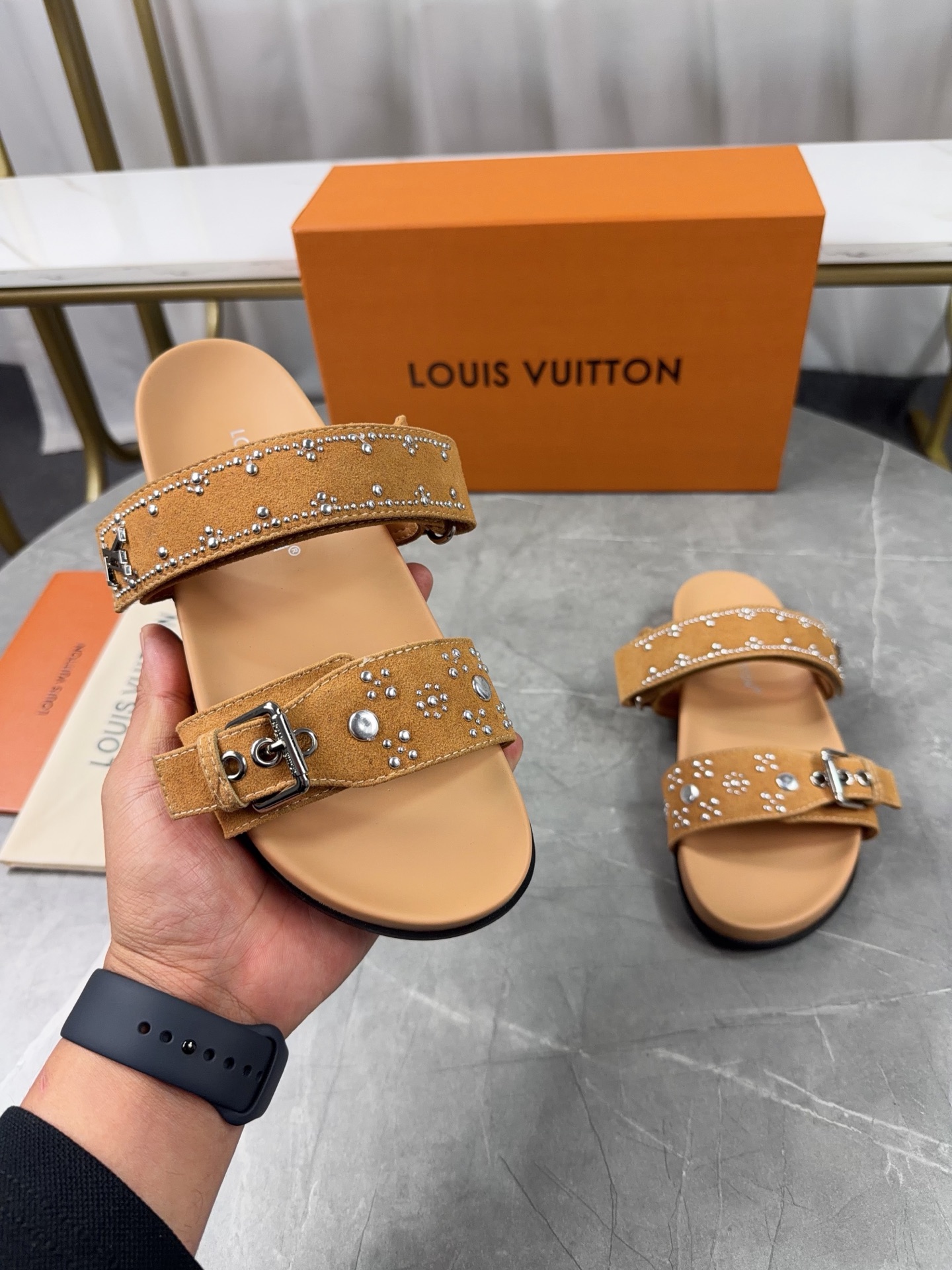Color: Beige suede calfskin as shown in the picture, adorned with silver stud details.
