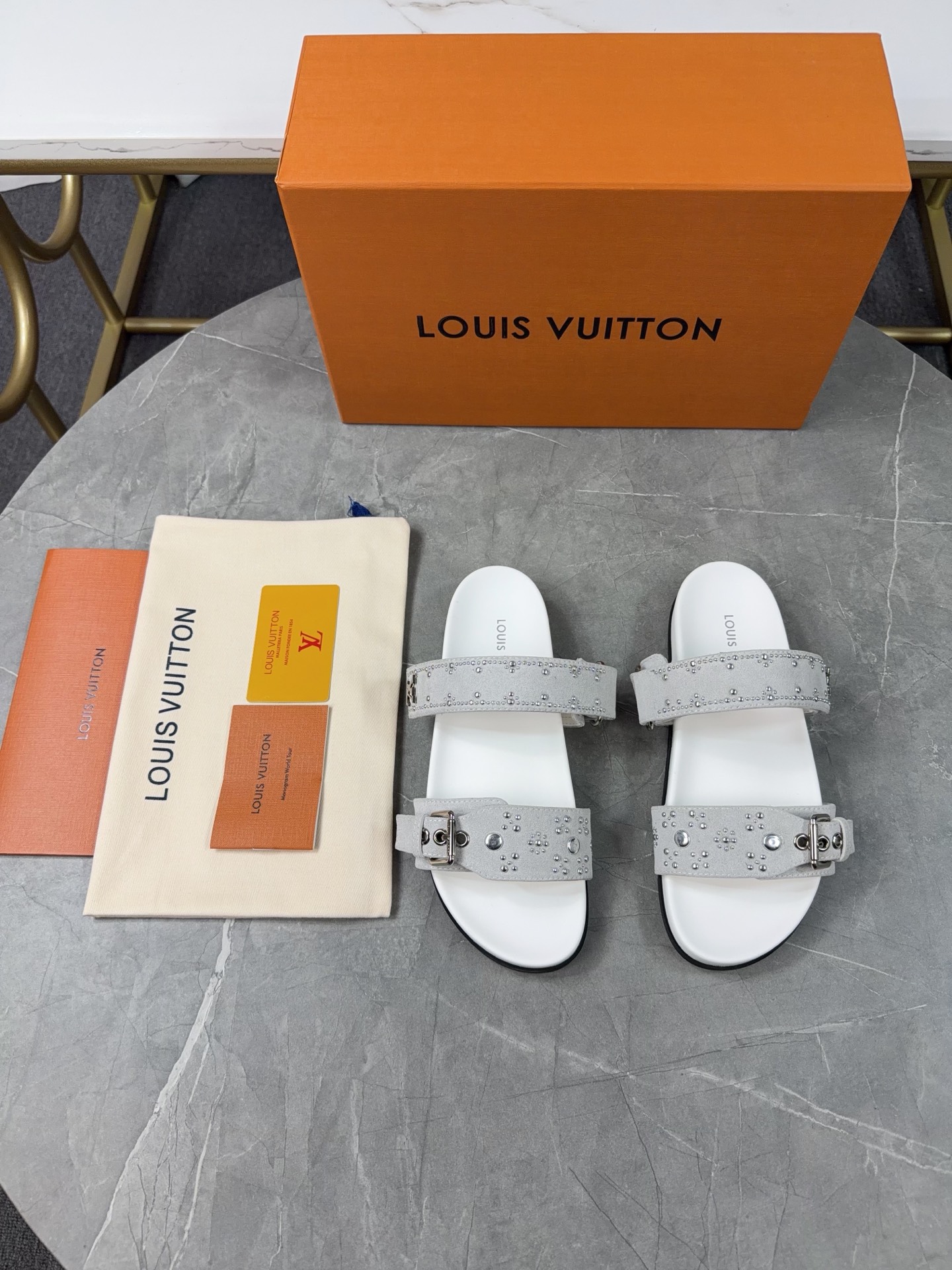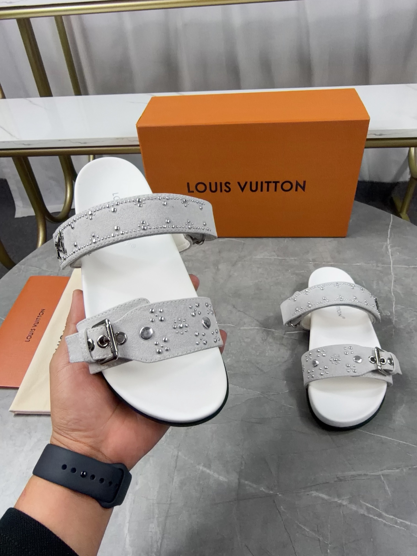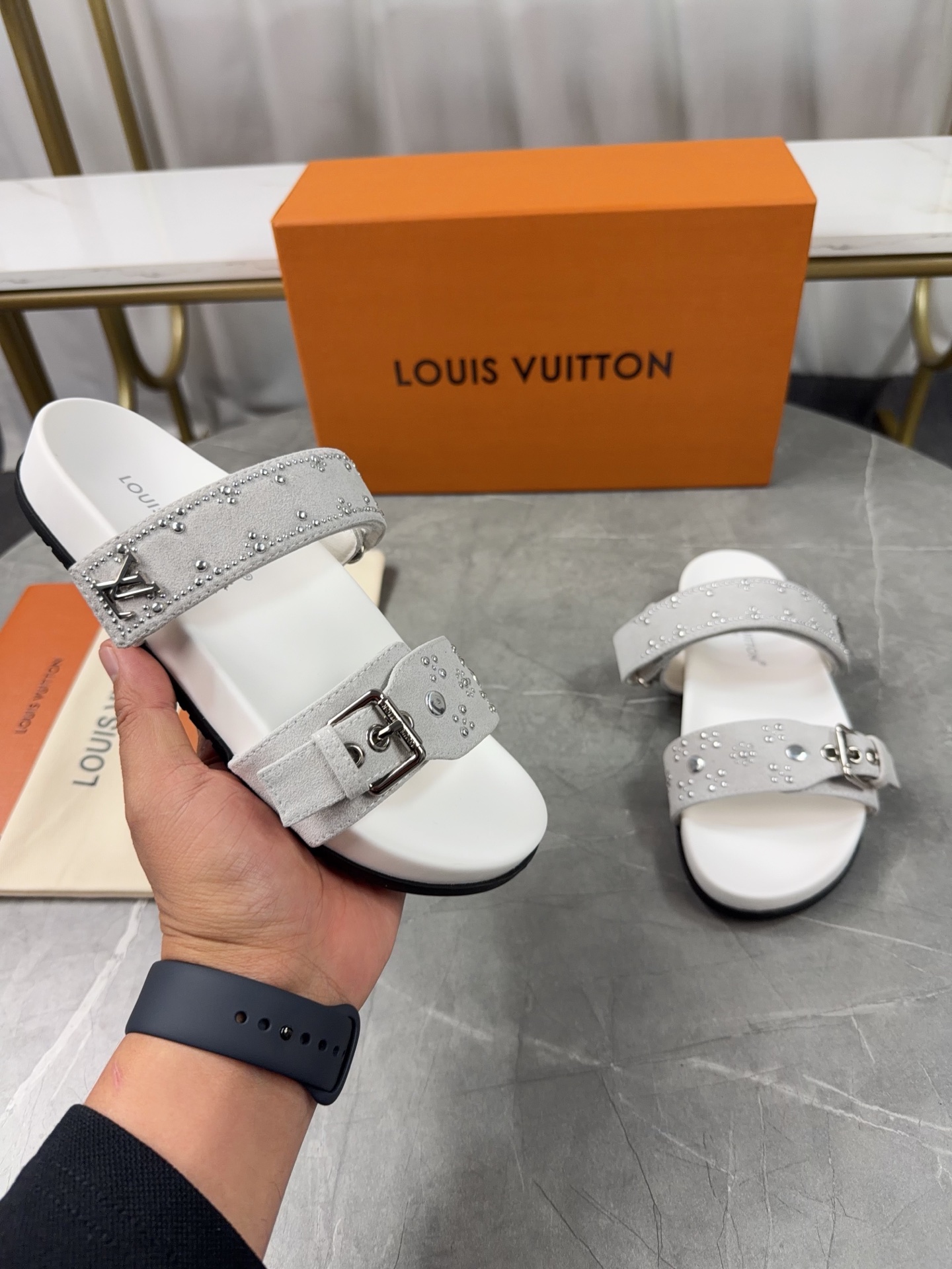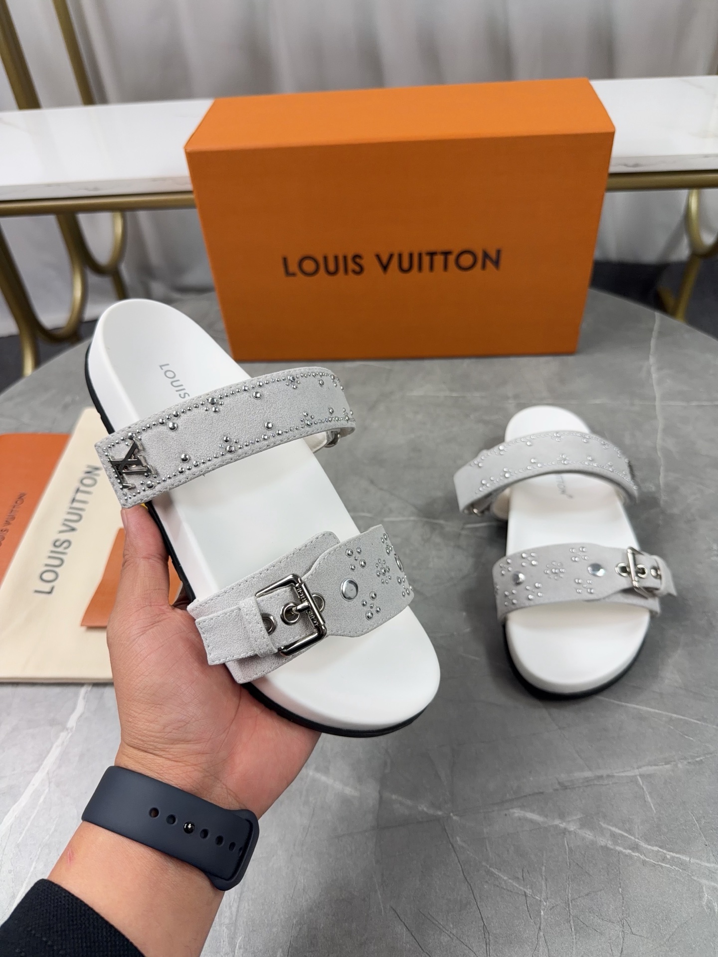 Color: Grey suede calfskin with silver stud details (as pictured)