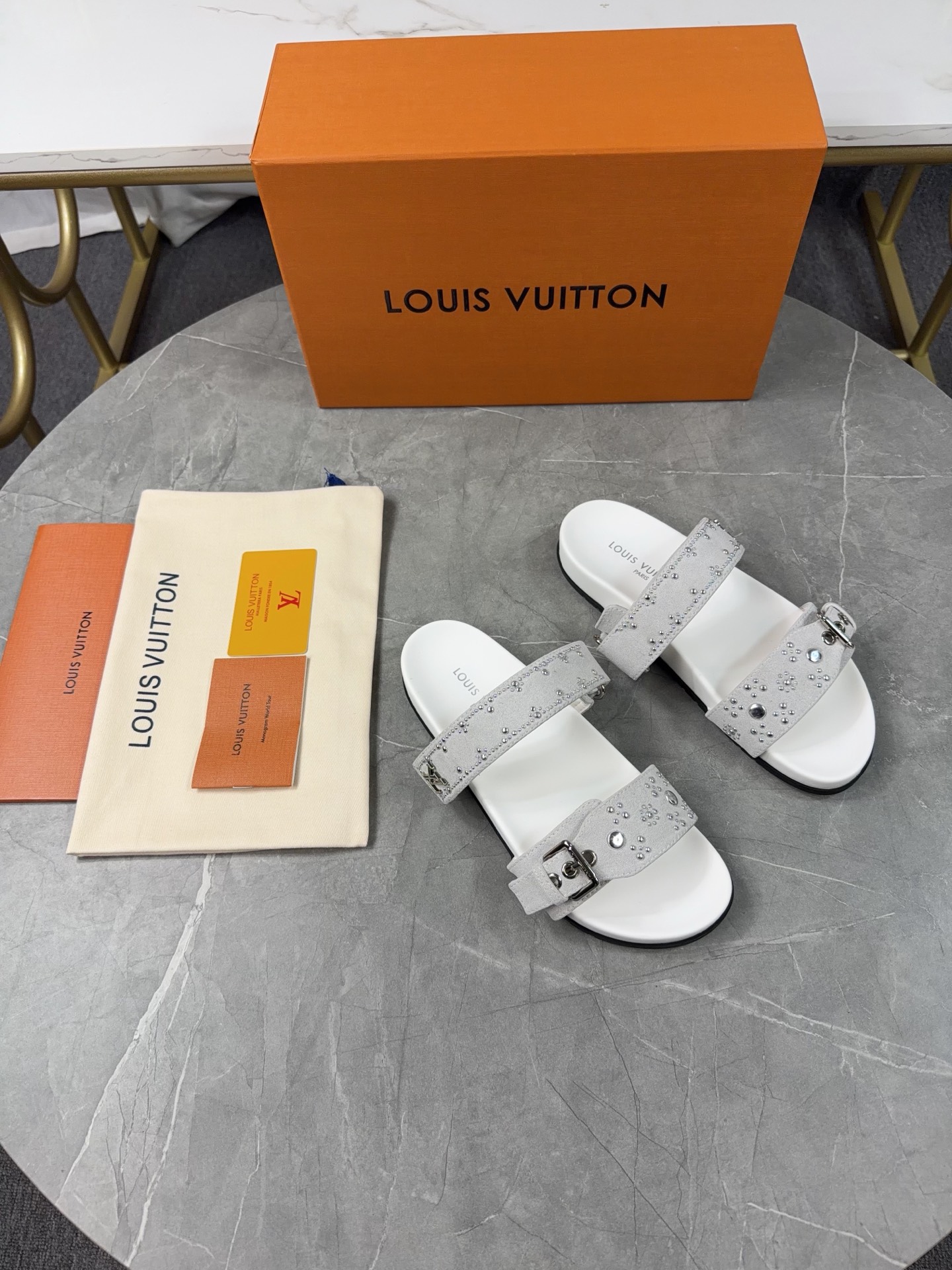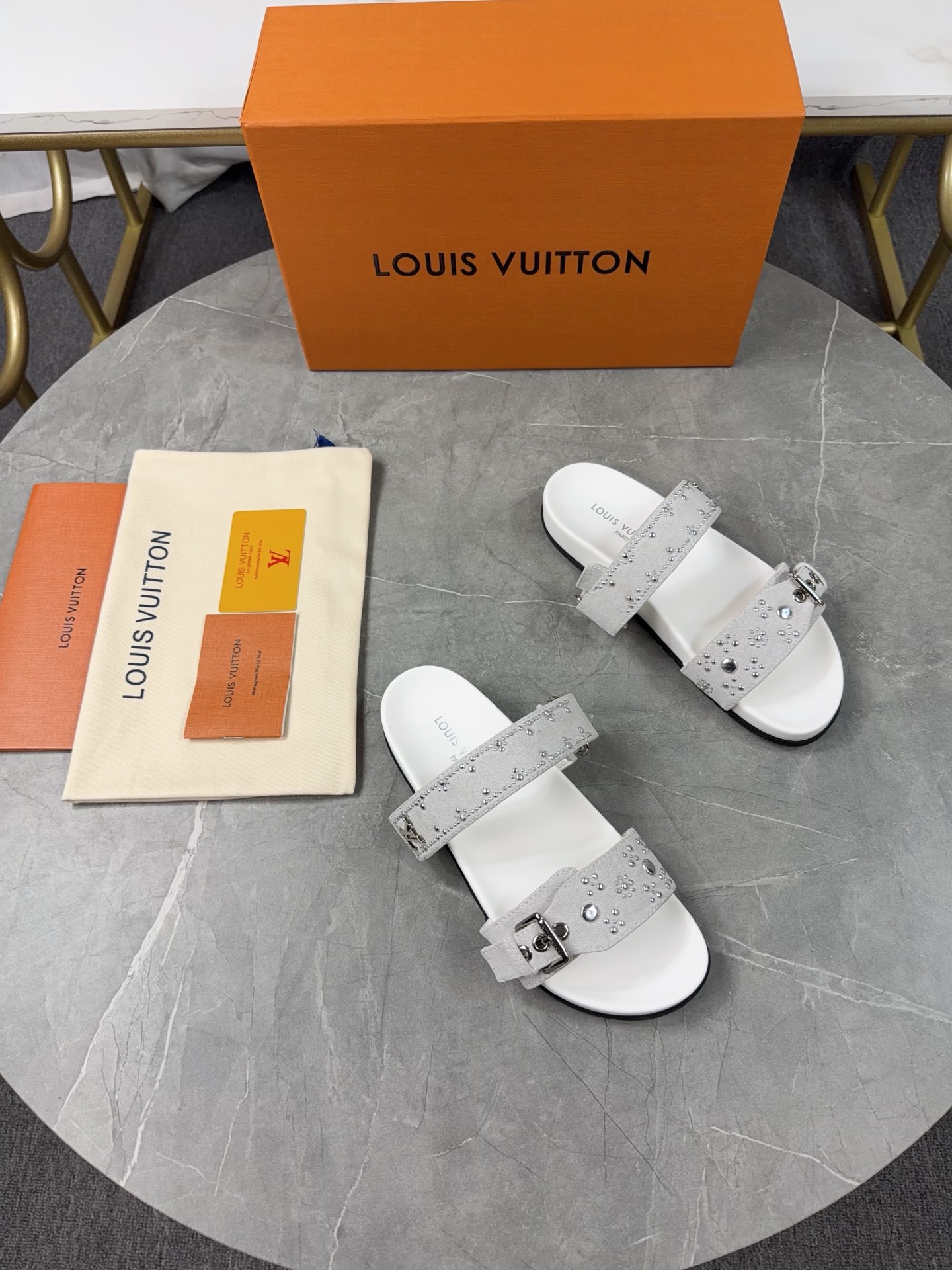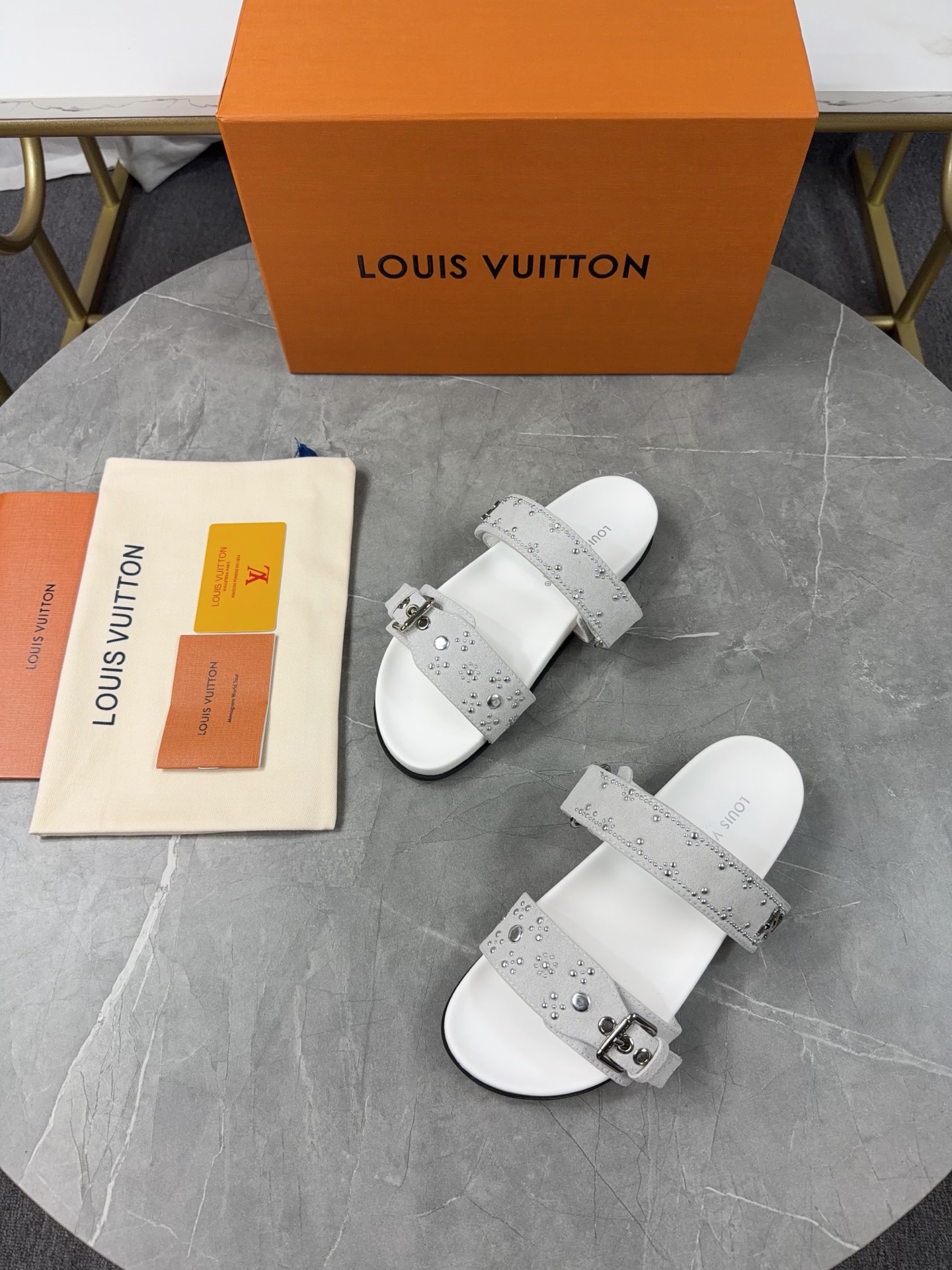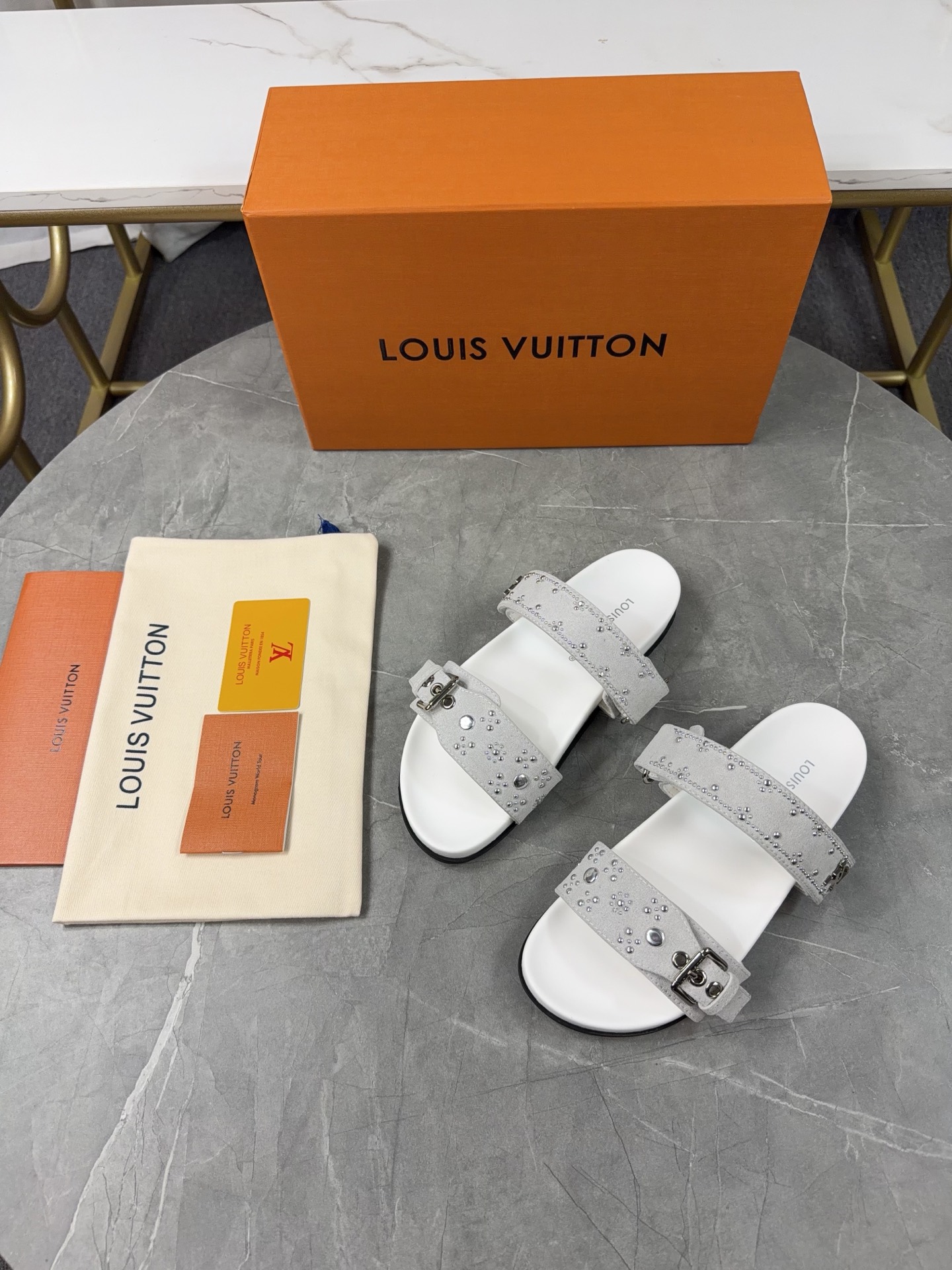 Color: Grey suede calfskin with silver stud details (as pictured)