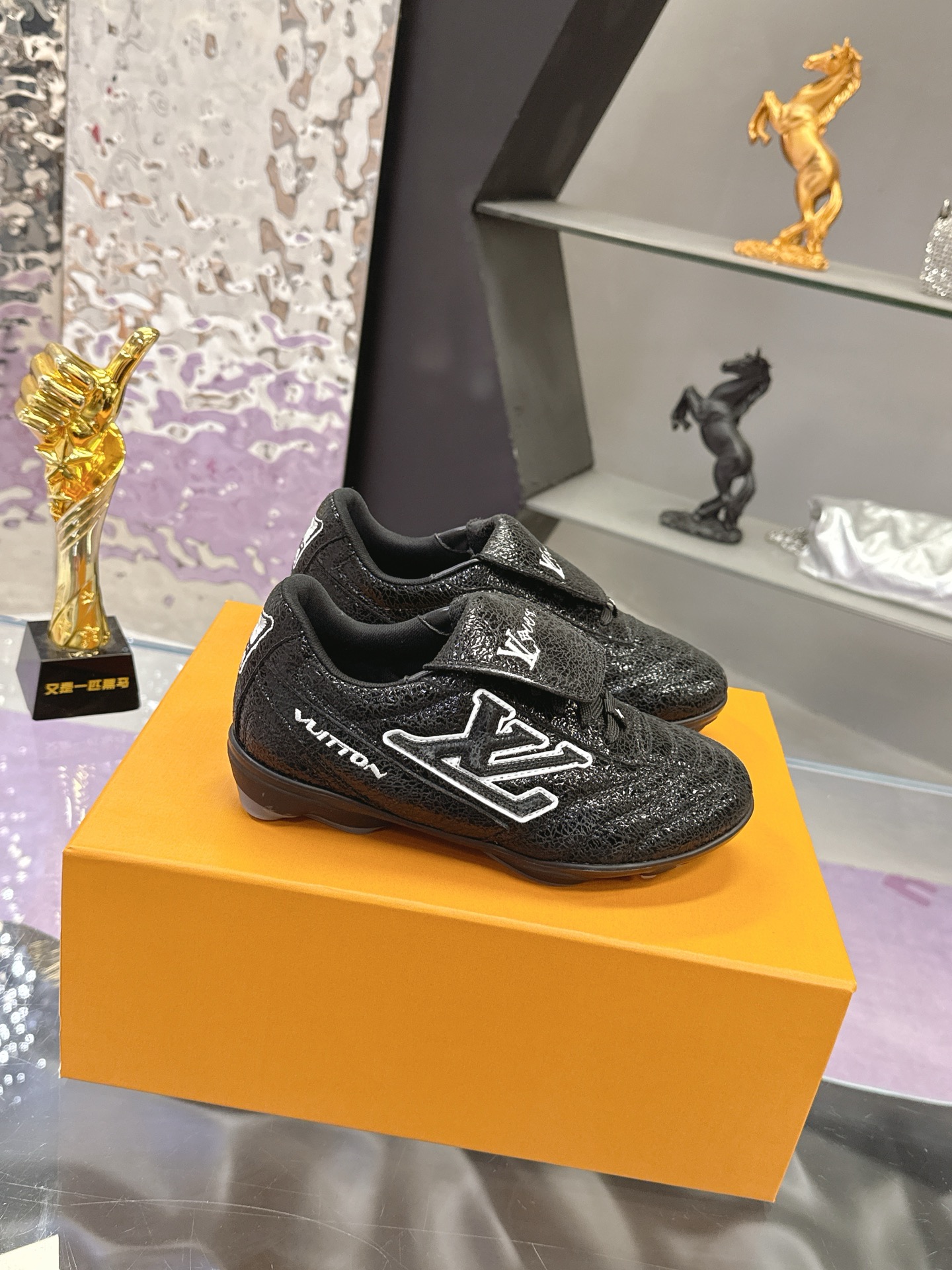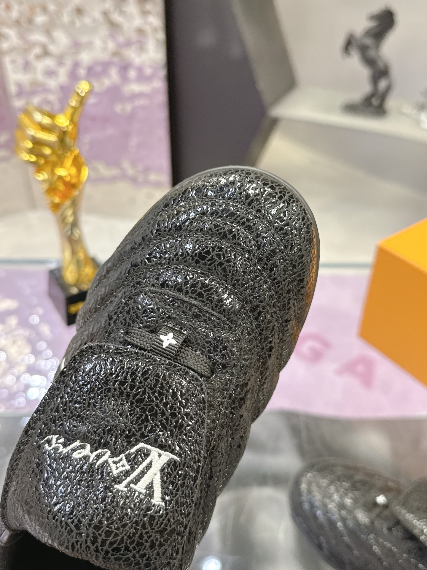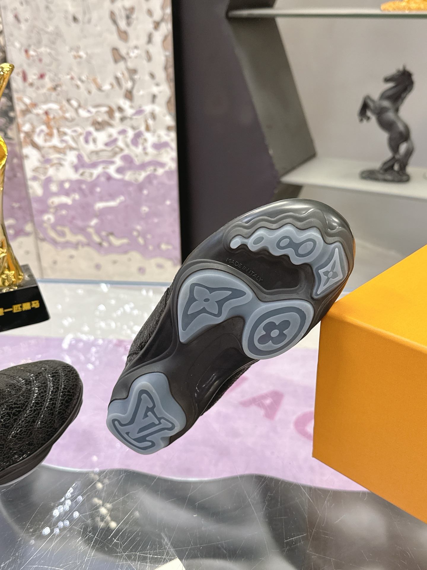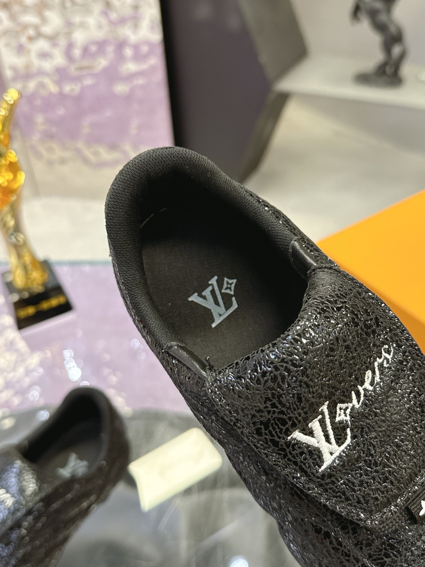 Color: Black with a white LV Initials logo and white accents, gum rubber outsole