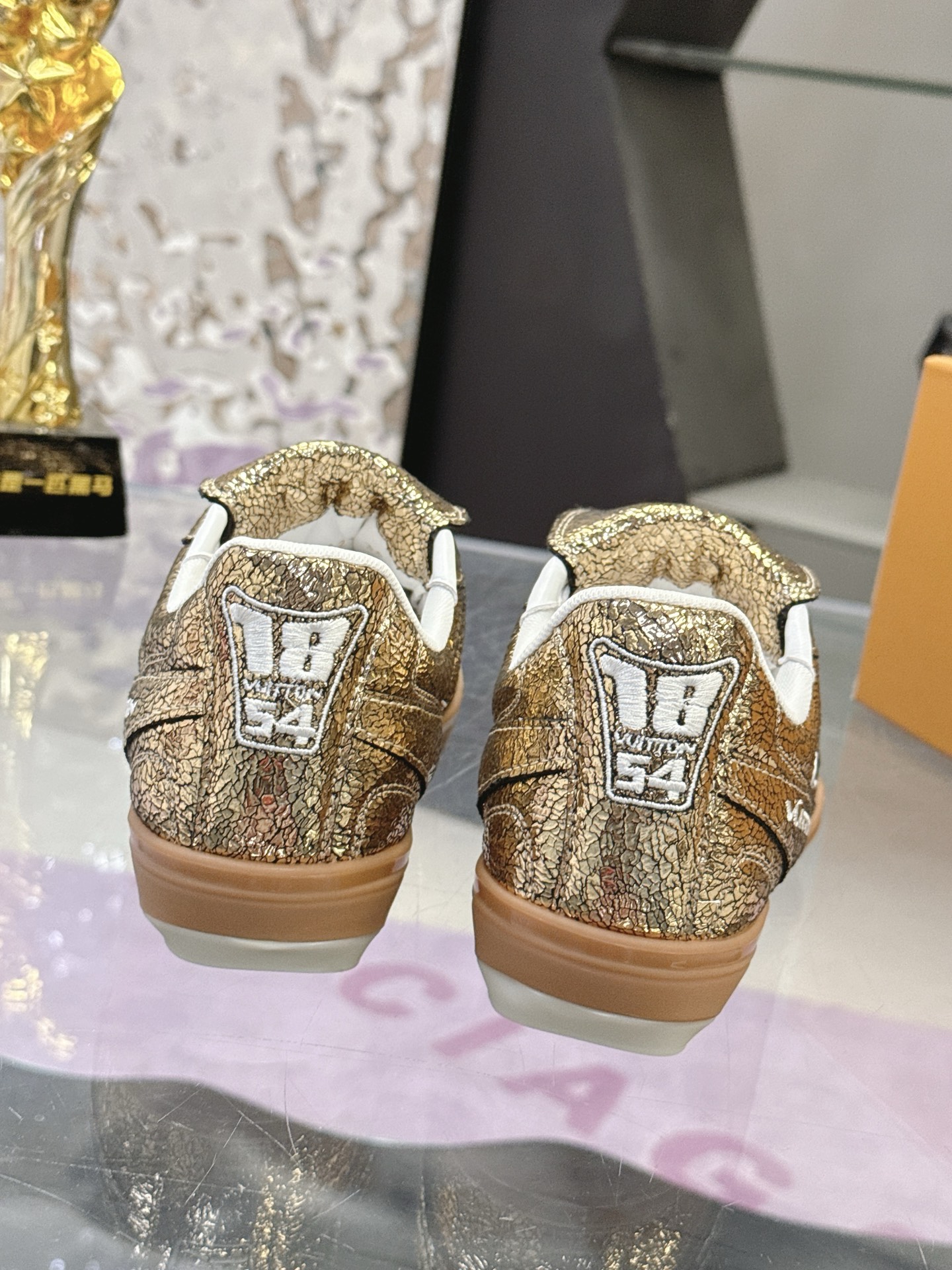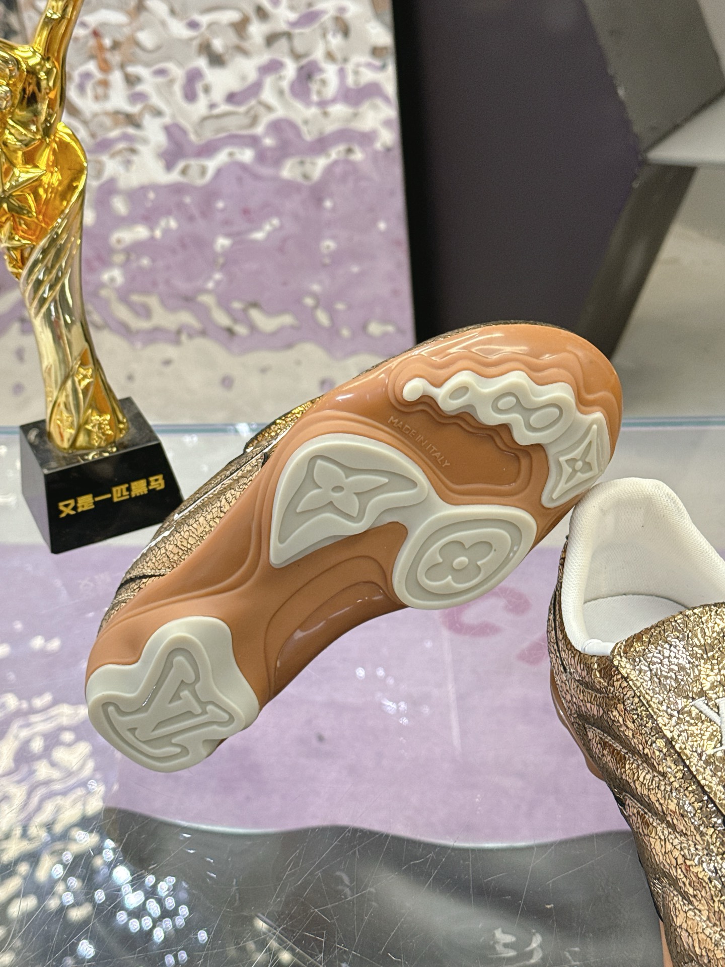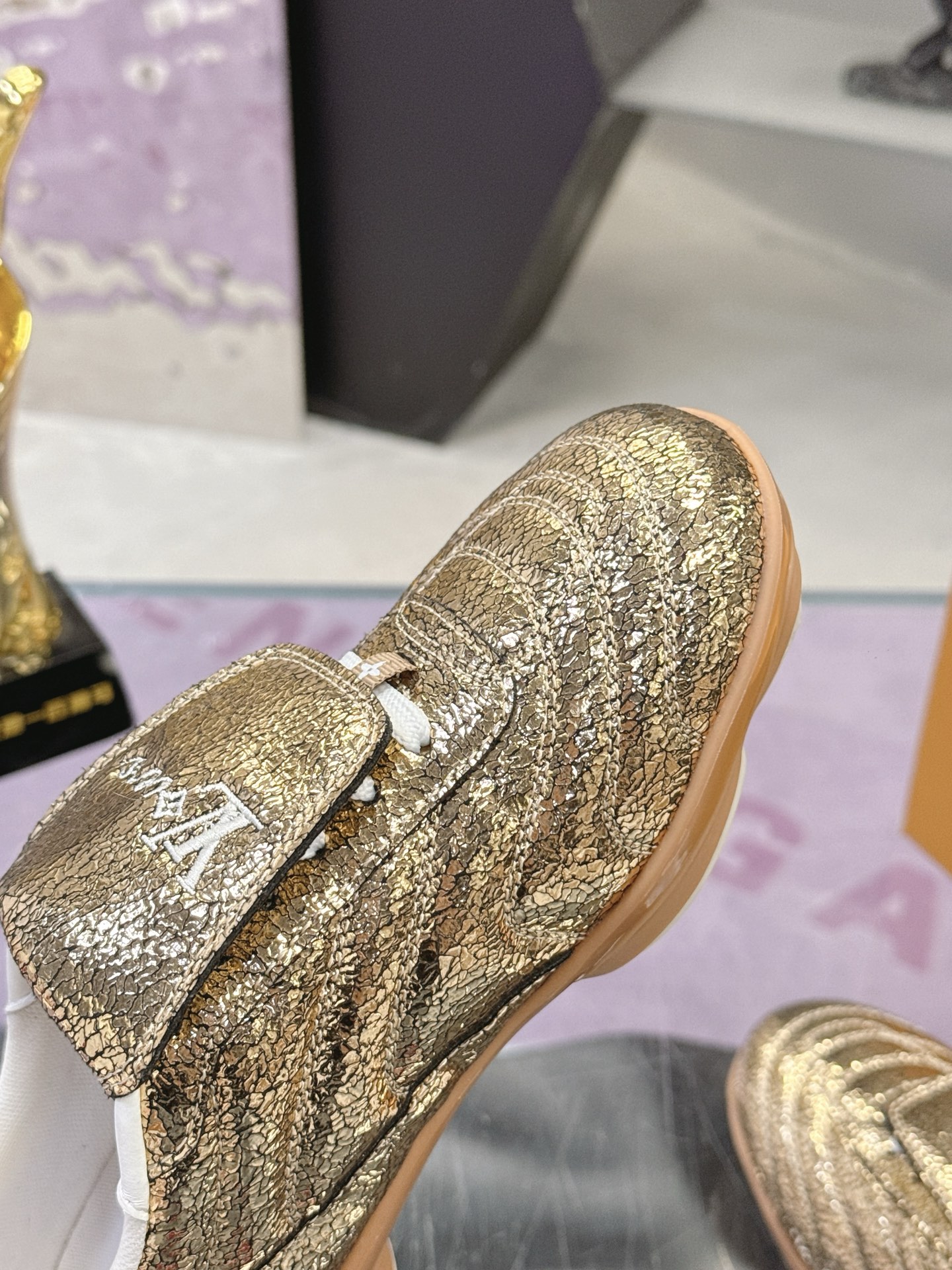 Color: Gold, adorned with a white LV Initials logo and white accents, gum rubber outsole