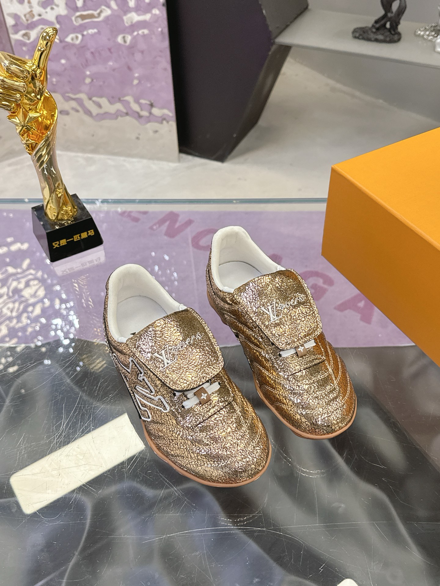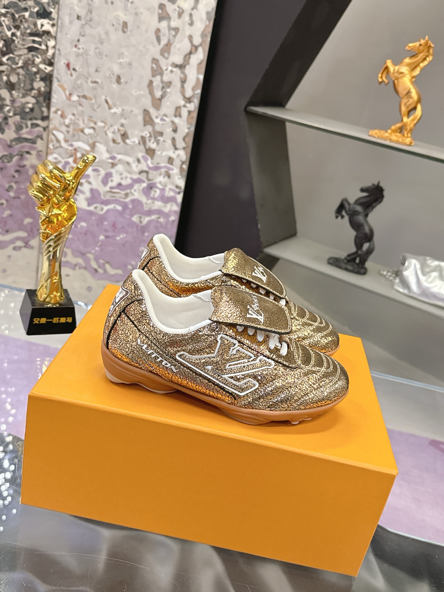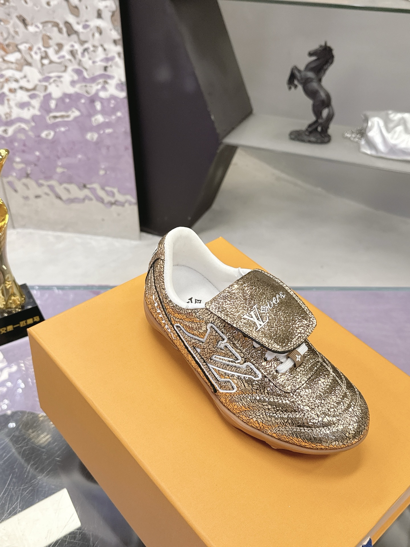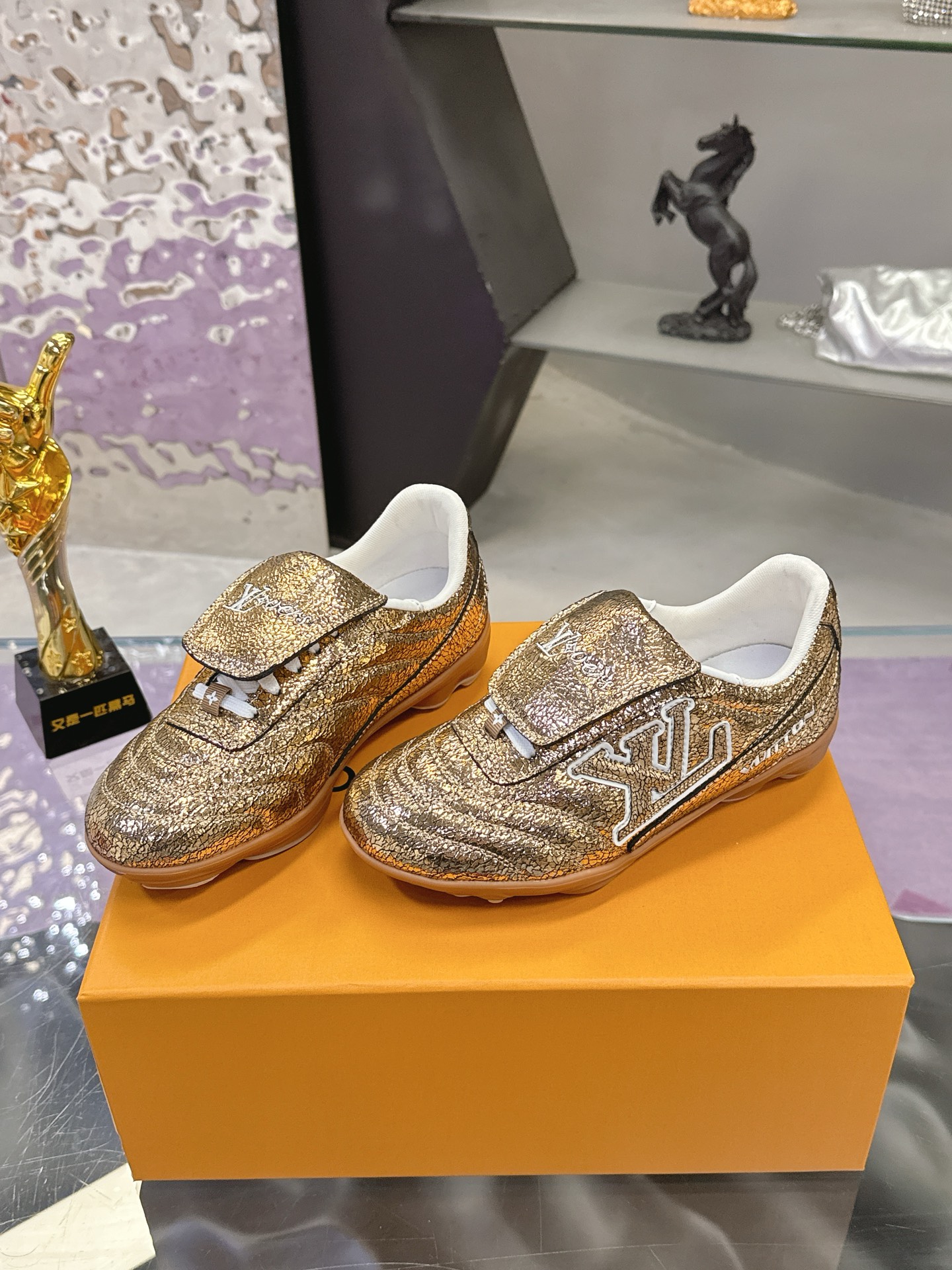 Color: Gold, adorned with a white LV Initials logo and white accents, gum rubber outsole