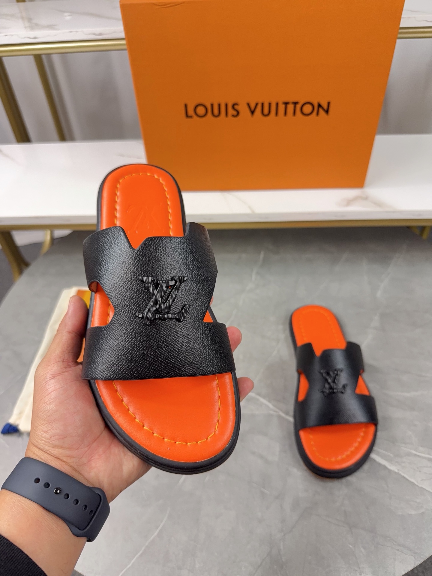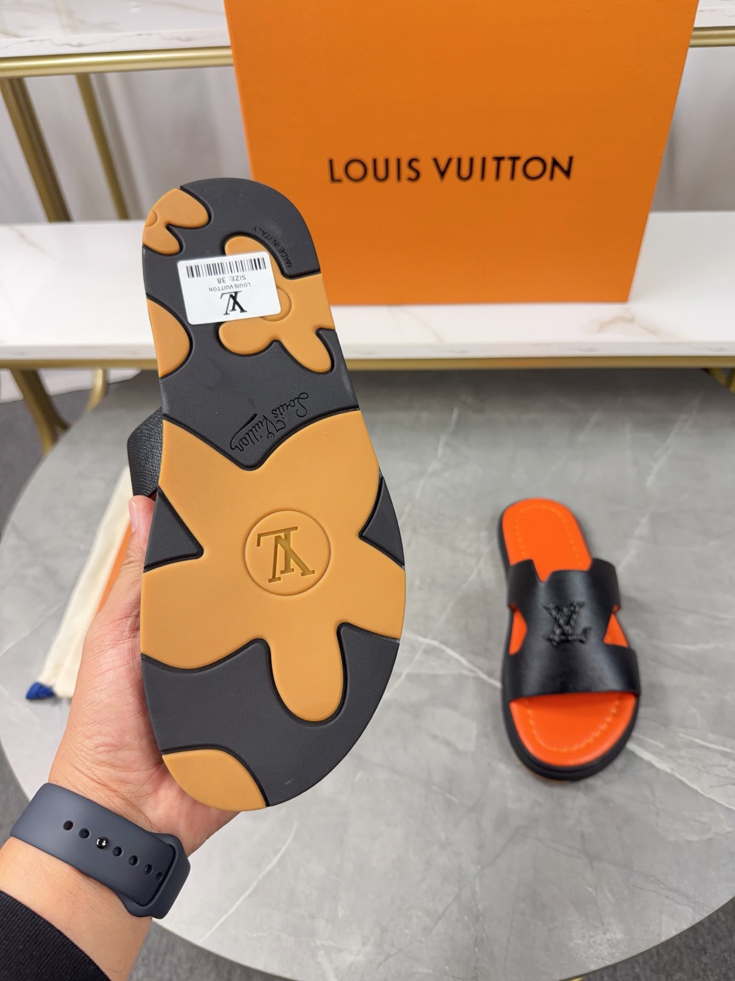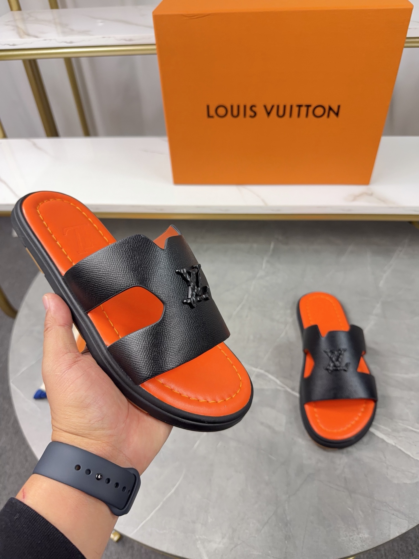 Design Details: The main feature is the openwork LV Circle logo on the wide toe strap.