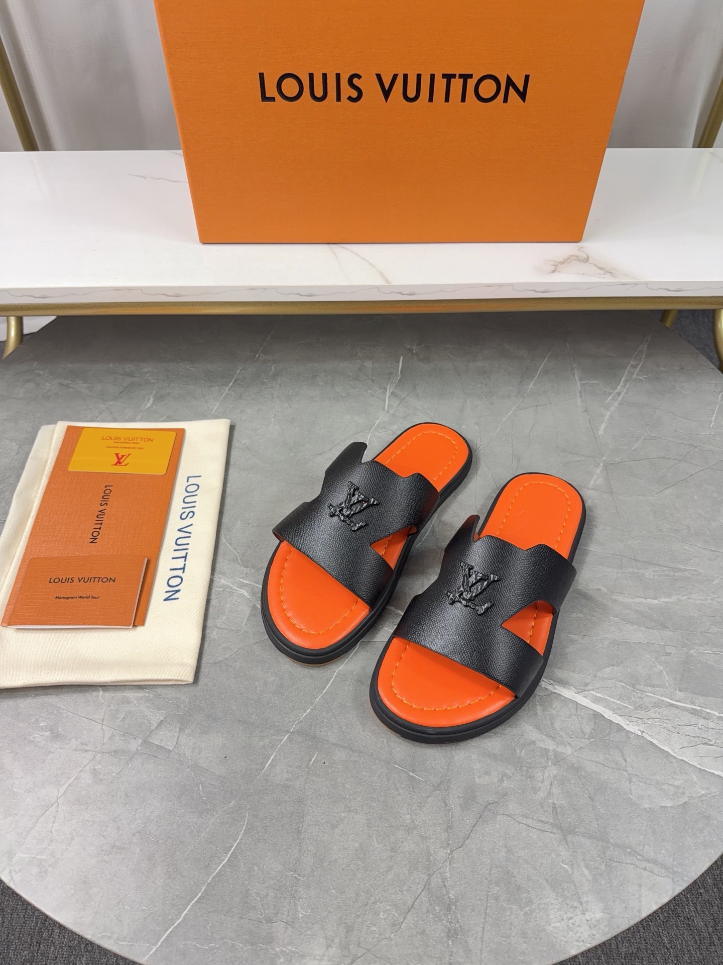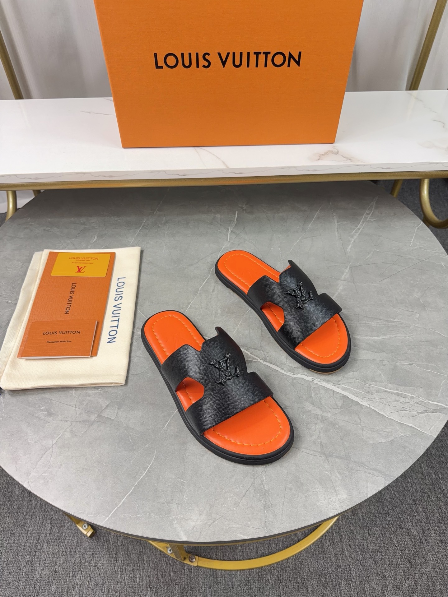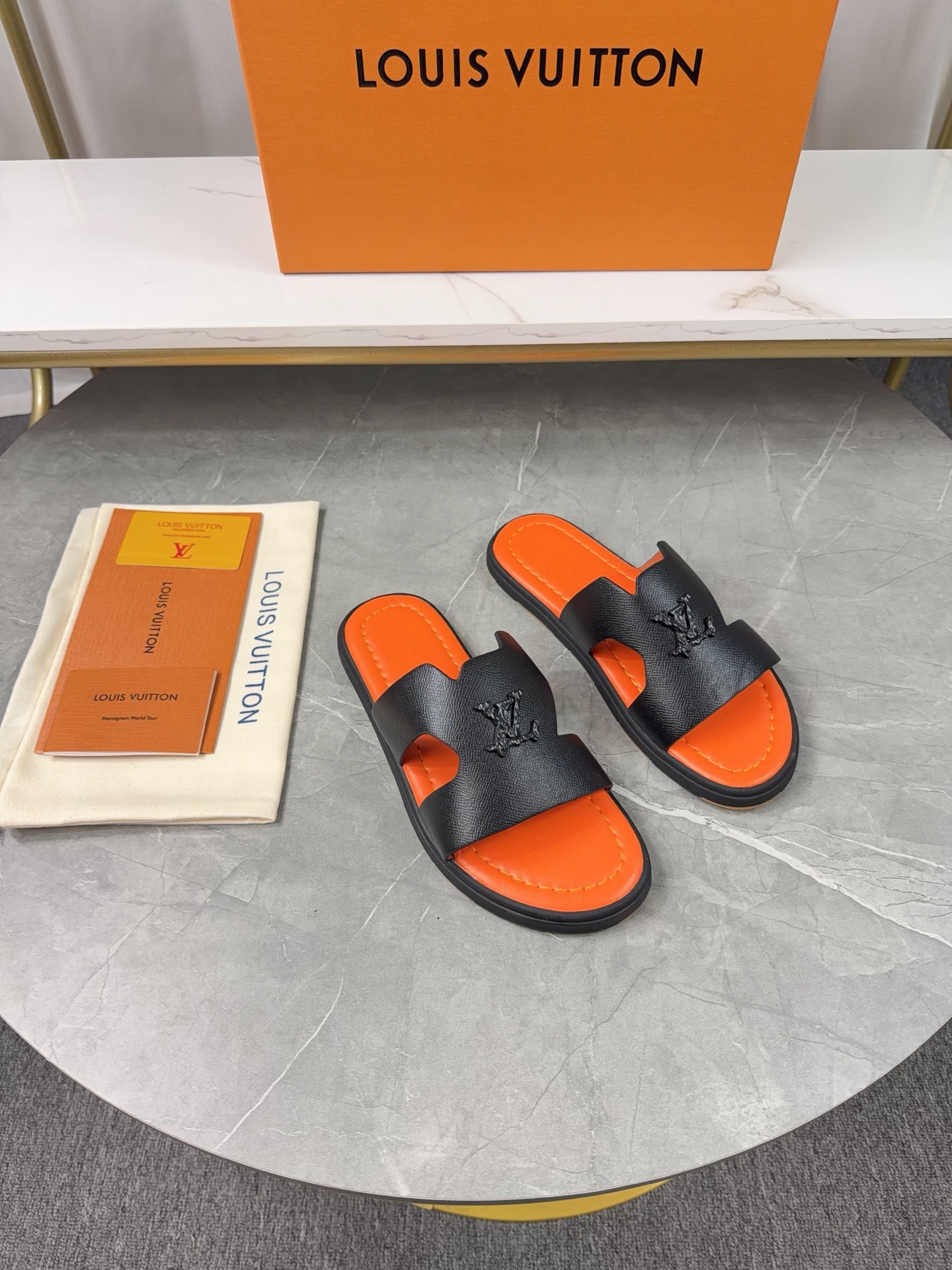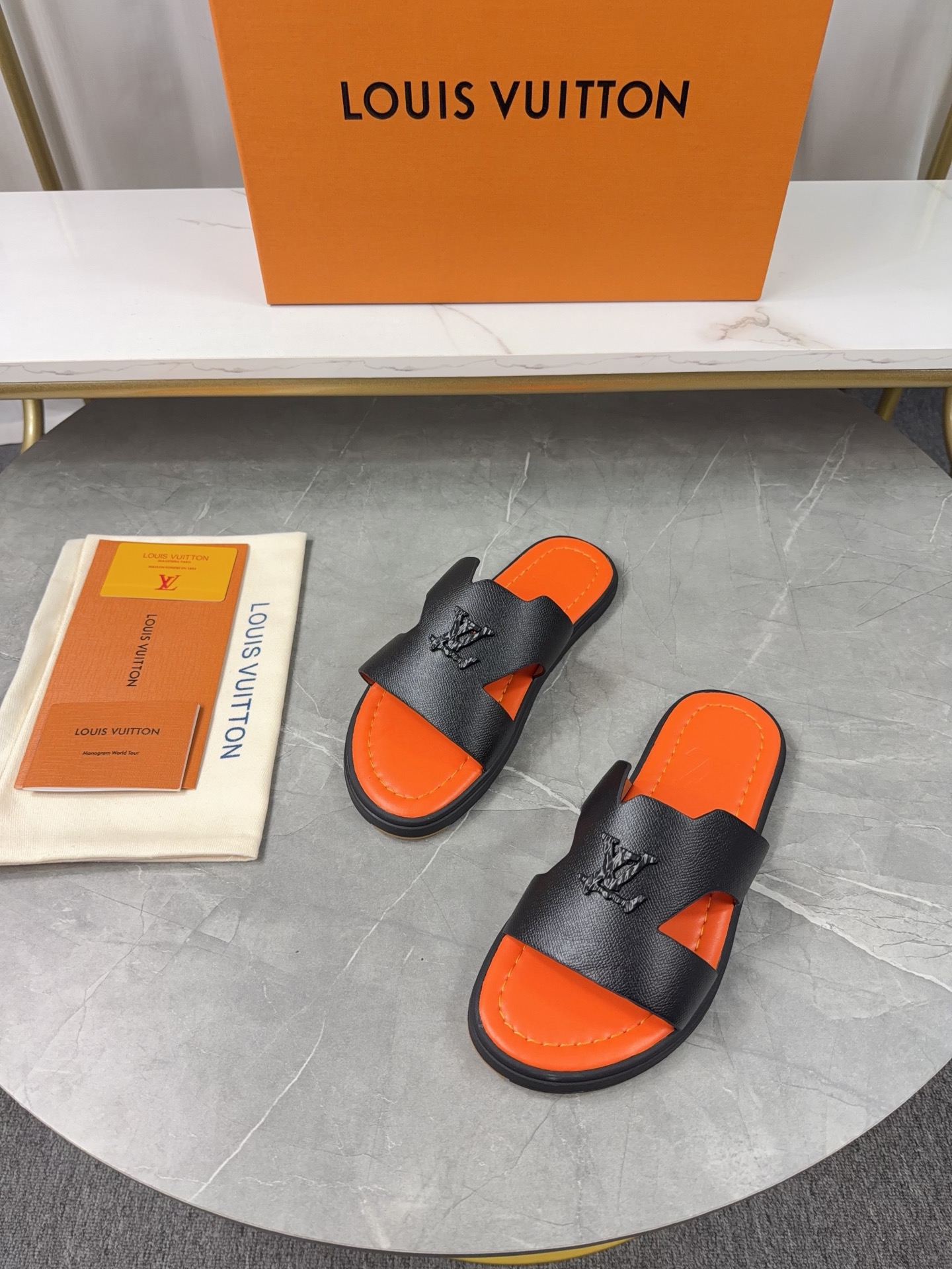 Design Details: The main feature is the openwork LV Circle logo on the wide toe strap.