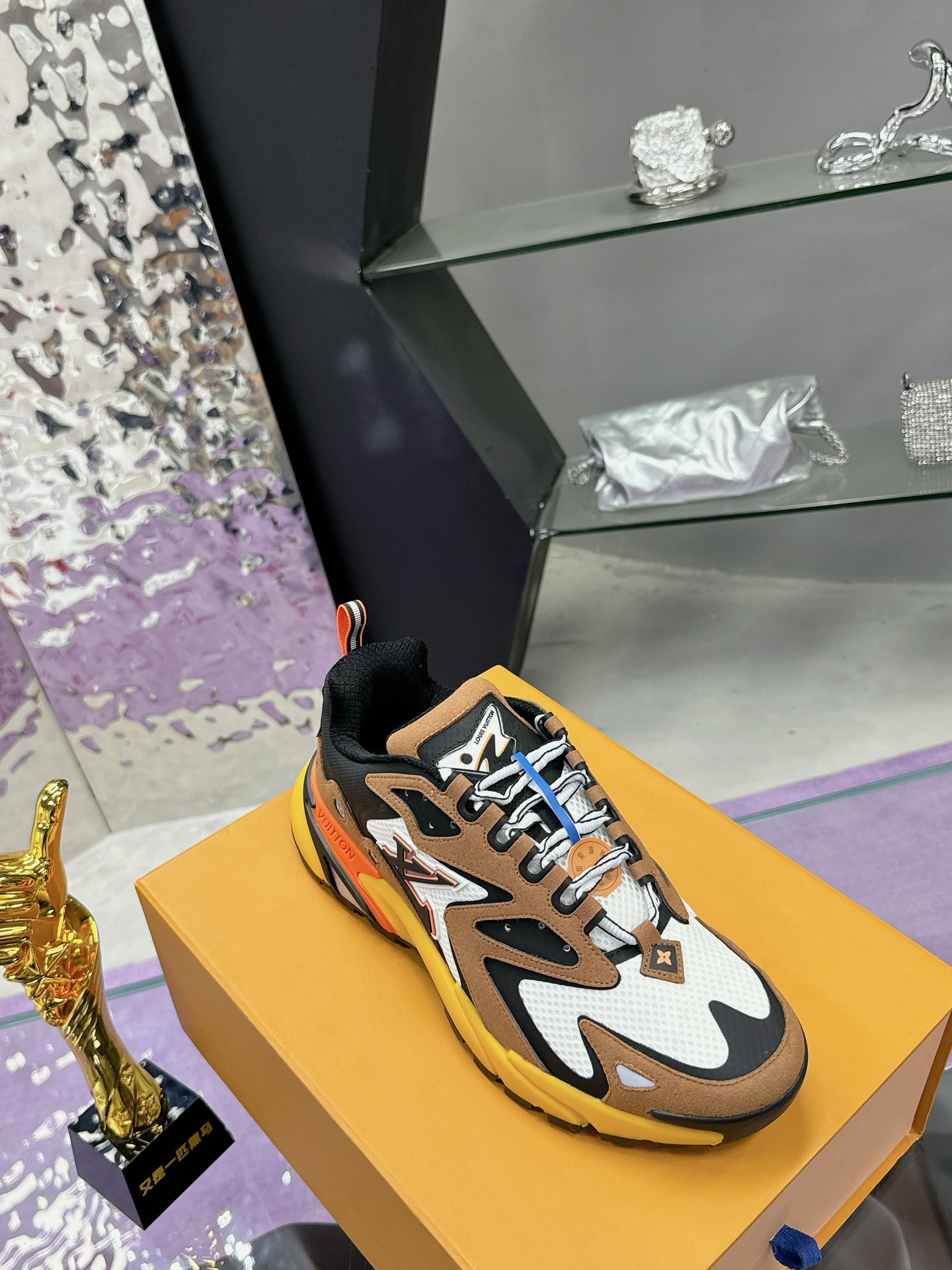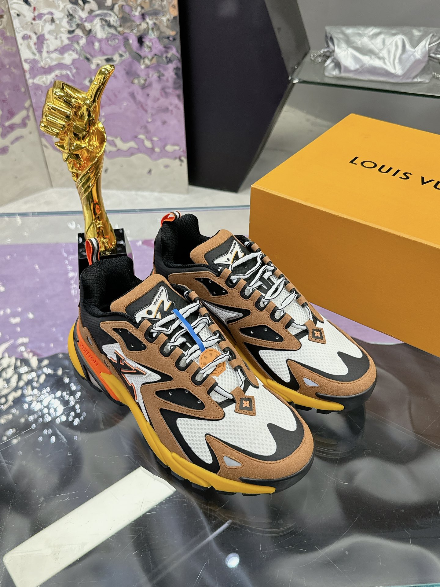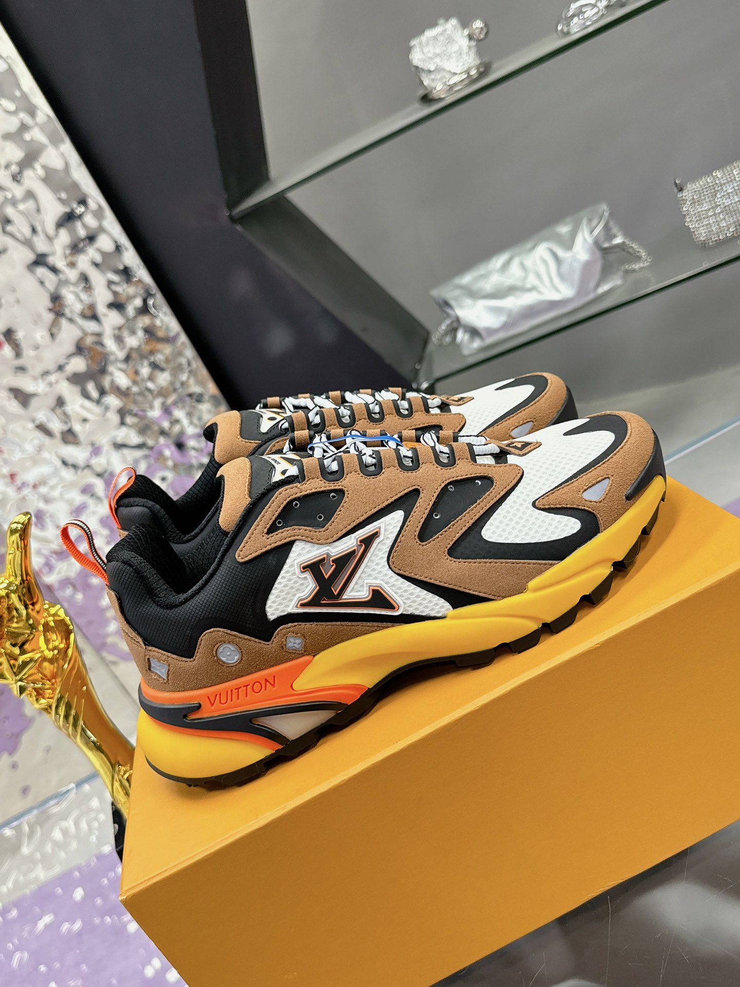 Features: The side of the shoe features a dynamic “LV” initial logo. The functional lacing system includes adjustable buckles and is decorated with a Monogram floral pattern. Reflective Monogram floral patterns also adorn the tongue and the ultra-lightweight wavy rubber outsole.