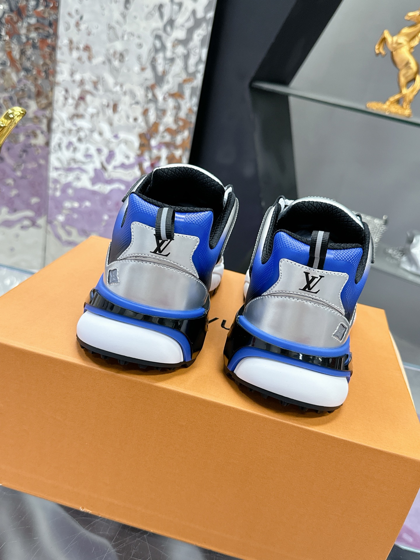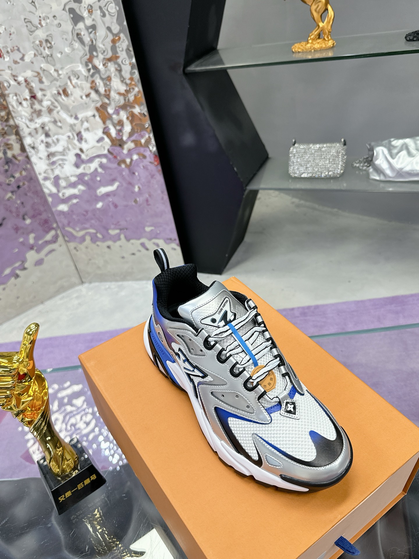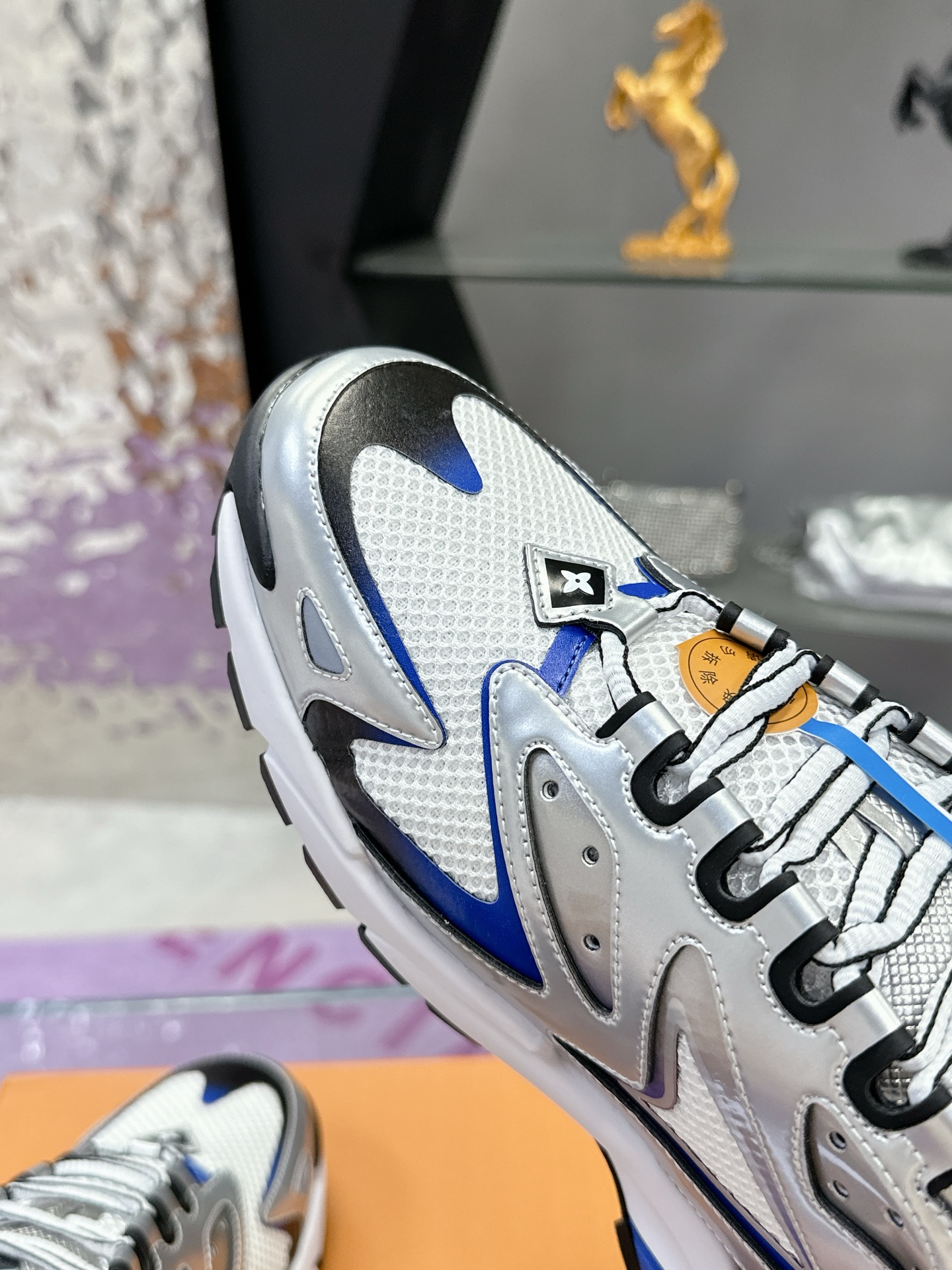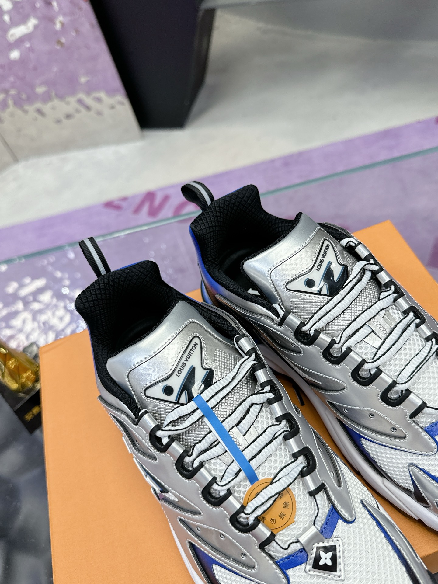 [LV Runner Tatic Sneakers]. This shoe is a cutting-edge interpretation of running shoes, combining functional materials such as mesh and metallic coatings to create a unique gradient silver effect.