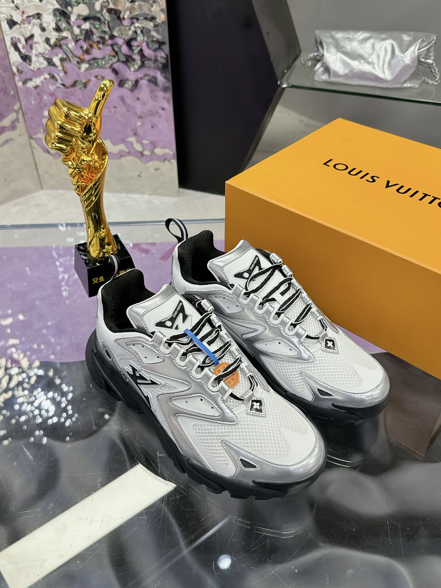 [LV Runner Tatic Sneakers]. This shoe is a cutting-edge interpretation of running shoes, combining functional materials such as mesh and metallic coatings to create a unique gradient silver effect.