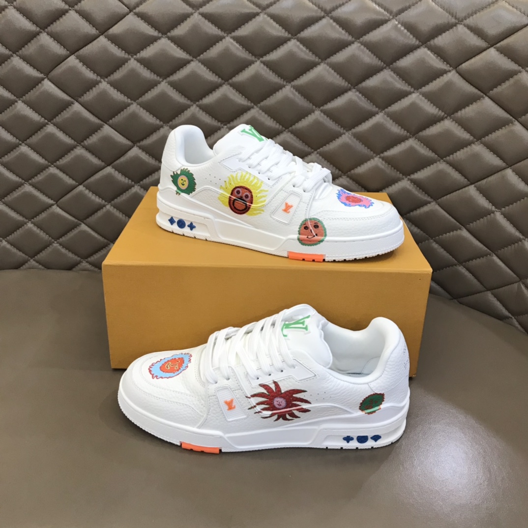 $229.10This LV Trainer is crafted from grained calfskin leather, paying homage to Virgil Abloh’s original classic design inspired by vintage baskets with vibrant colorways. The upper is adorned with rubber LV lettering and the Vuitton logo, while the Monogram floral pattern embellishes the technical rubber outsole. The original silhouette, designed by Virgil Abloh, showcases the inspiration of vintage baskets. Continuing the intricate upper design, the glued rubber outsole retains iconic elements, and the standard insole ensures continued comfort. Comes with original box and complete packaging!