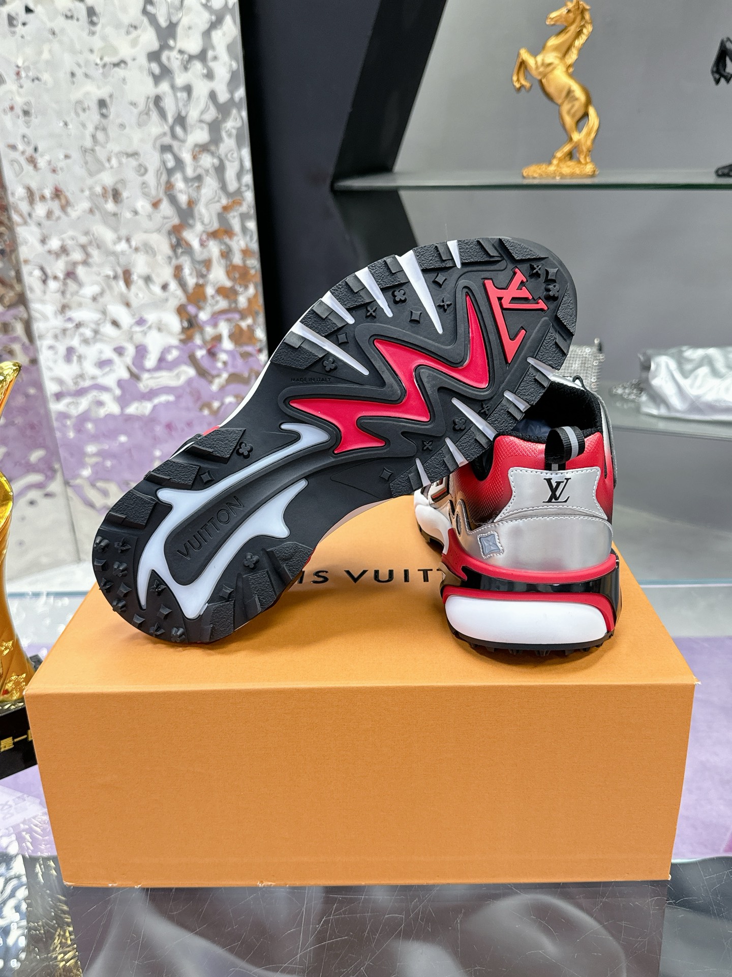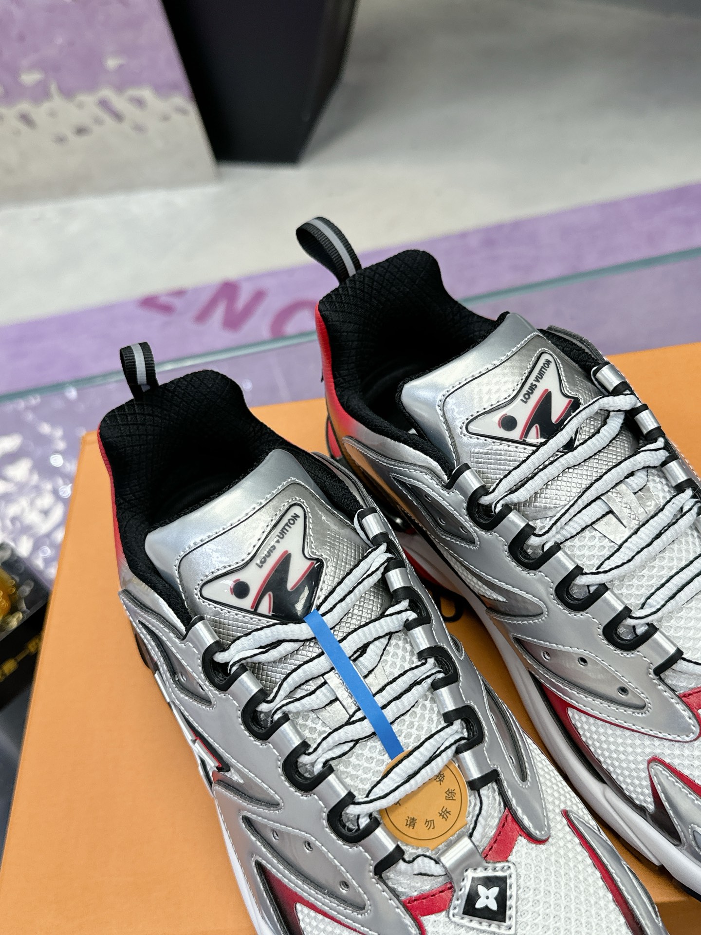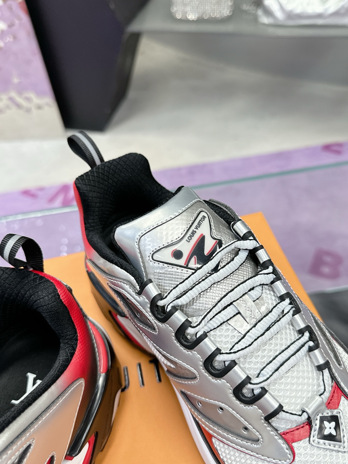 [LV Runner Tatic Sneakers]. This shoe is a cutting-edge interpretation of running shoes, combining functional materials such as mesh and metallic coatings to create a unique gradient silver effect.