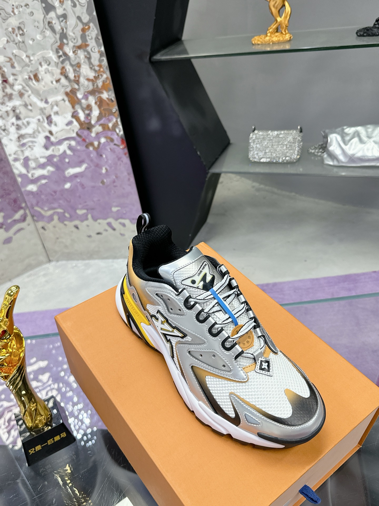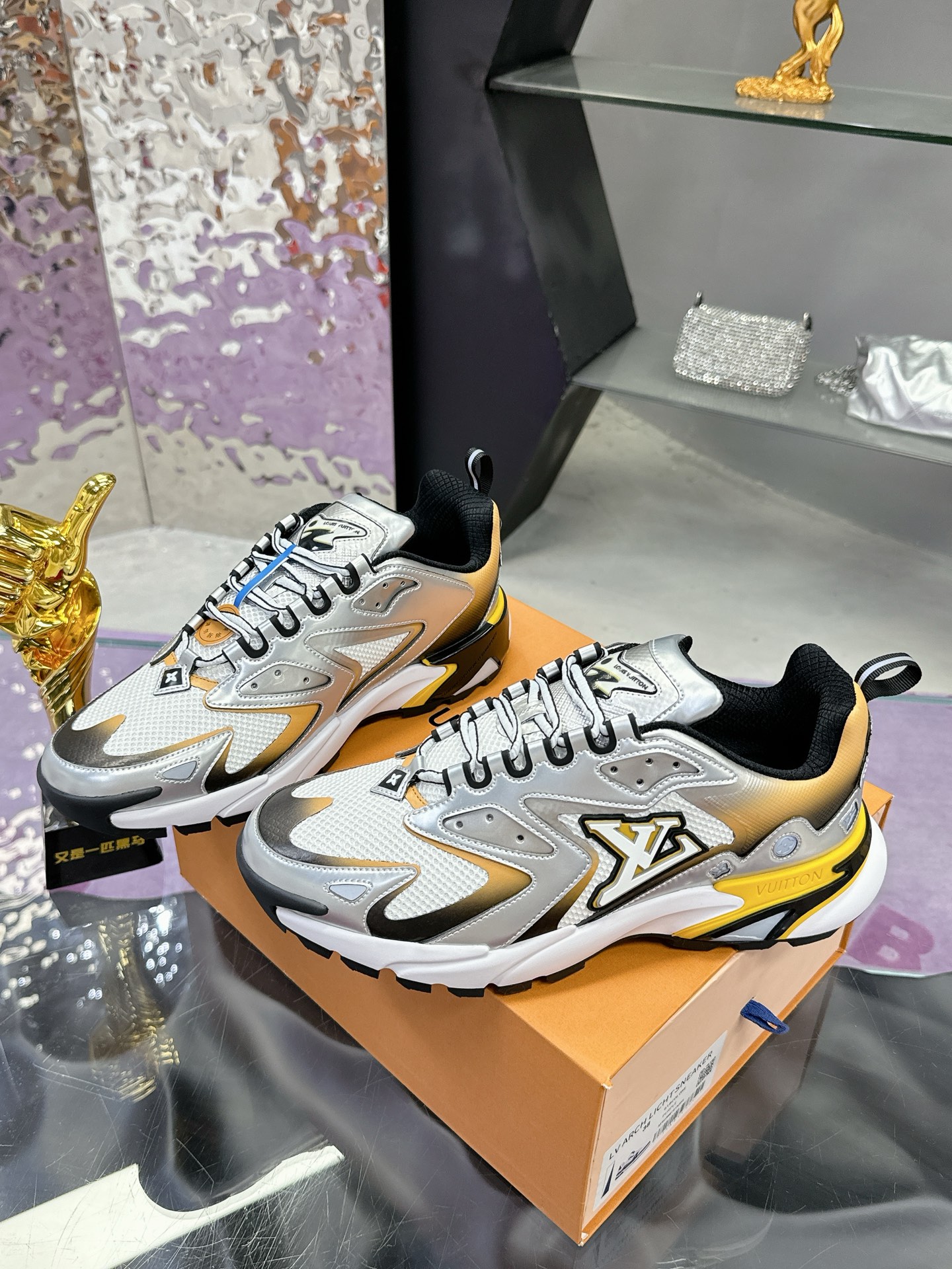[LV Runner Tatic Sneakers]. This shoe is a cutting-edge interpretation of running shoes, combining functional materials such as mesh and metallic coatings to create a unique gradient silver effect.
