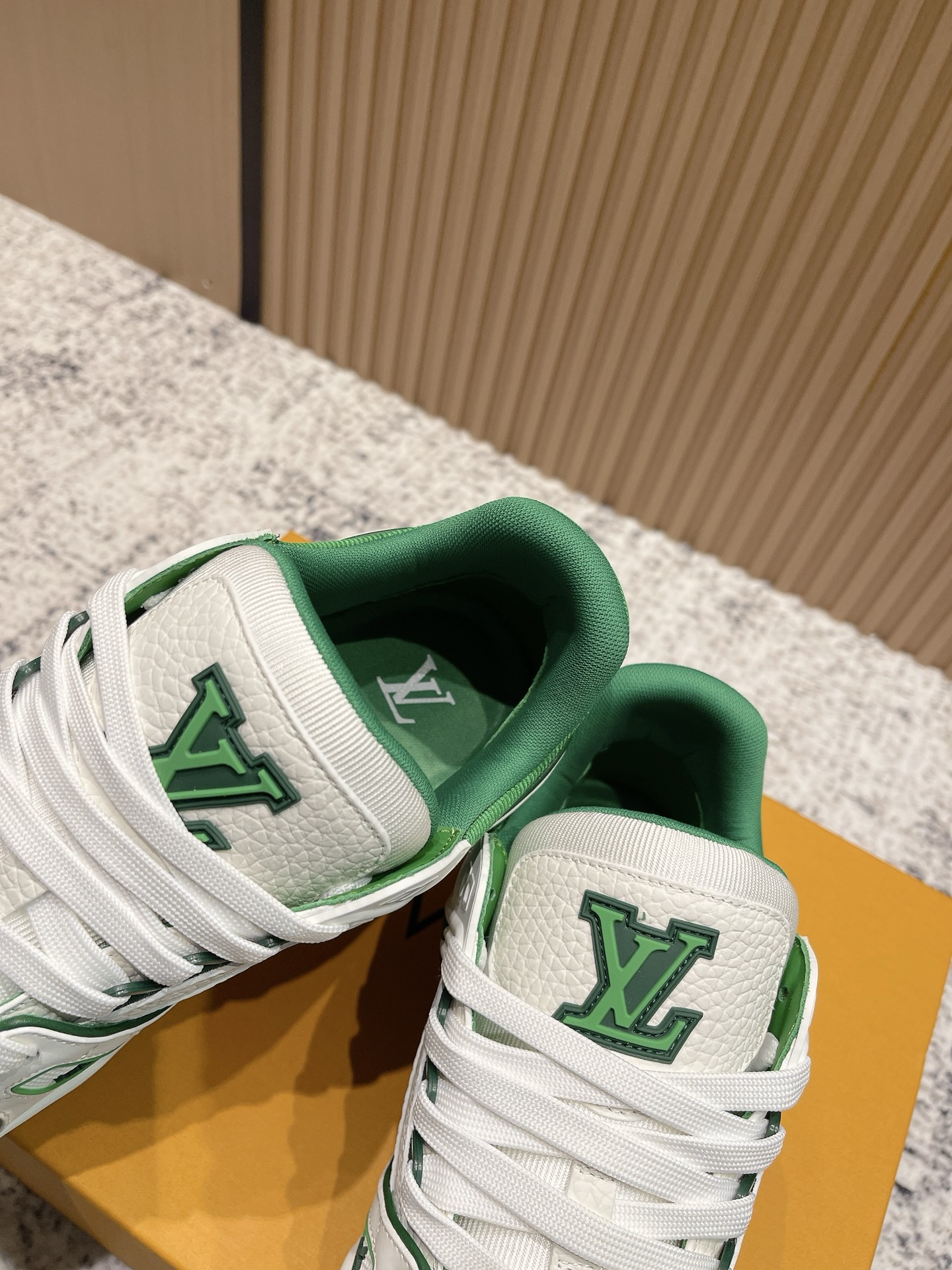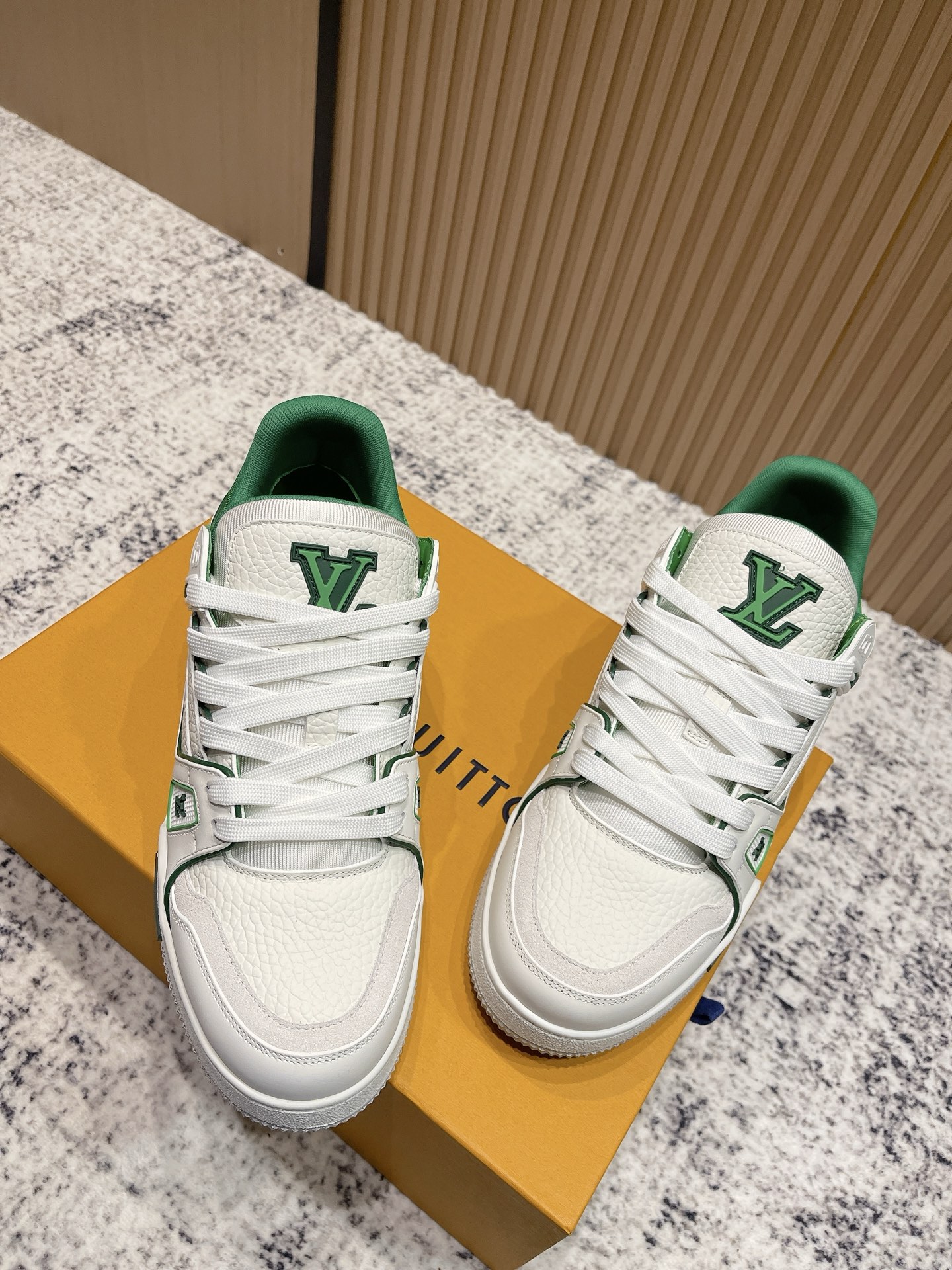 $234.83These LV Trainer sneakers are crafted from grained calfskin leather, paying homage to Virgil Abloh’s original classic design inspired by retro basketball shoes with vibrant colorways. The upper is adorned with rubber LV lettering and the Vuitton logo, while the outsole features a Monogram floral pattern.