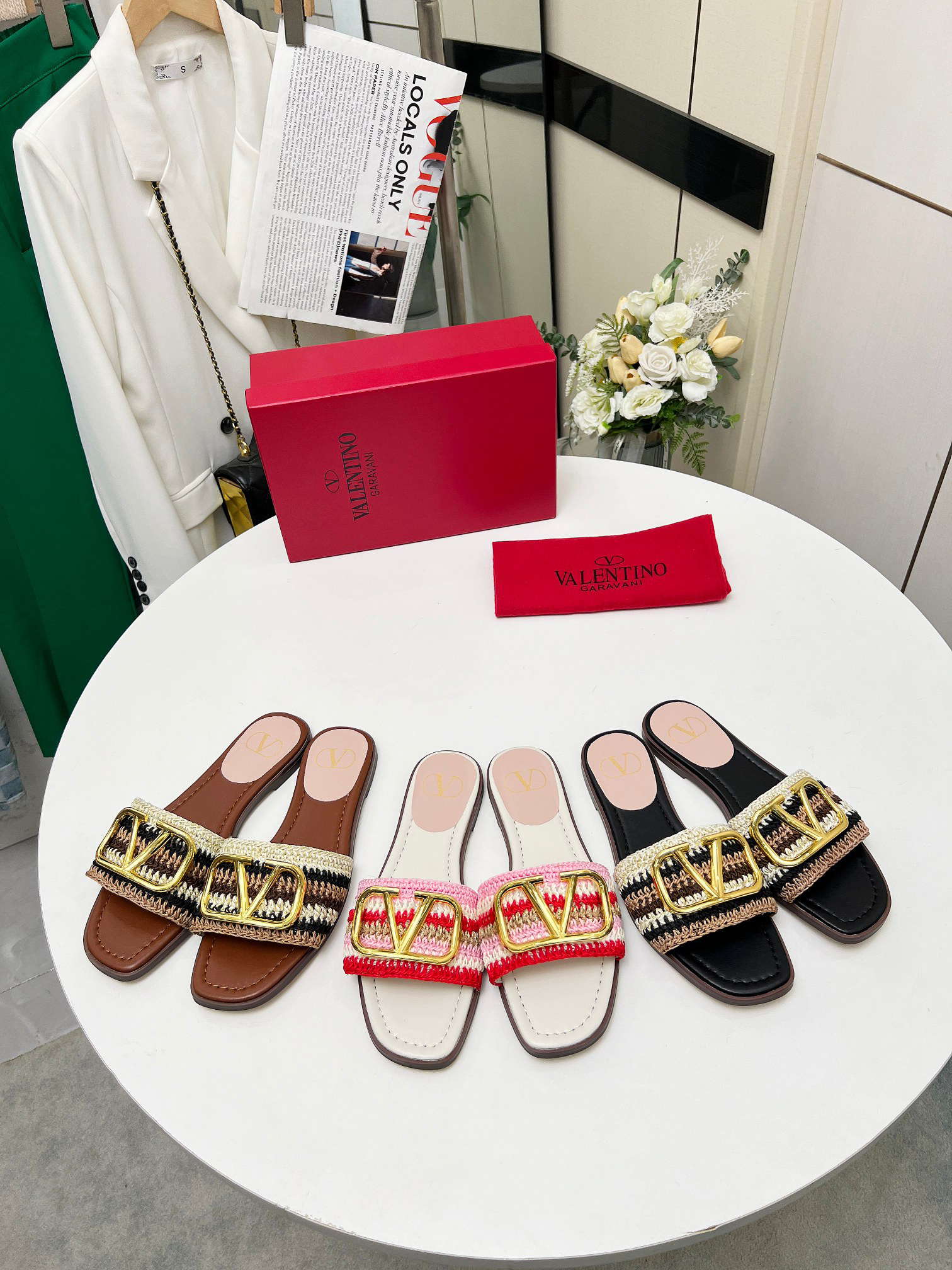 The shoes you see are the Valentino Garavani VLogo Signature Woven Raffia Slide Sandals. These sandals come in a variety of colors and styles, all featuring a woven design and the iconic VLogo hardware.