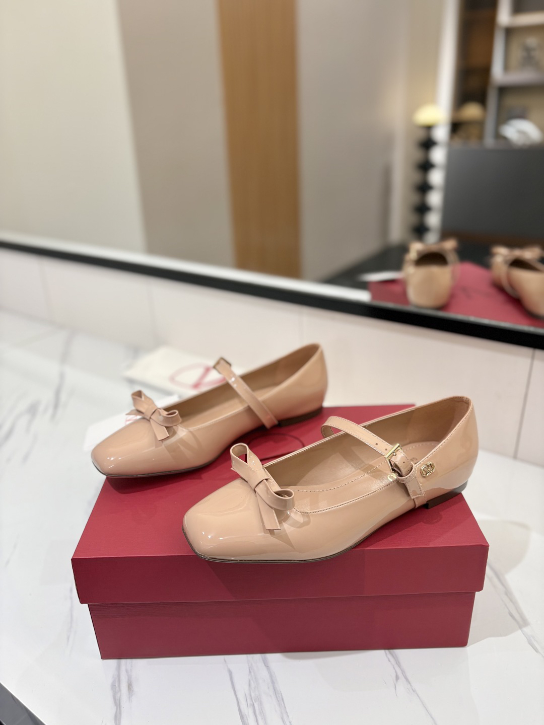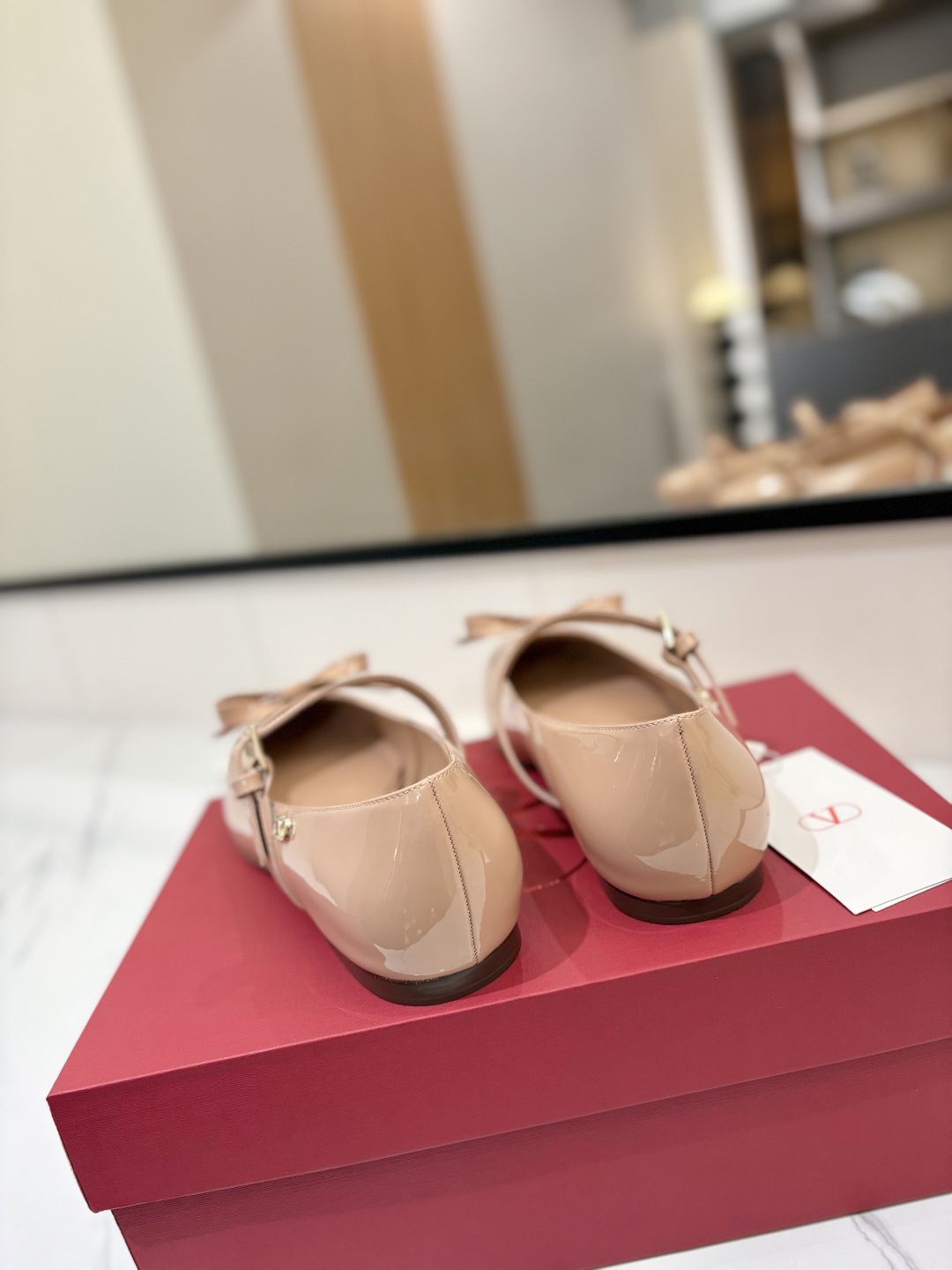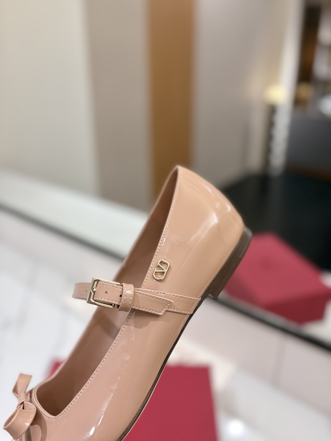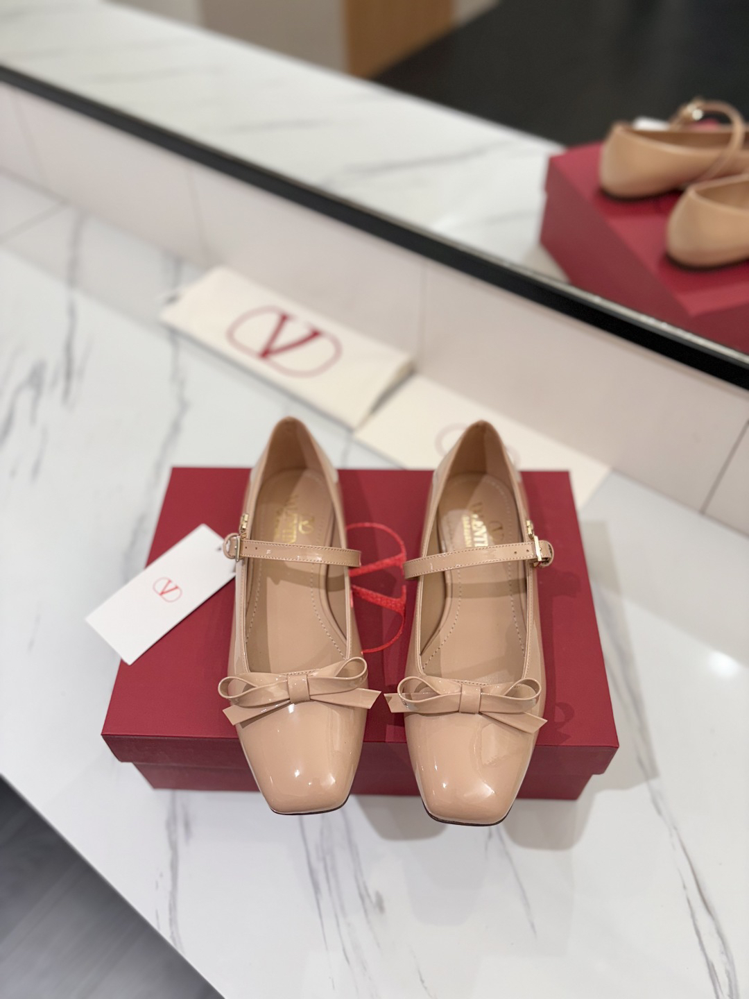 The shoes you see are a style from Valentino Garavani called “Bow-Embellished Patent-Leather Mary Jane Ballet Flats”.