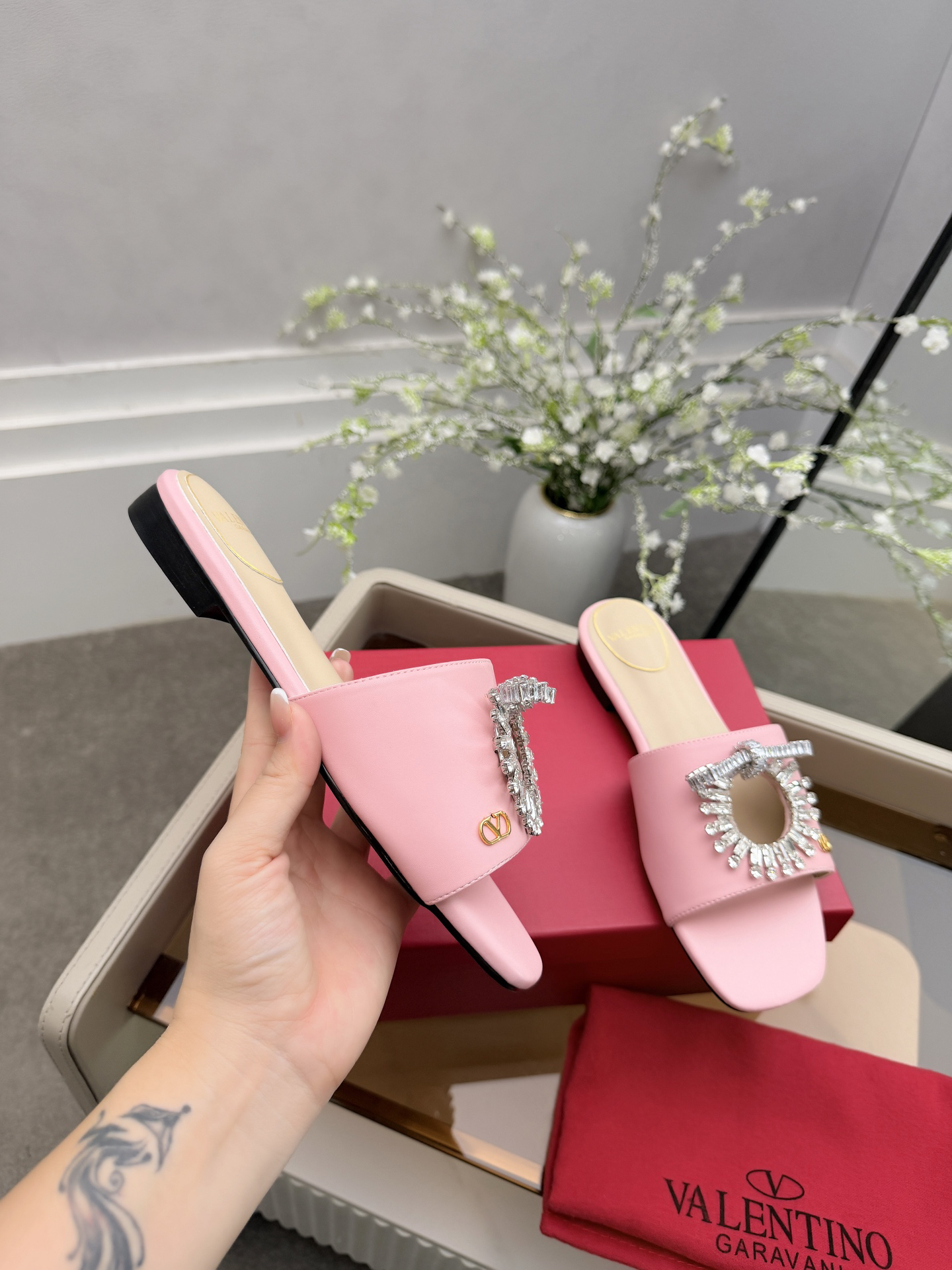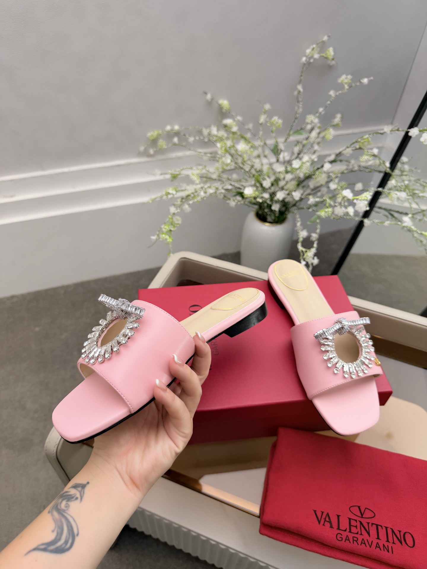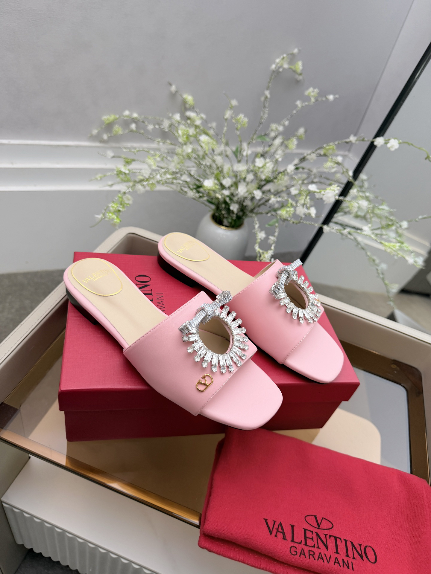 Design: The shoes are made of smooth pink calfskin, with the most striking feature being the openwork design inlaid with sparkling crystals on the upper. They are flat mule sandals (slide sandals) for easy slip-on.