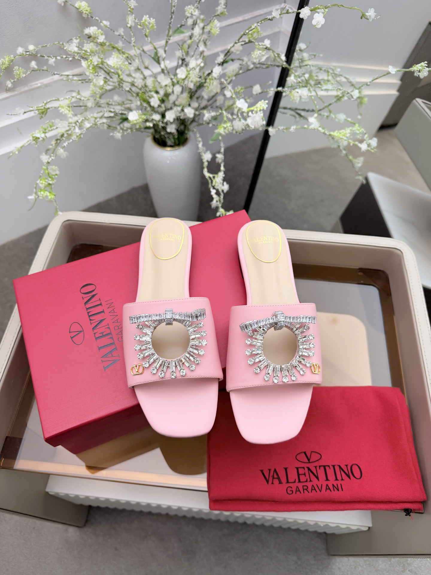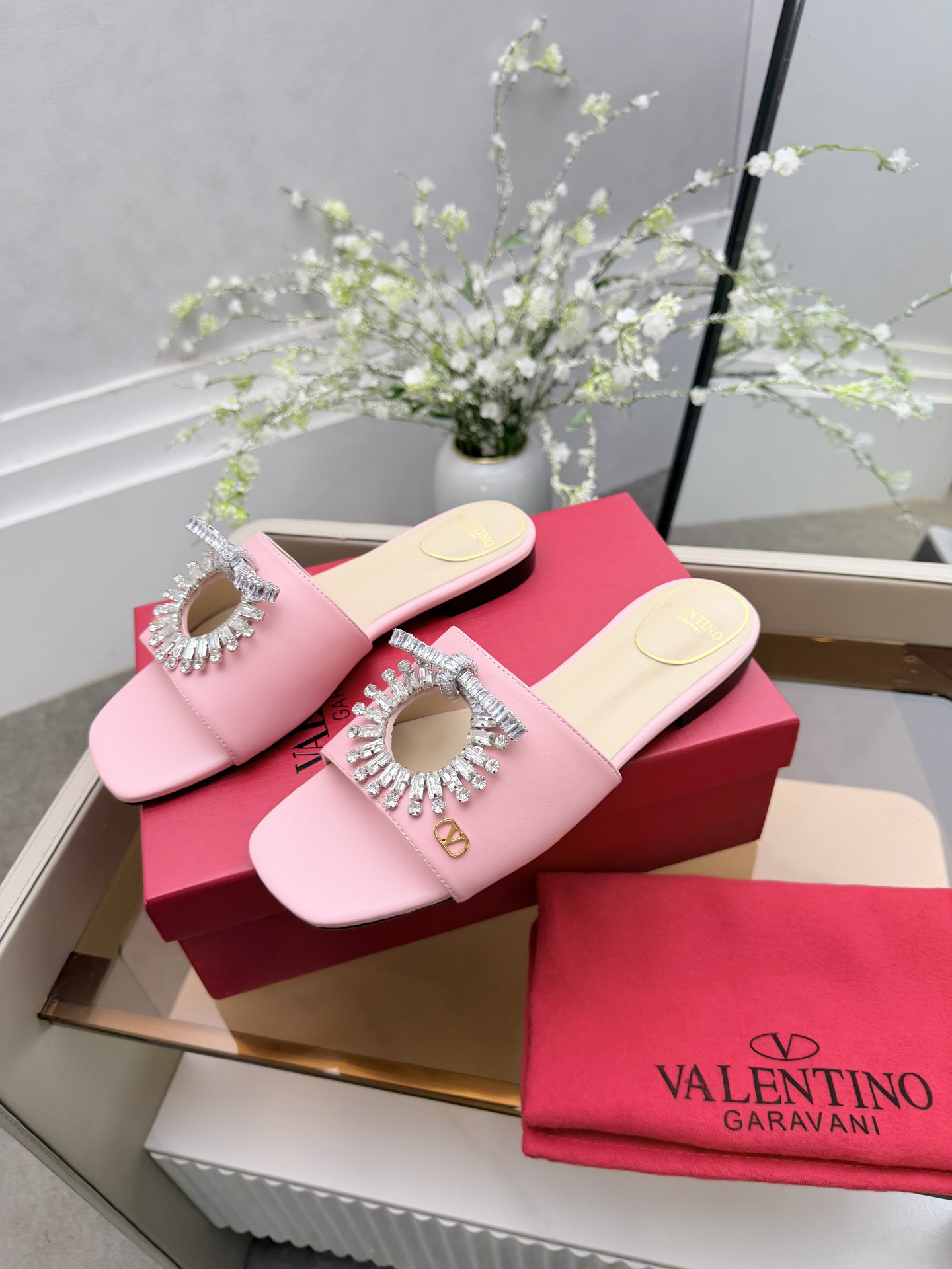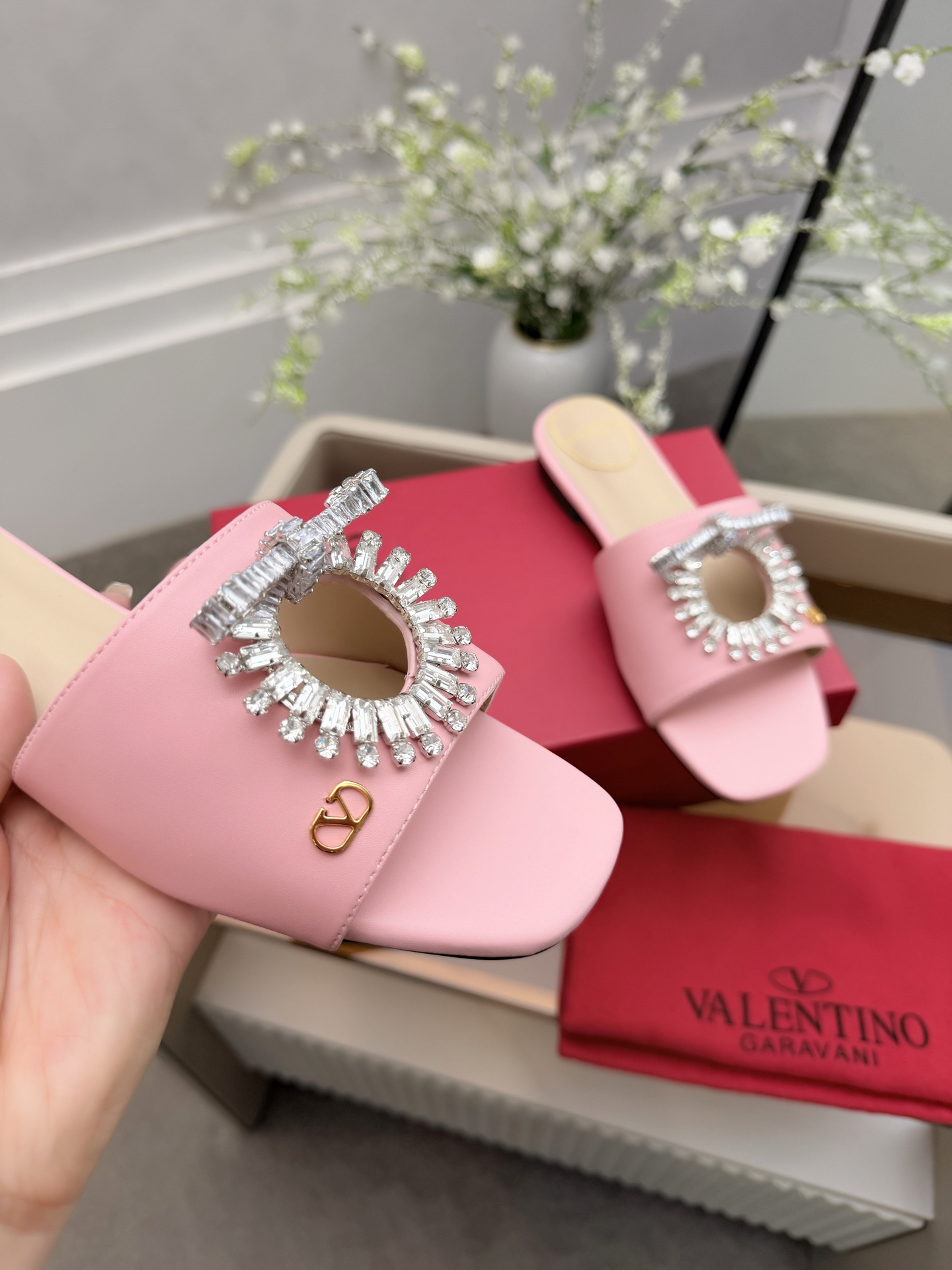 Design: The shoes are made of smooth pink calfskin, with the most striking feature being the openwork design inlaid with sparkling crystals on the upper. They are flat mule sandals (slide sandals) for easy slip-on.