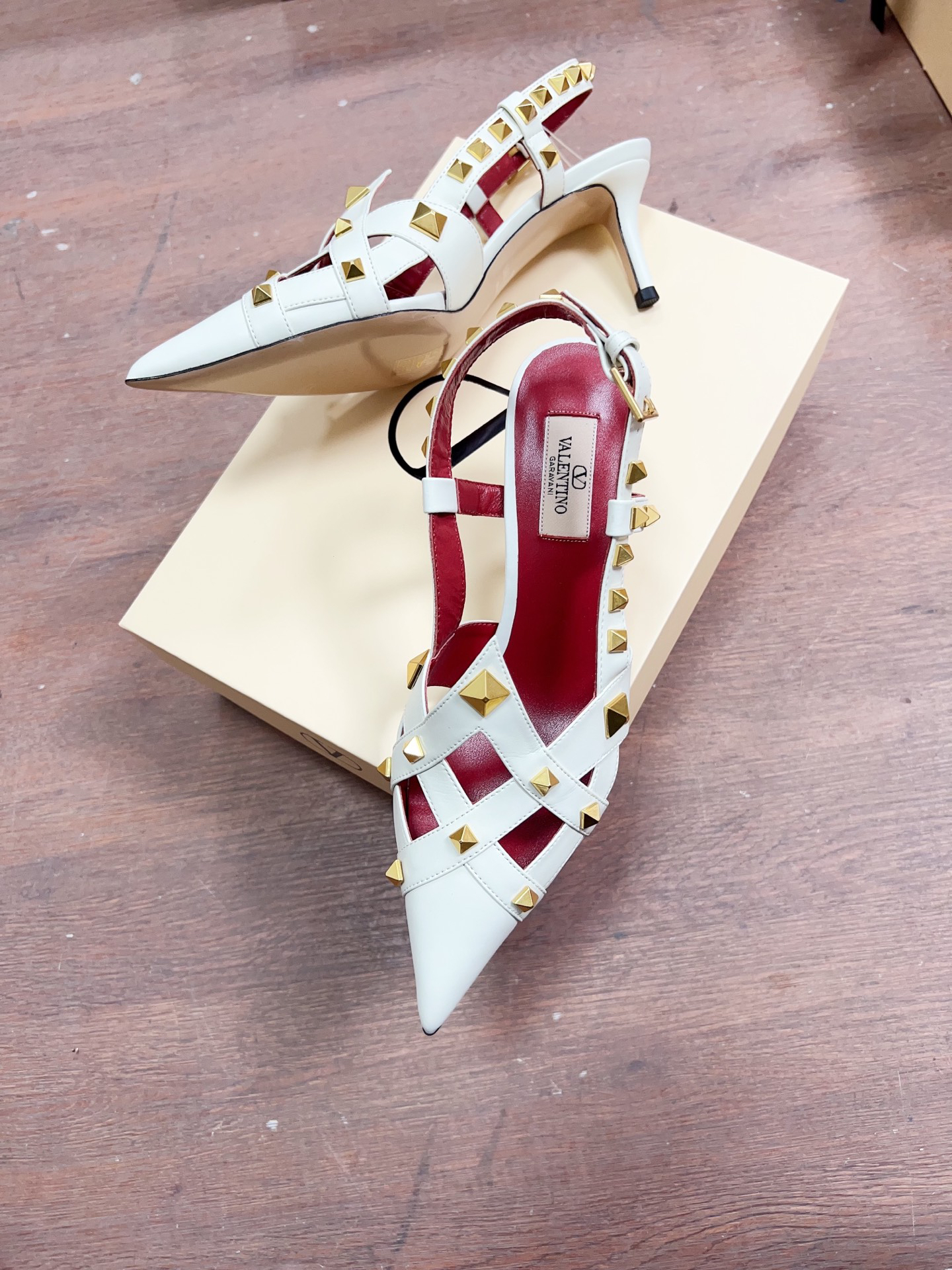 These shoes are cage-style high heels from Valentino Garavani’s Studdy collection.