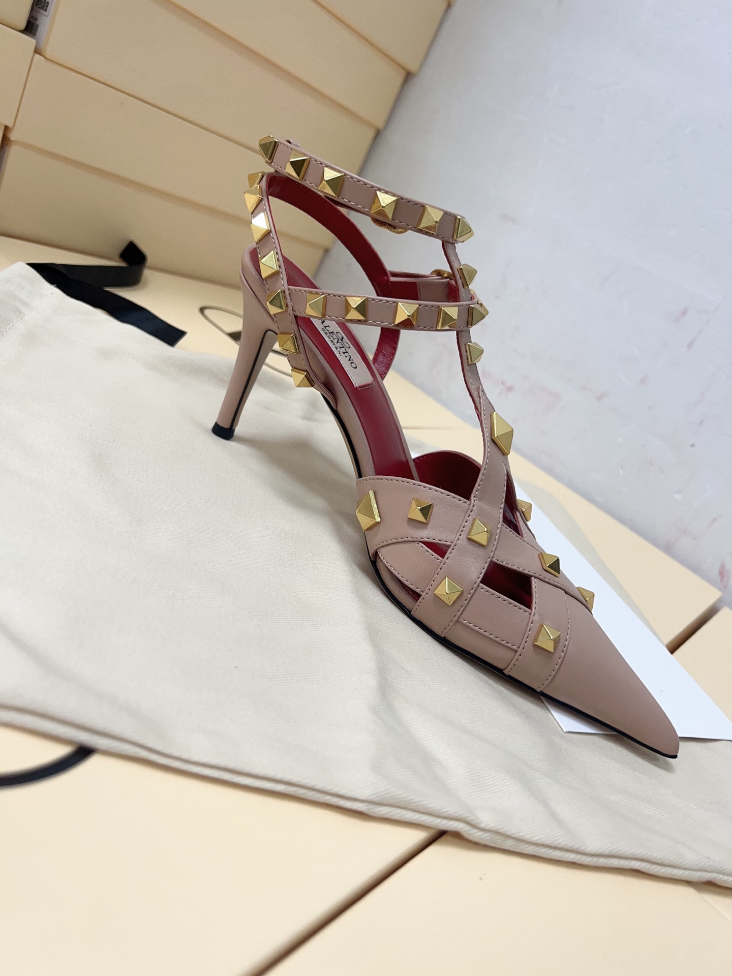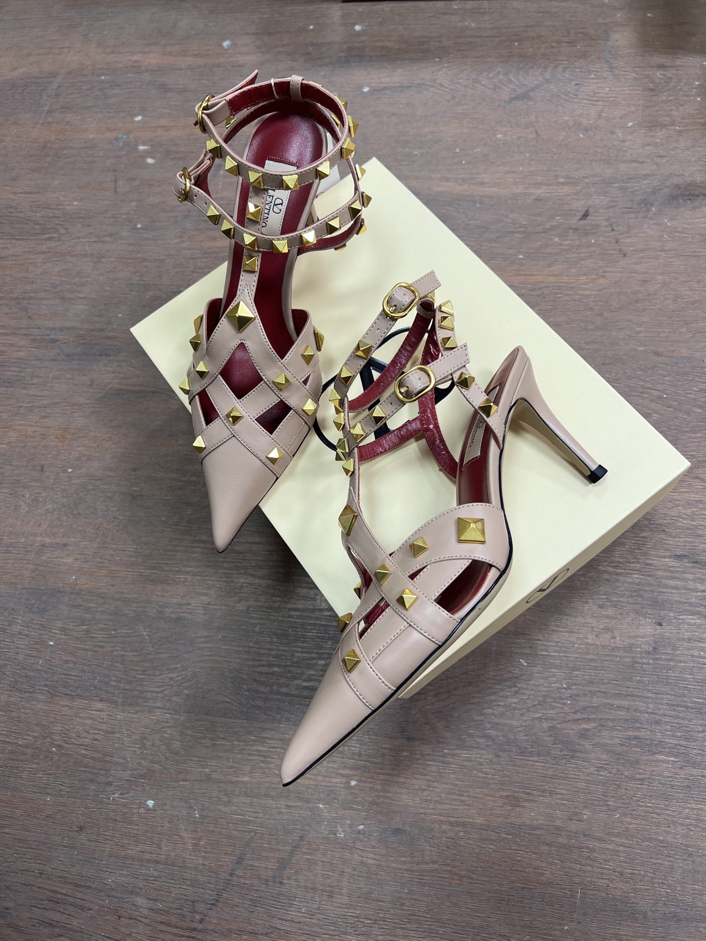 These shoes are cage-style high heels from Valentino Garavani’s Studdy collection.
