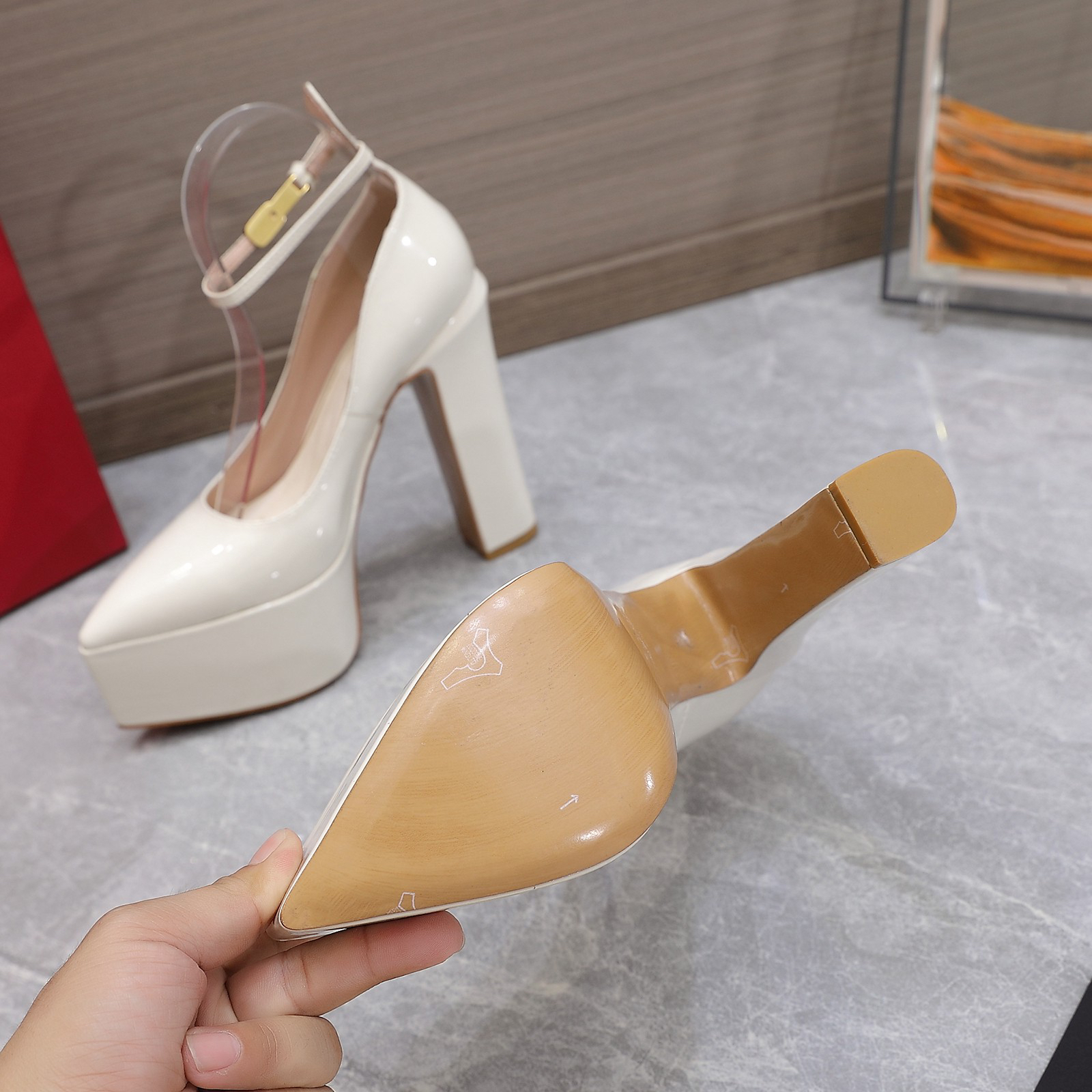 Features: This shoe is known for its extremely high, chunky heel and thick platform sole. The heel height is typically around 155 mm (6 inches), and the platform height is approximately 55 mm (2 inches). The ankle strap features the signature gold V Logo buckle, adding a retro yet luxurious touch to this shoe.