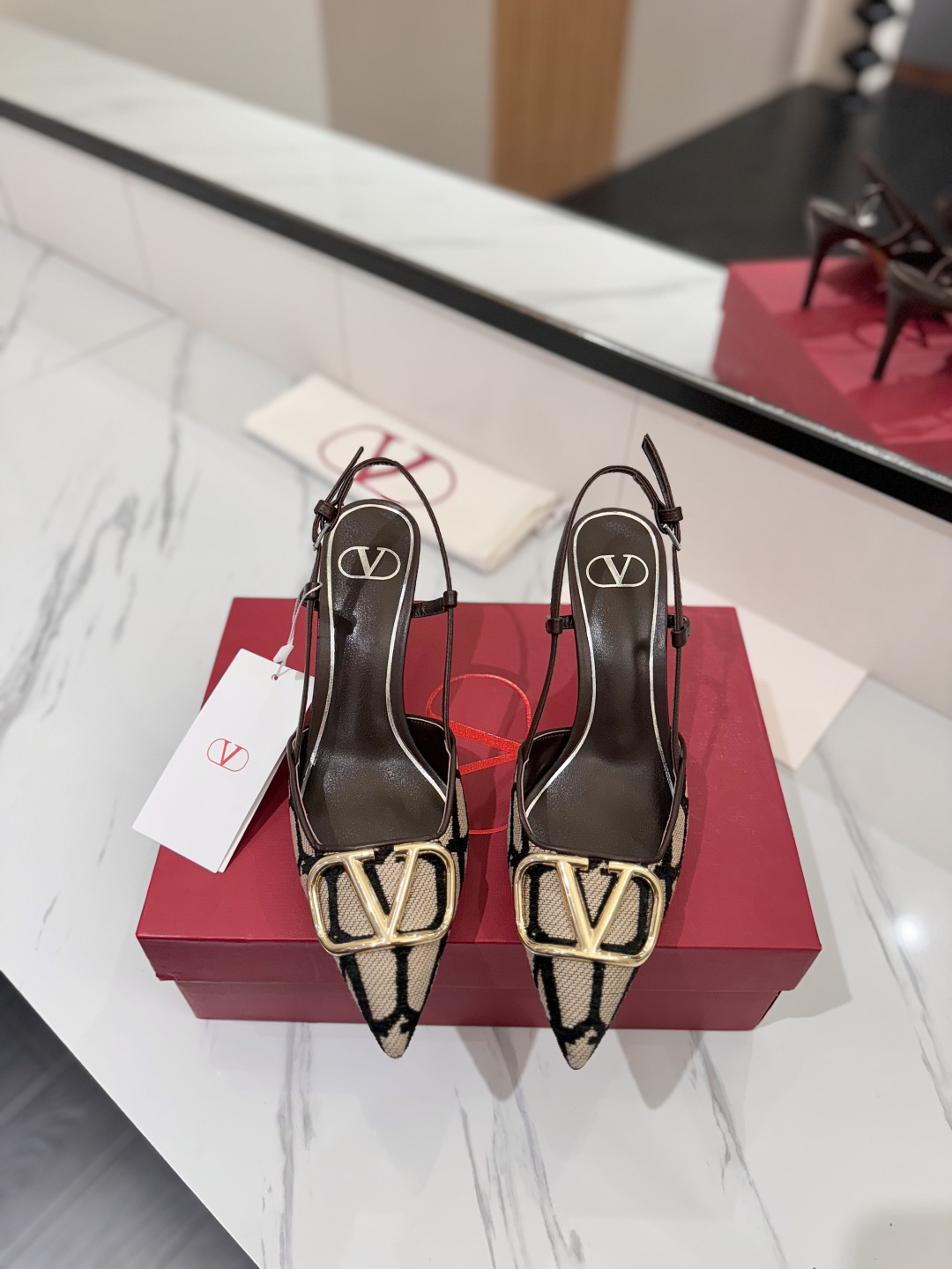 Style: Pointed-toe slingback pumps with the brand’s iconic VLogo pattern on the upper.