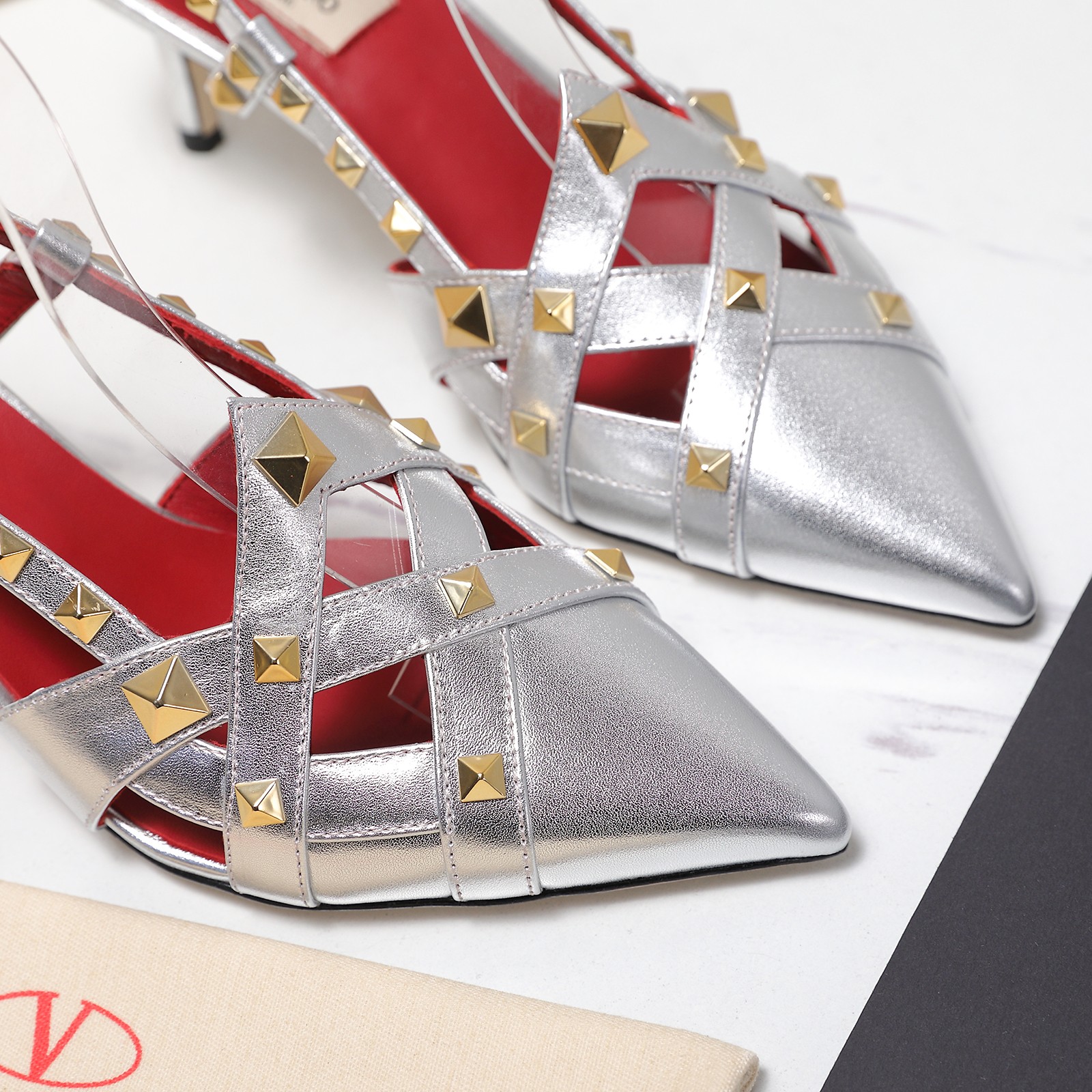 Style: Pointed-toe slingback heels with a T-strap design and adorned with signature rivets. This cage-like design and rivet details pay homage to the bugnatos (decorations) on the exterior walls of Roman palaces.