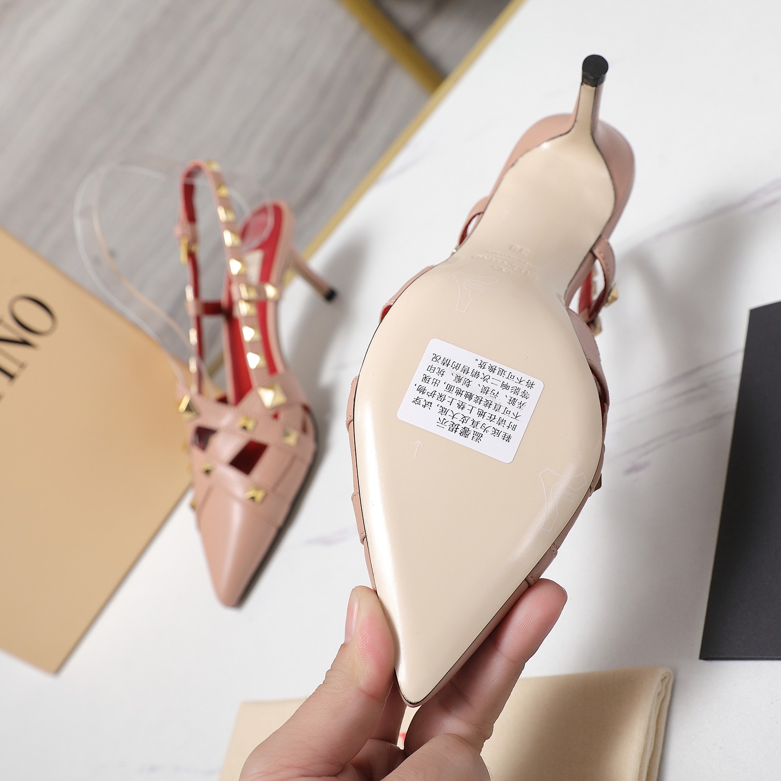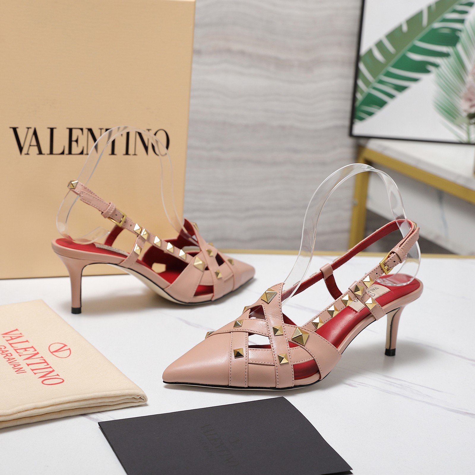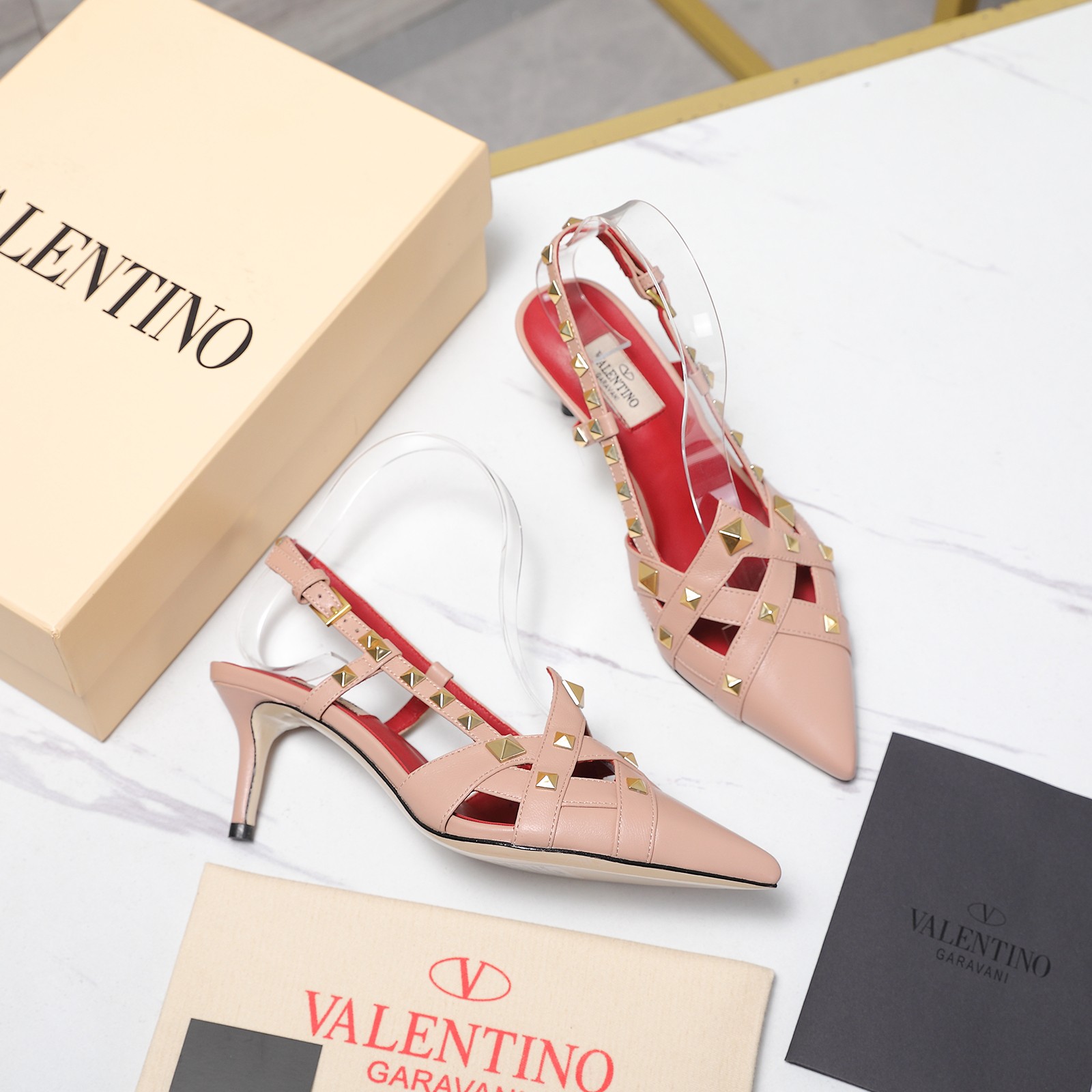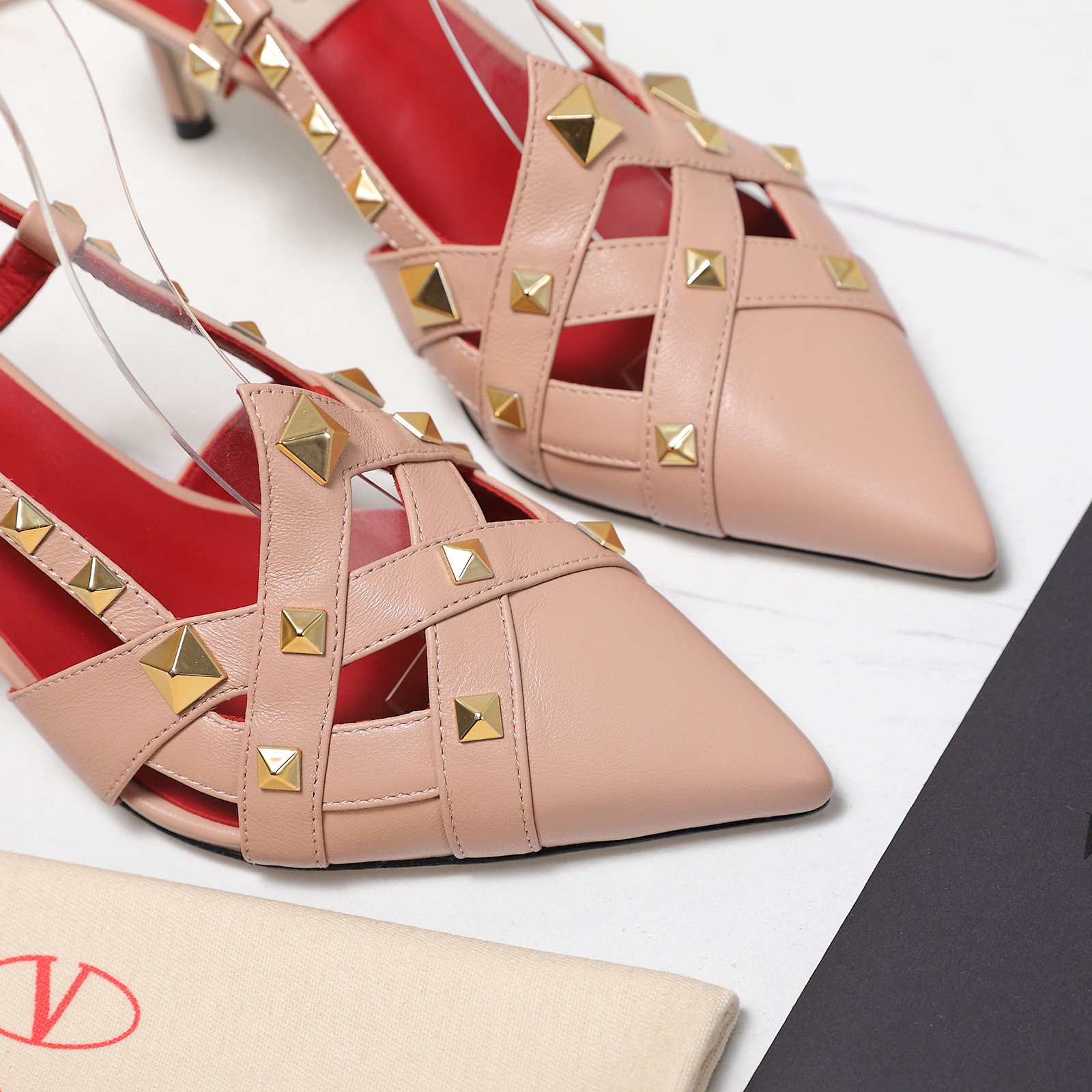 Style: Pointed-toe slingback heels with a T-strap design and adorned with signature rivets. This cage-like design and rivet details pay homage to the bugnatos (decorations) on the exterior walls of Roman palaces.