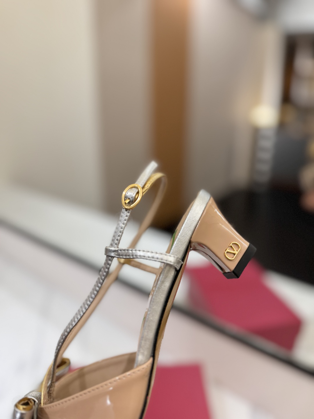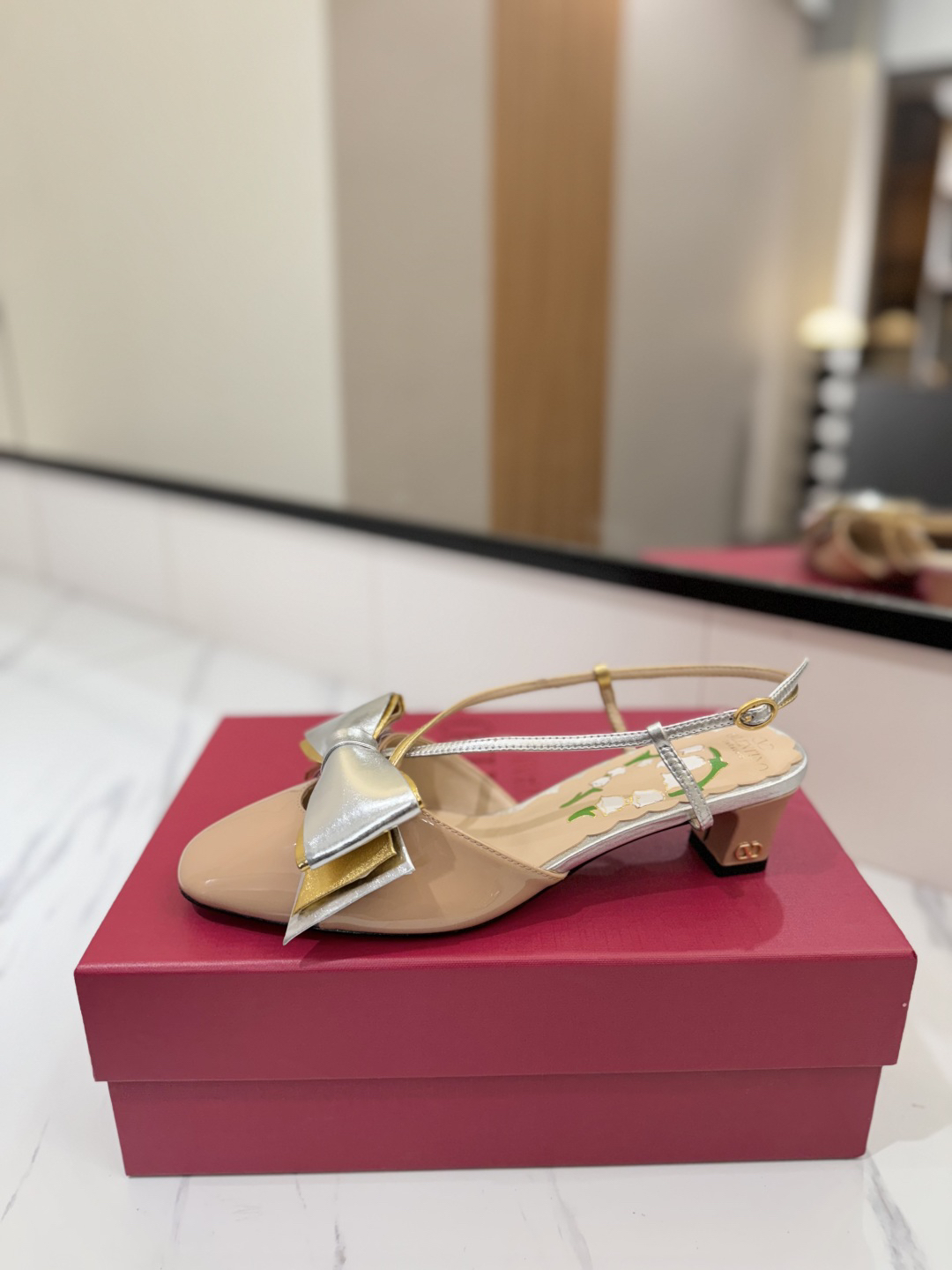 Design: The shoes feature a nude patent leather upper adorned with a striking silver metallic bow. They have a pointed toe and an adjustable heel strap with a sturdy chunky heel. The insole may be printed with a floral pattern.