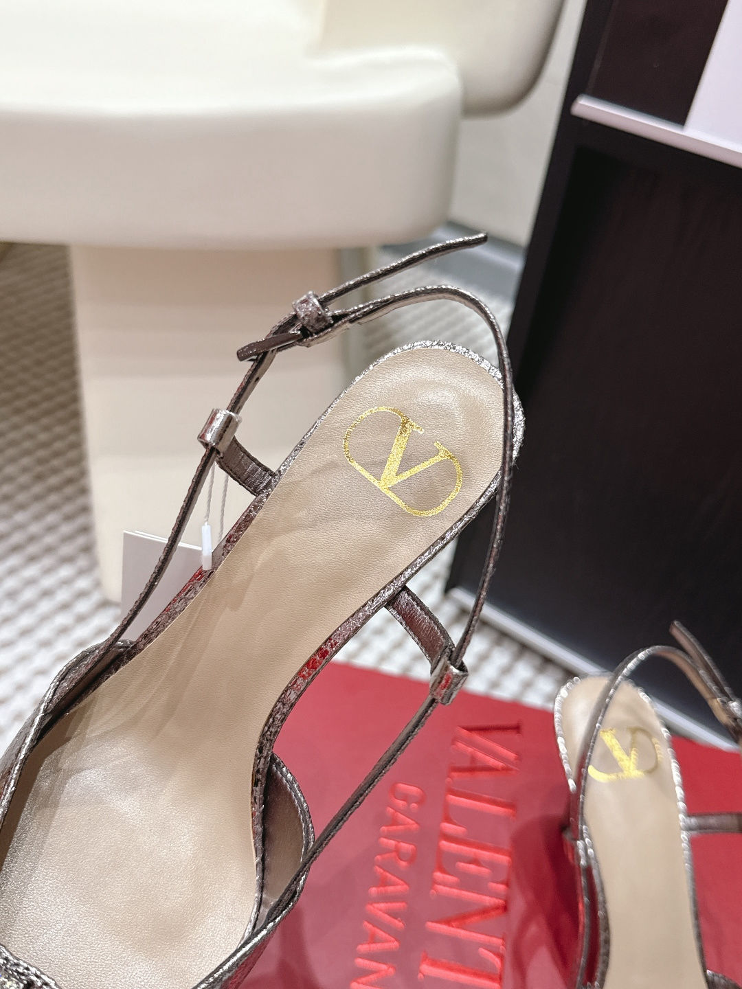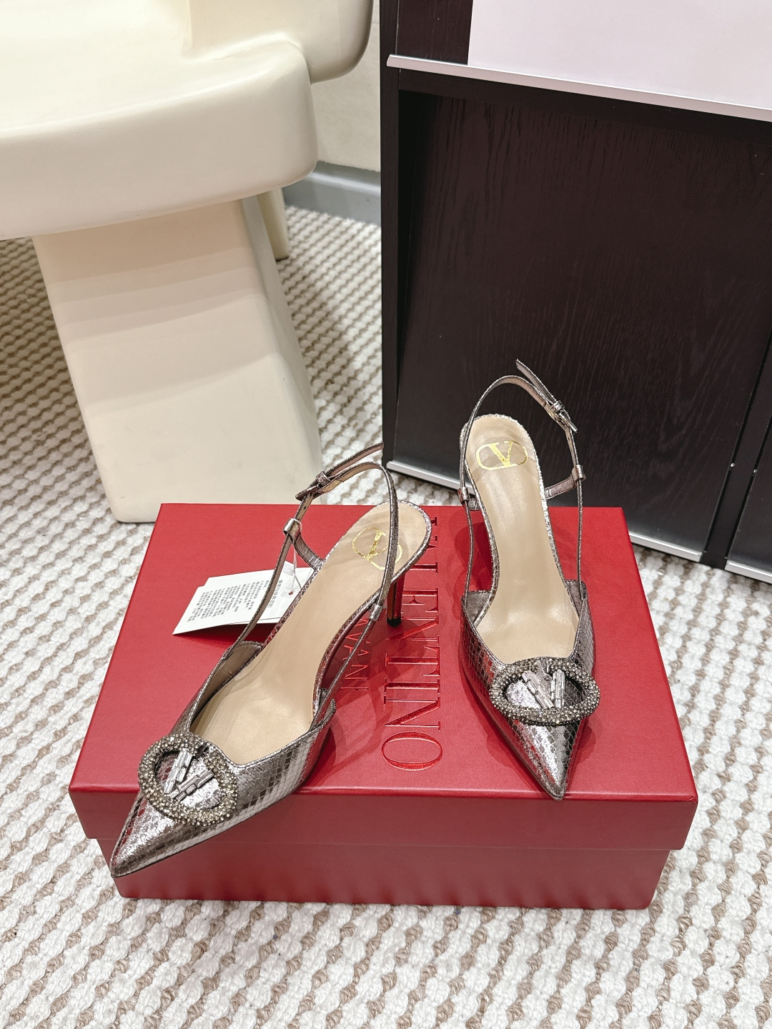 Features: The upper is adorned with an oversized VLogo Signature accessory and inlaid with crystal or sequin details. Features a slender stiletto heel and an adjustable ankle strap.