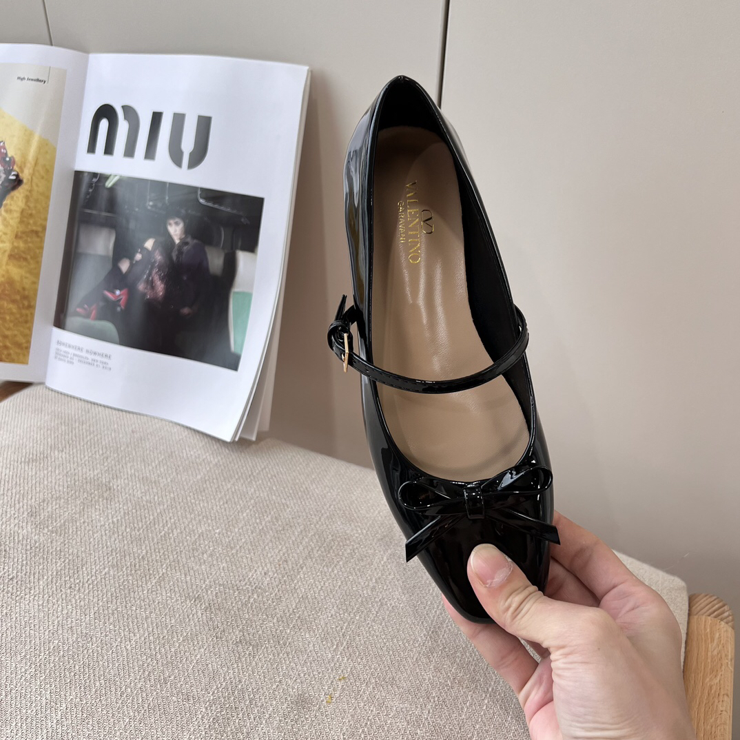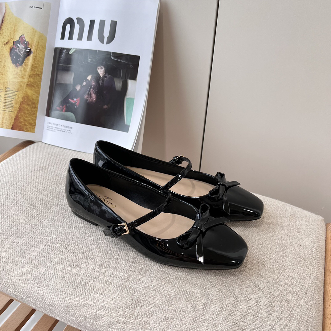 The shoes you see are Valentino Garavani Romance Bow Patent Leather Mary Jane Flats. These shoes are popular for their sweet and elegant design.