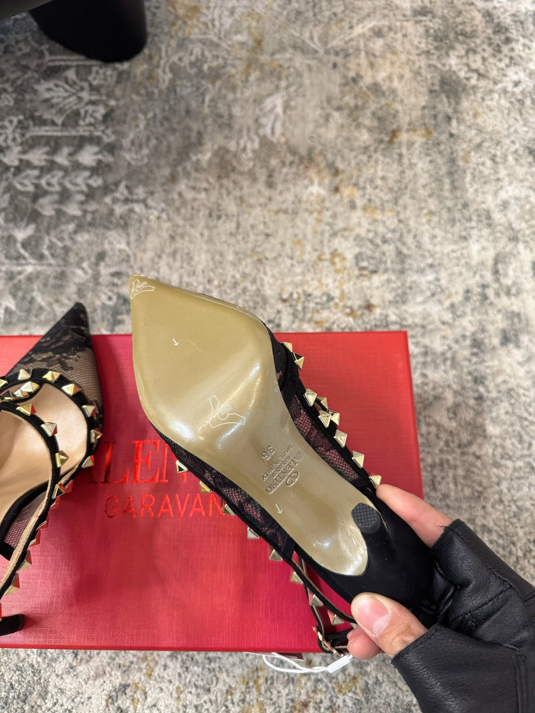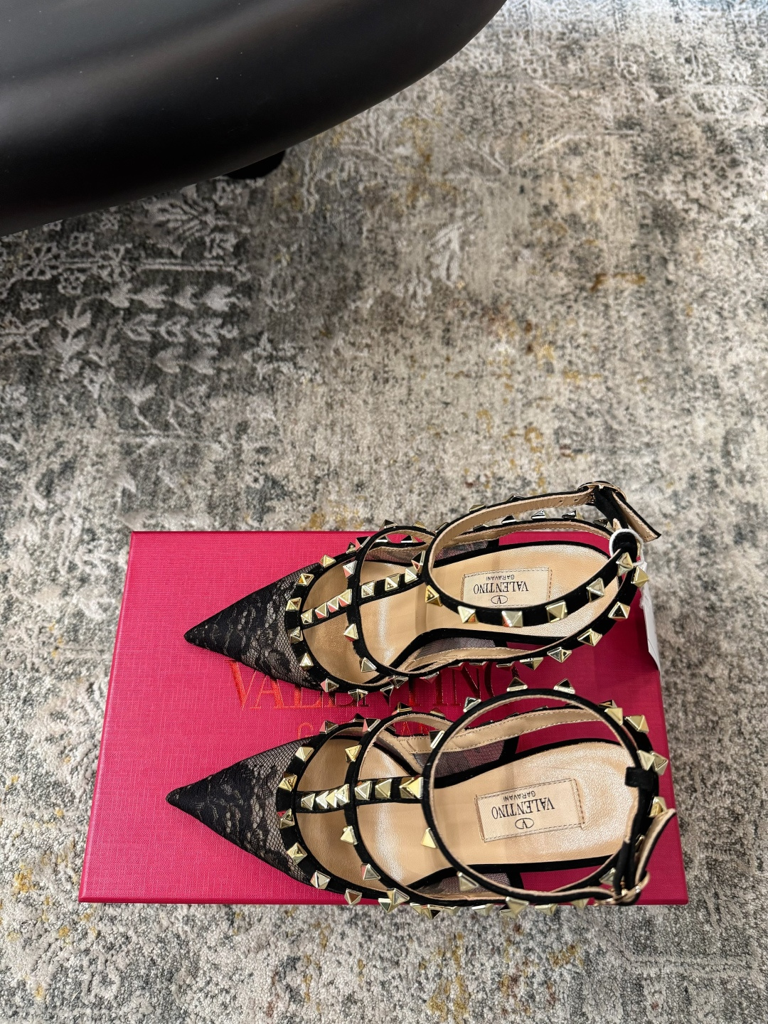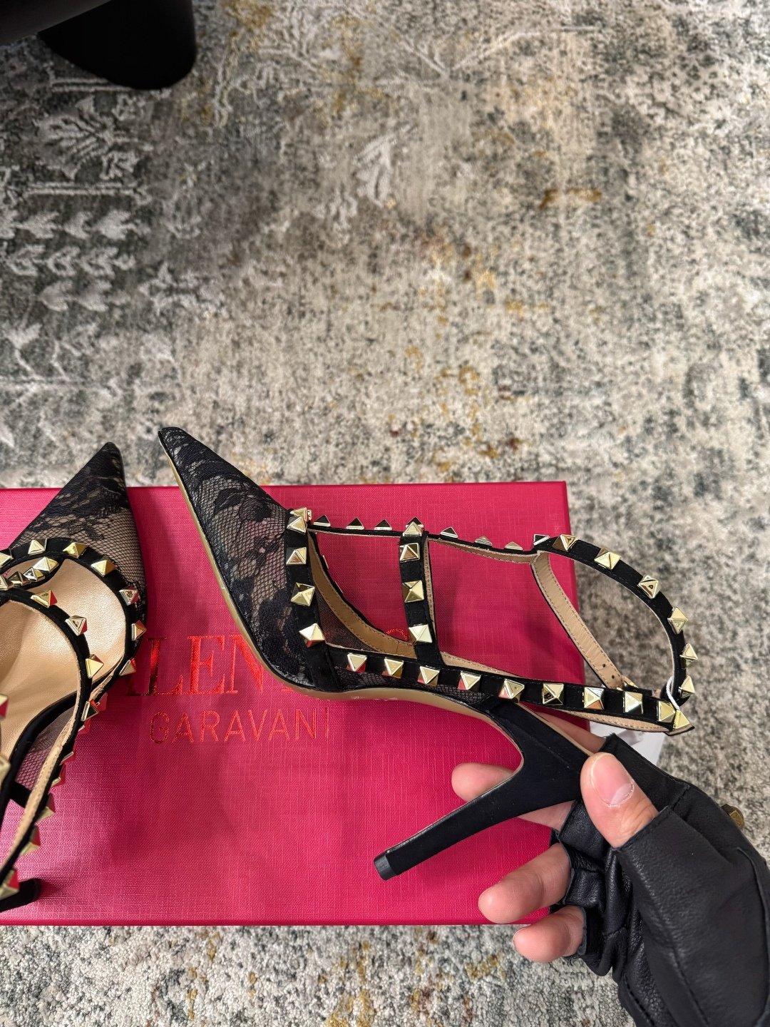 Design: The shoe is made of black floral lace. It features a pointed toe, a cage-like strap structure, and leather trim adorned with signature gold-toned pyramid-shaped studs. The ankle strap has an adjustable buckle.