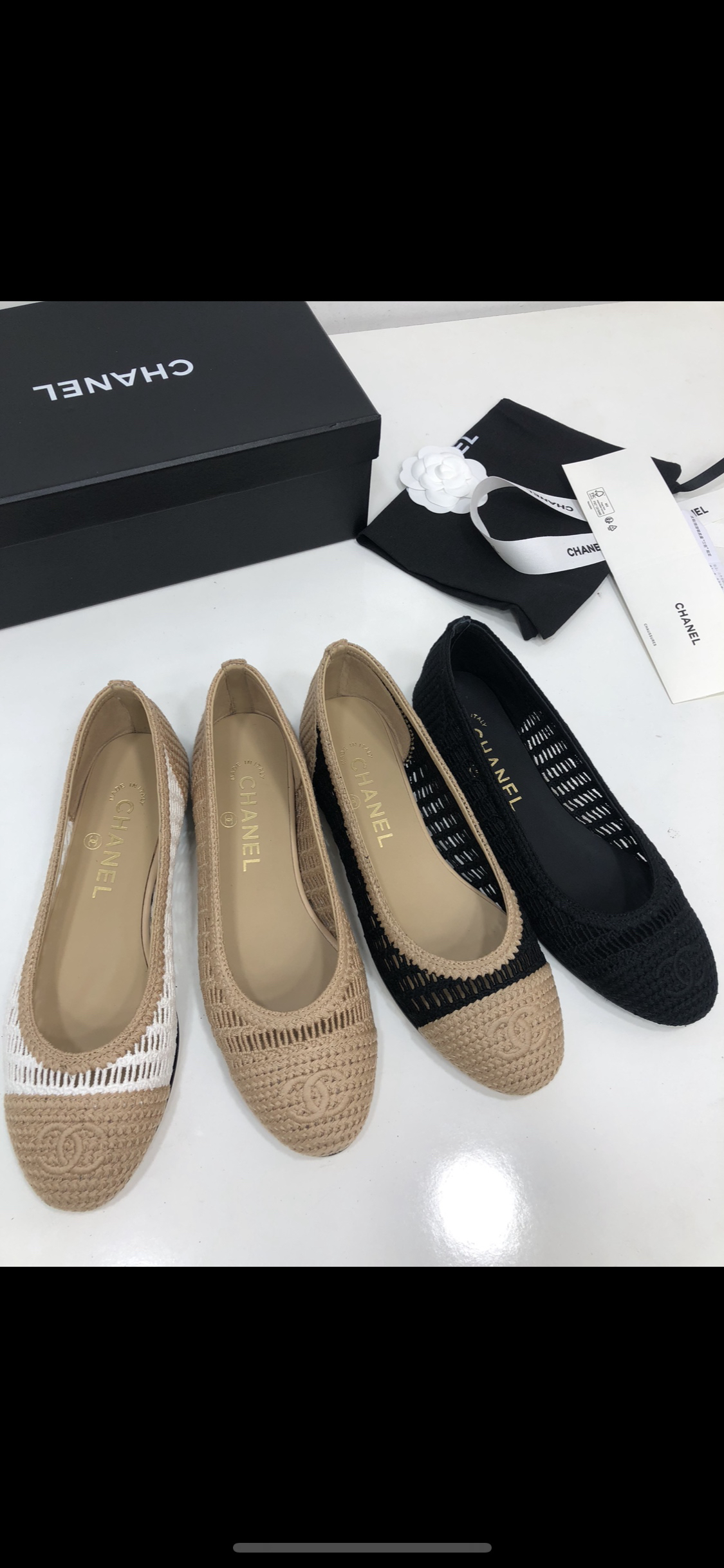 Design Elements: Features a beige and white color-blocked woven material, with openwork details on the upper. The toe features a 3D double-C logo, and the low-heeled, flat design balances comfort and style.
