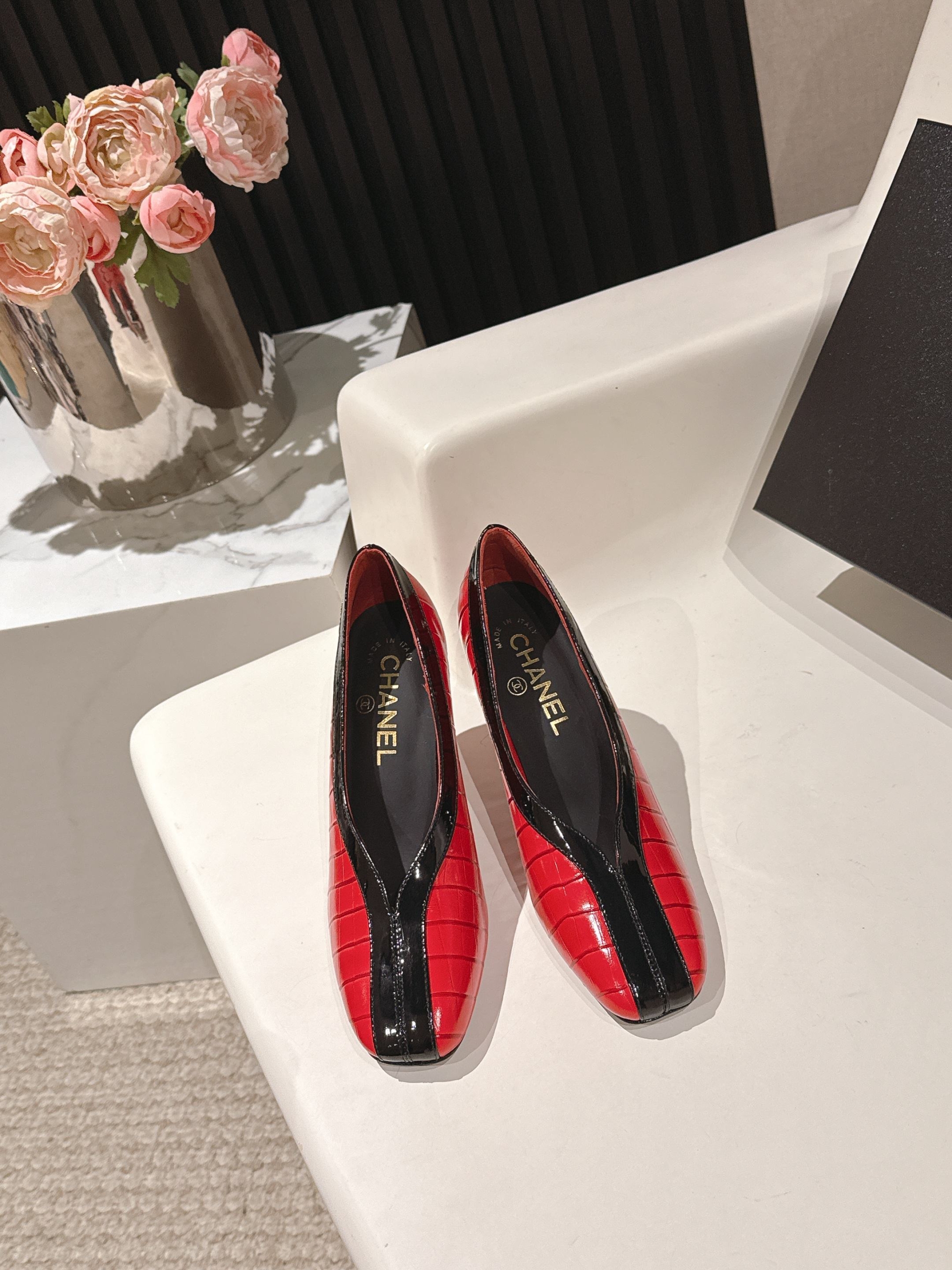 A collection of Chanel-style color-blocked flat shoes
