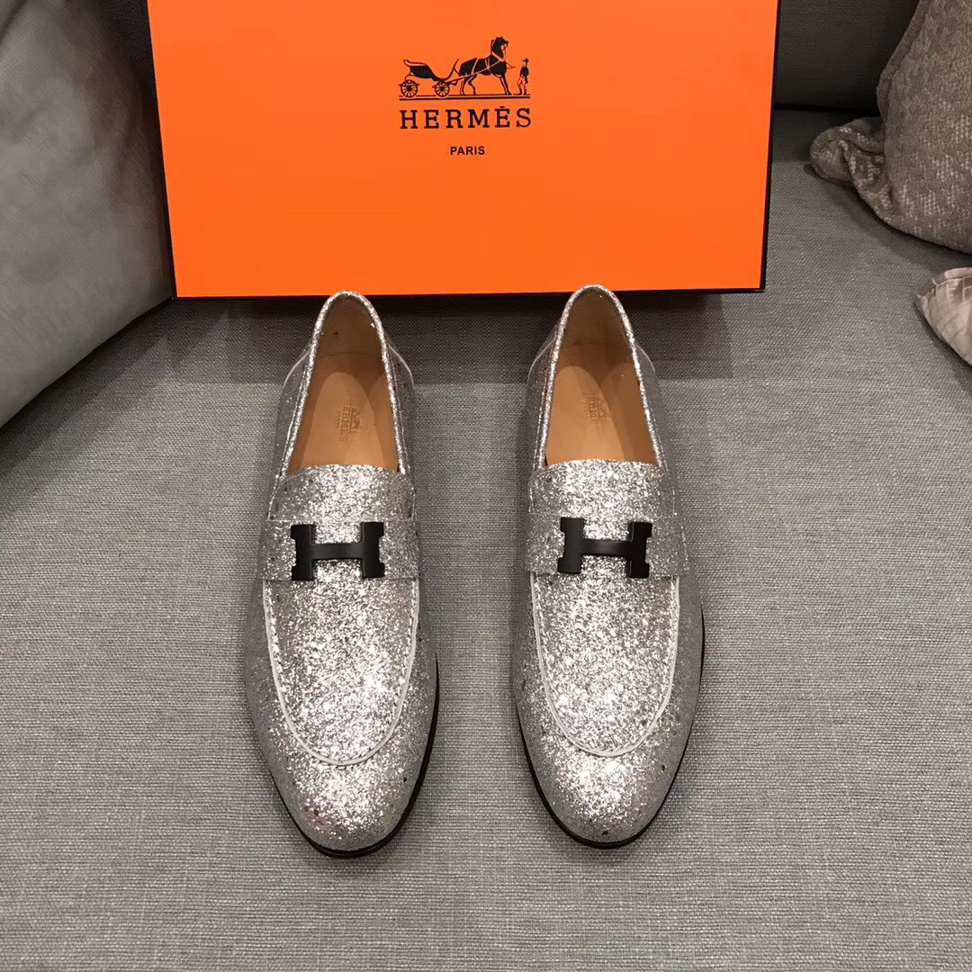 Features: These shoes are renowned for their classic “H” logo buckle and comfortable, elegant design. The shimmering material adds a modern touch and unique charm.