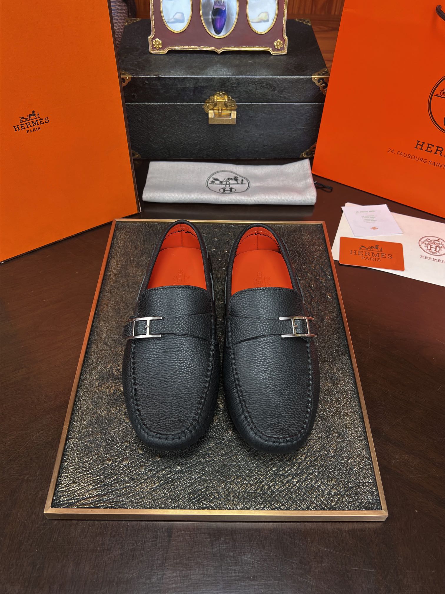 $297.26Hermès men’s high-end footwear, featuring an imported split calfskin upper, water-dyed calfskin lining, and genuine leather outsole.