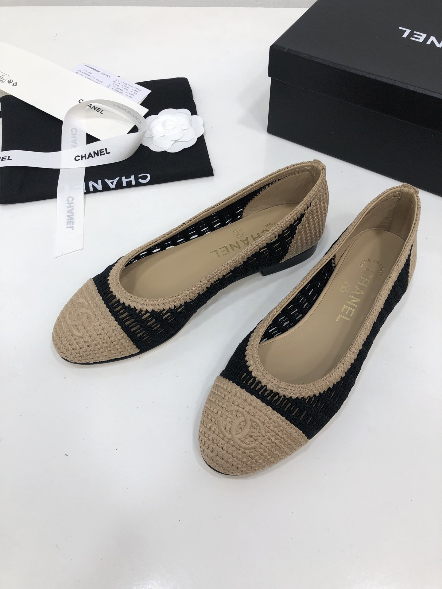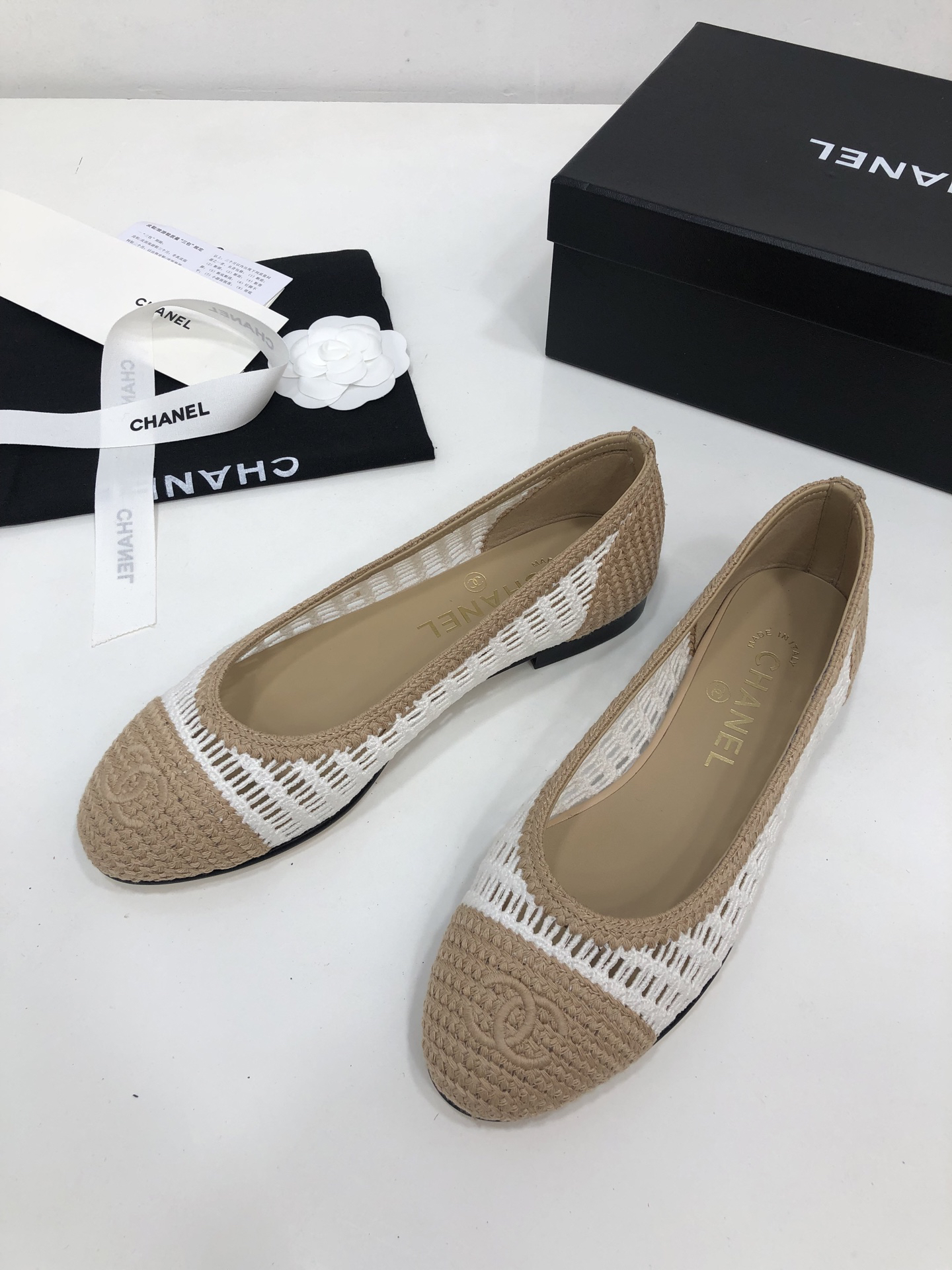 $143.20Design Elements: Made with beige woven material, the upper incorporates perforated details (enhancing breathability), and features a 3D double-C logo on the toe (a signature brand element). Paired with a low-heeled flat sole, it balances comfort and style.